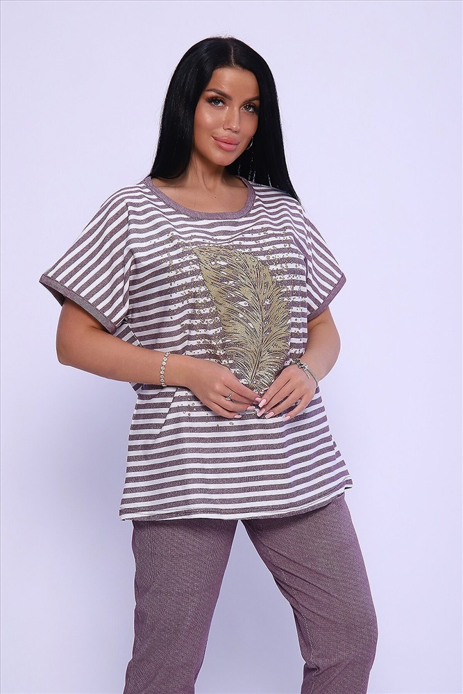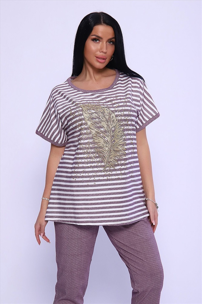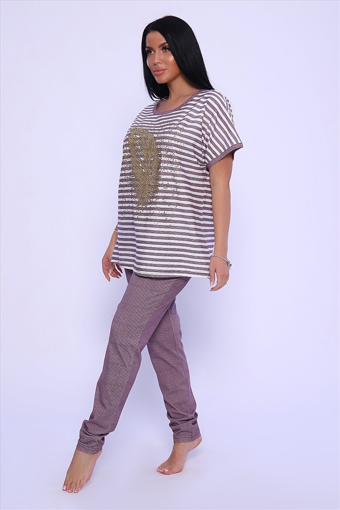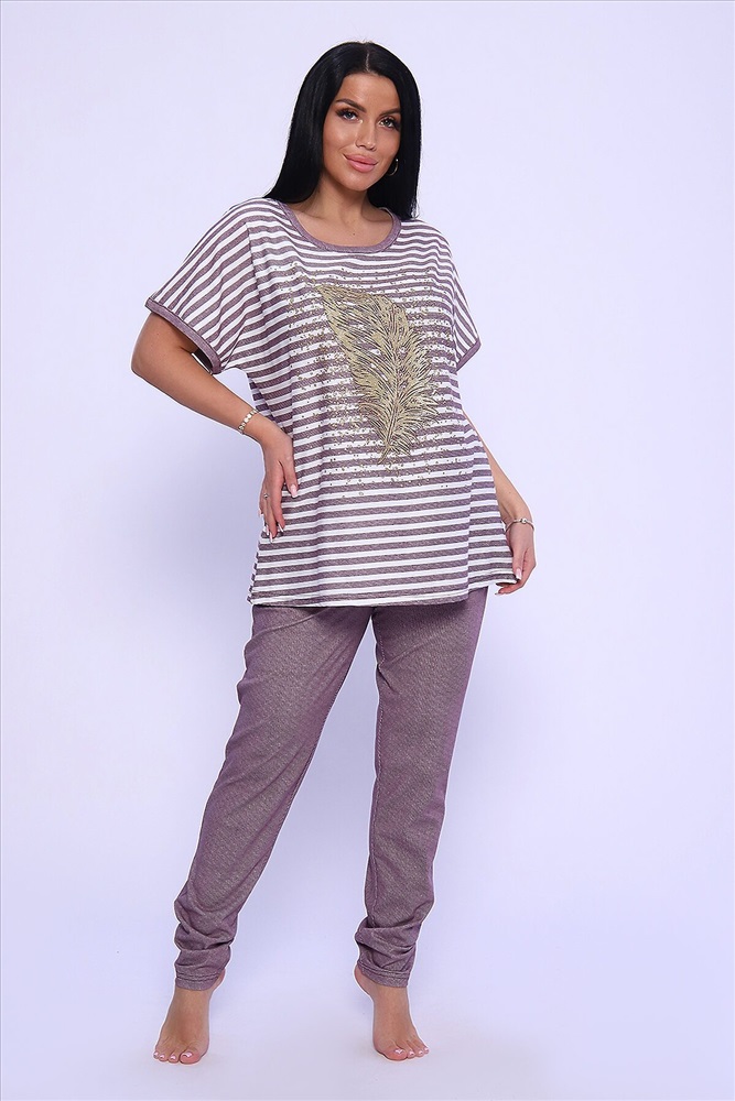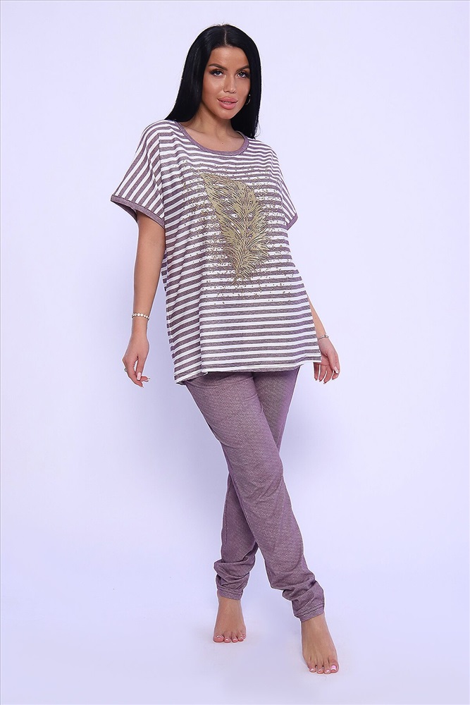 ID товара: 950090 Состав: Хлопок 100% Сезон: Демисезон Длина: Средняя Фасон: Прямой Рукав: короткие Крой брючин: Облегающий Рисунок: Полоски Тип карманов: С отрезным бочком Основная ткань: Хлопок Стиль: Повседневный Вид ткани: Кулирка Страна бренда: Россия Страна производства: Россия Универсальный женский костюм из кулирки (хлопок 100%) просто находка для любительниц комфорта и стиля! Костюм представлен в модном oversize стиле, поэтому идеально подход для женщин больших размеров и тех, кто любит просторную одежду. Костюм состоит из объемной кофты в горизонтальную линейку и брюк на резинке, которые великолепно садятся по фигуре, не стесняя движений. Кофта декорирована стильными принтом в виде пера жар-птицы, что придает изделию особый шик. Костюм прекрасно подходит как для домашних посиделок, так и для активных занятий на свежем воздухе. Не упустите возможность дополнить свой гардероб этим прекрасным комплектом! Комментарии к товару