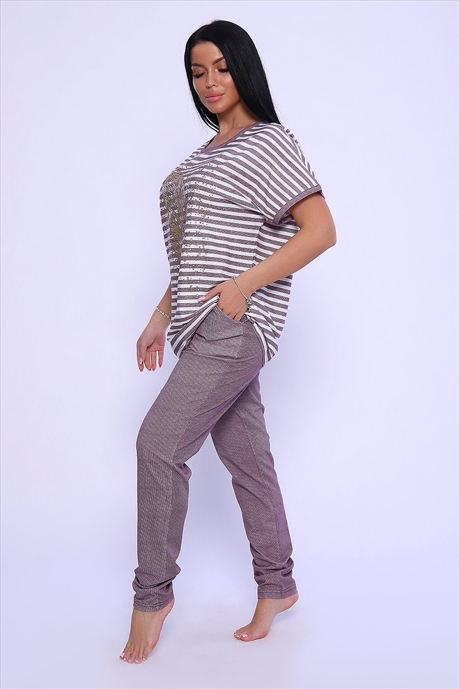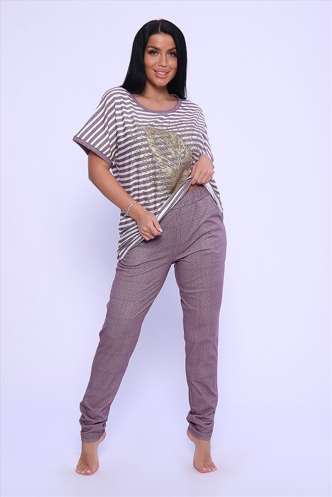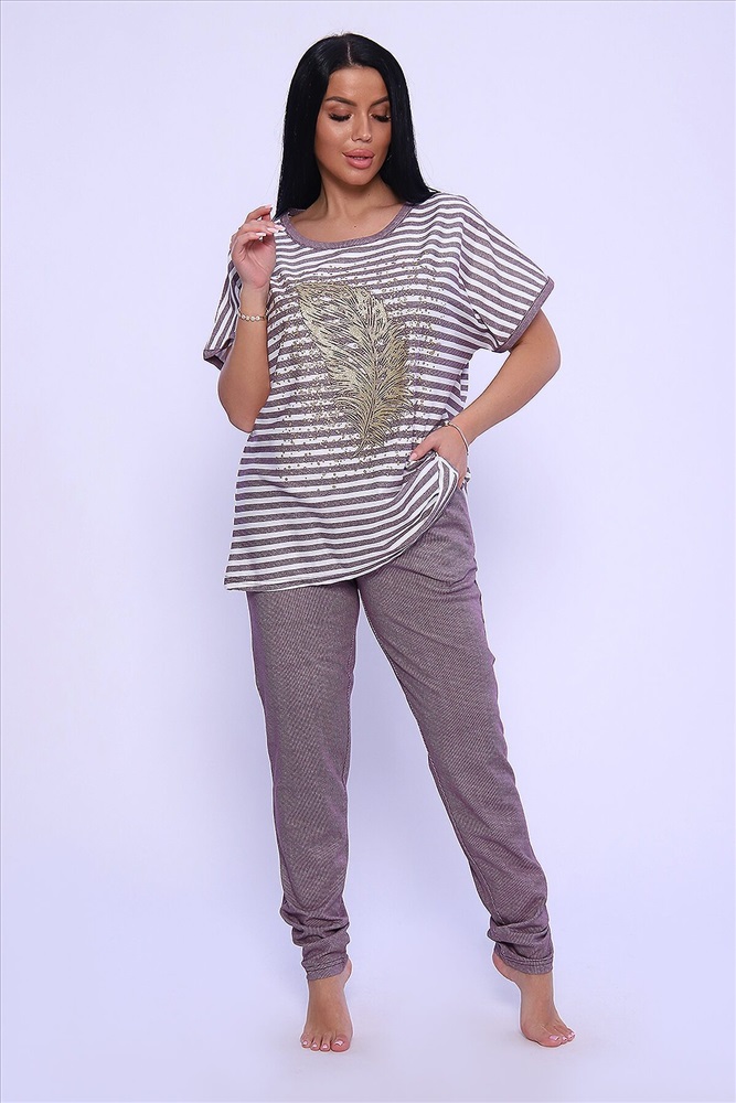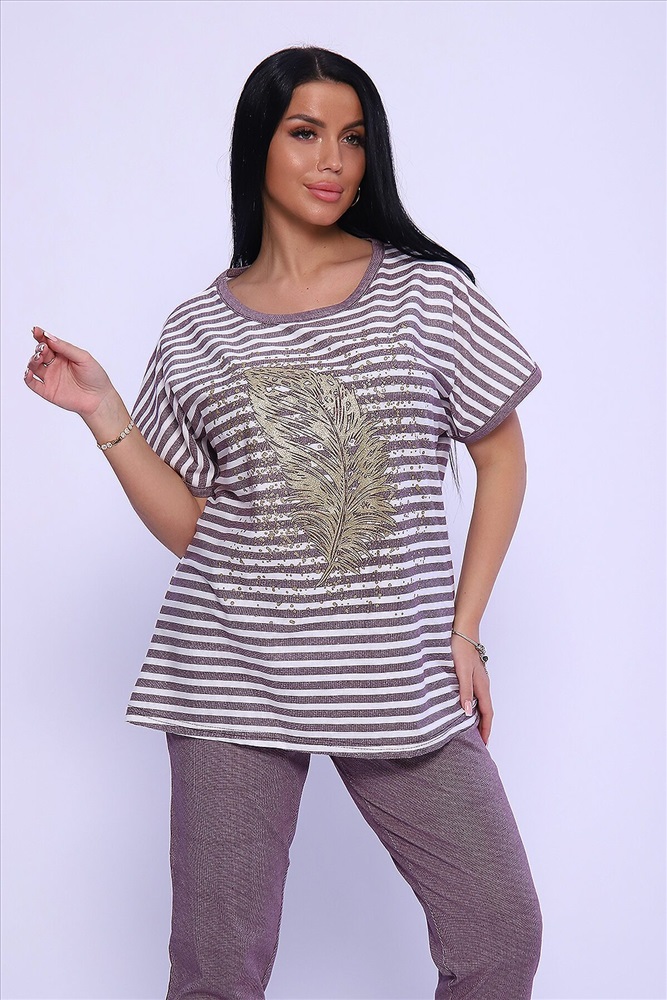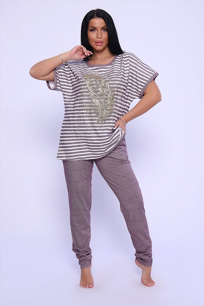 ID товара: 950090 Состав: Хлопок 100% Сезон: Демисезон Длина: Средняя Фасон: Прямой Рукав: короткие Крой брючин: Облегающий Рисунок: Полоски Тип карманов: С отрезным бочком Основная ткань: Хлопок Стиль: Повседневный Вид ткани: Кулирка Страна бренда: Россия Страна производства: Россия Универсальный женский костюм из кулирки (хлопок 100%) просто находка для любительниц комфорта и стиля! Костюм представлен в модном oversize стиле, поэтому идеально подход для женщин больших размеров и тех, кто любит просторную одежду. Костюм состоит из объемной кофты в горизонтальную линейку и брюк на резинке, которые великолепно садятся по фигуре, не стесняя движений. Кофта декорирована стильными принтом в виде пера жар-птицы, что придает изделию особый шик. Костюм прекрасно подходит как для домашних посиделок, так и для активных занятий на свежем воздухе. Не упустите возможность дополнить свой гардероб этим прекрасным комплектом! Комментарии к товару