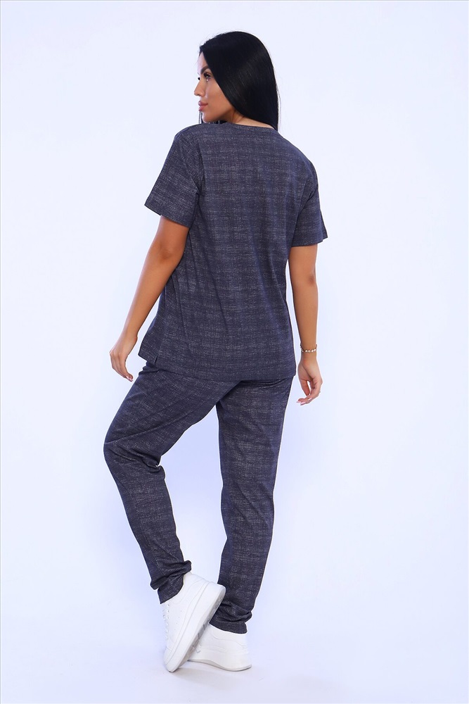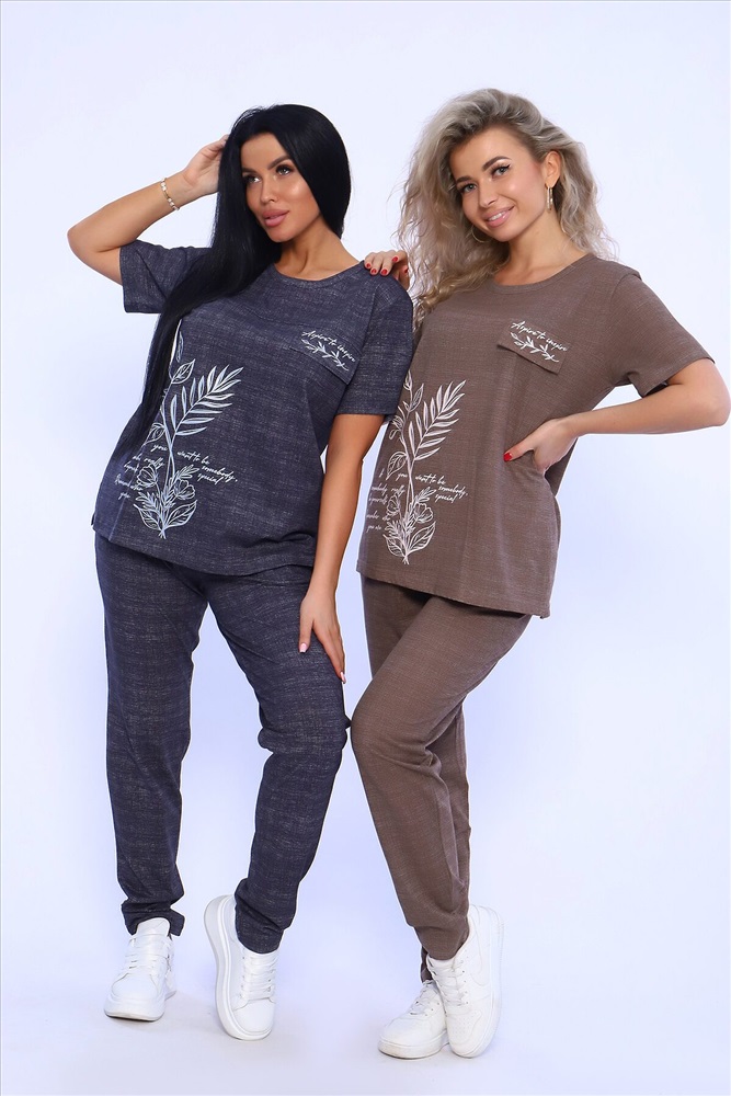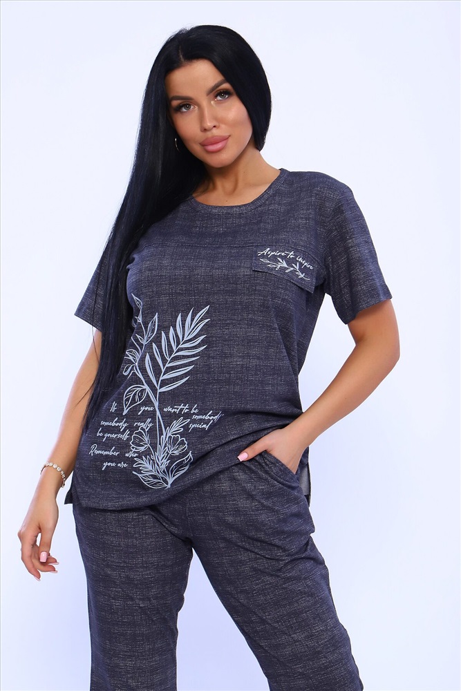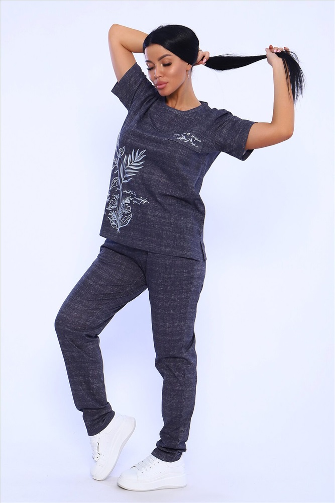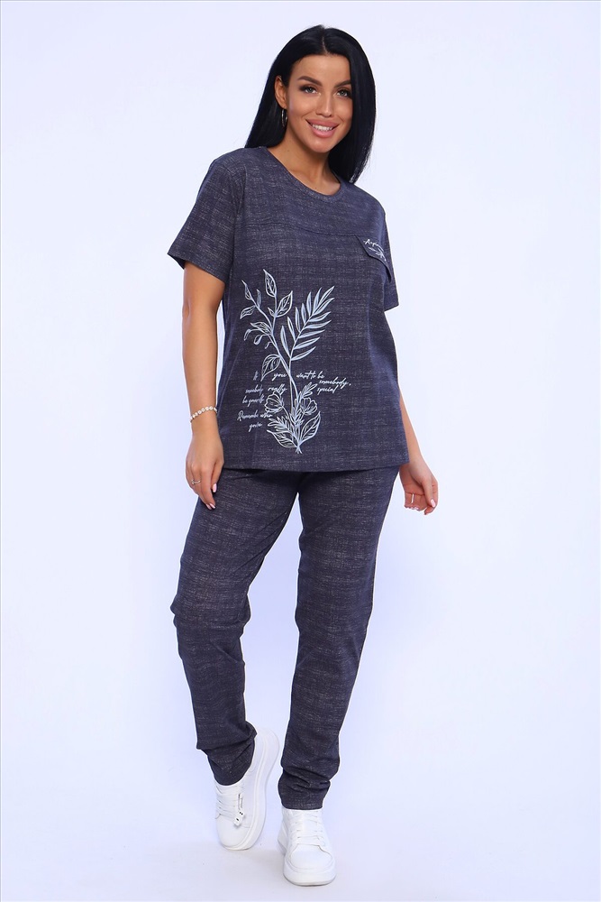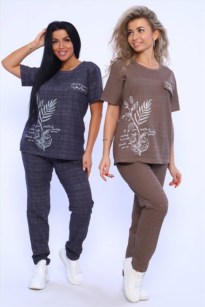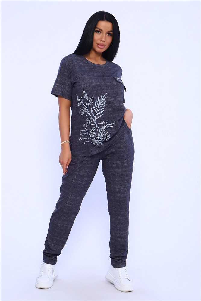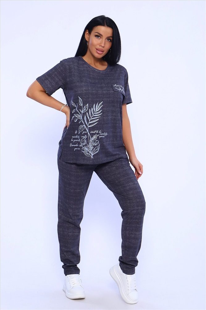 Страна производства: Россия Удобный женский костюм с брюками свободного кроя, который прекрасно подходит для дома, прогулок и повседневной носки. Легкая и приятная к телу модель станет залогом приятного времяпровождения. Дышащий хлопковый материал, удобное лекало - все это позволит Вам чувствовать себя в нашем костюме удобно и комфортно. Брюки свободные, с двумя боковыми карманами, на широком поясе с резинкой. На полочке кофты - яркий принт, контрастного к основному тону изделия цвета, изображающий выдержки из дневника и надстрочные рисунки. Дополнительным декором кофты служит клапан, так же украшенный контрастным принтом