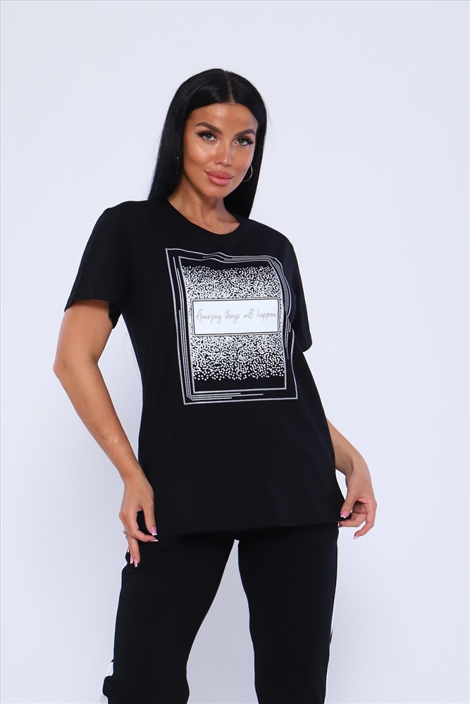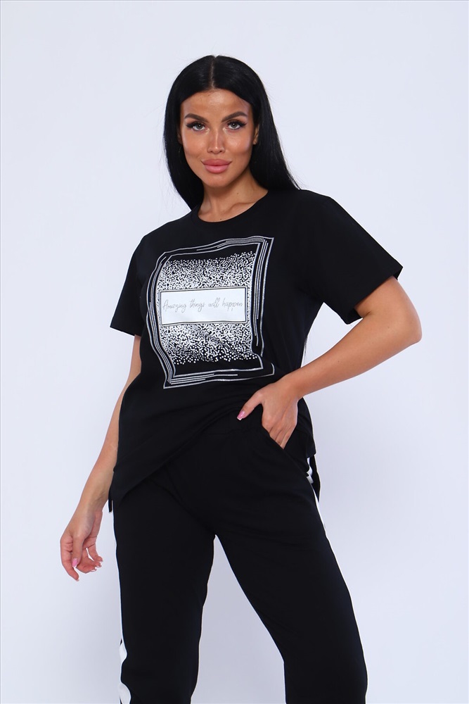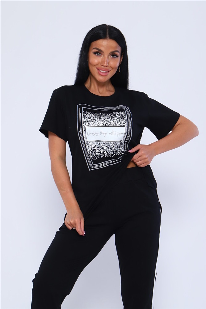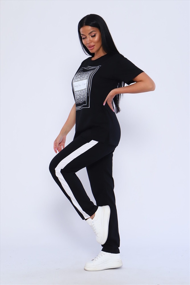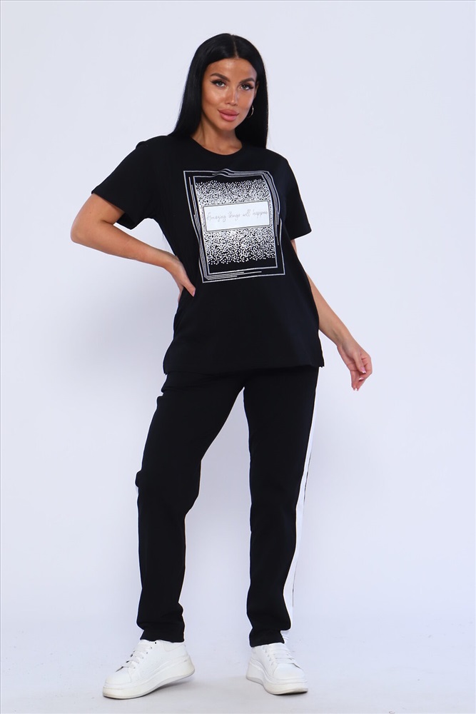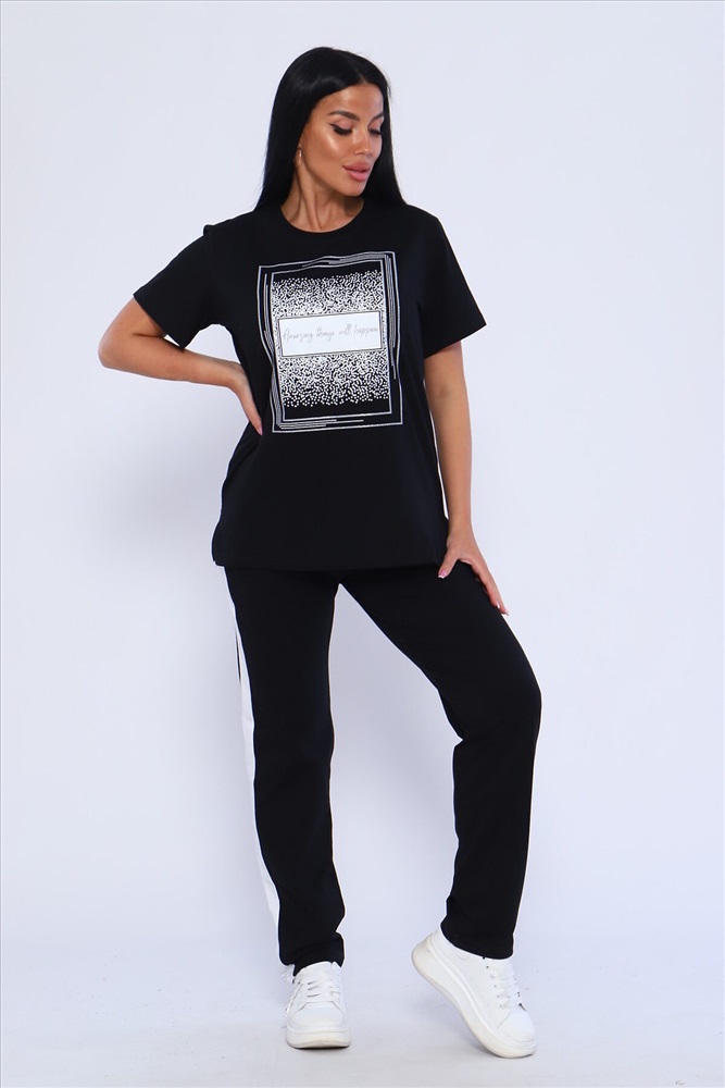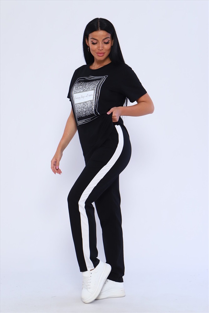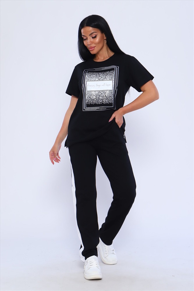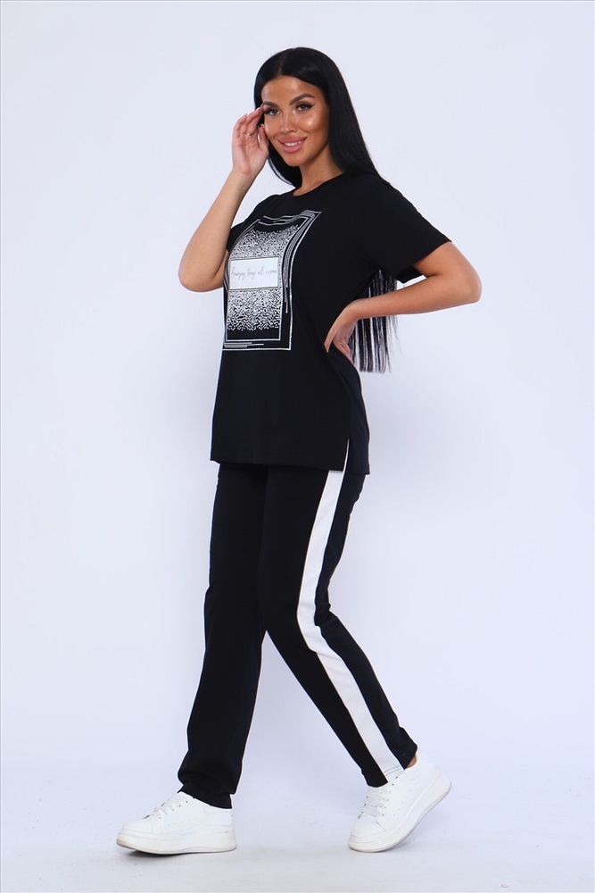 Классический и удобный трикотажный костюм с брюками из легкой хлопковой ткани! В комплекте костюма представлены кофта свободного кроя и брюки универсальной посадки с лампасами по бокам. Кофта украшена лаконичным принтом. Костюм - идеальный вариант домашней одежды для женщин, также прекрасно подойдет и для повседневной носки.