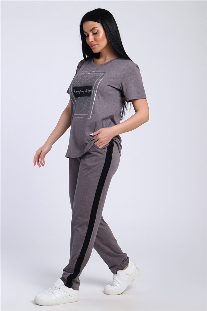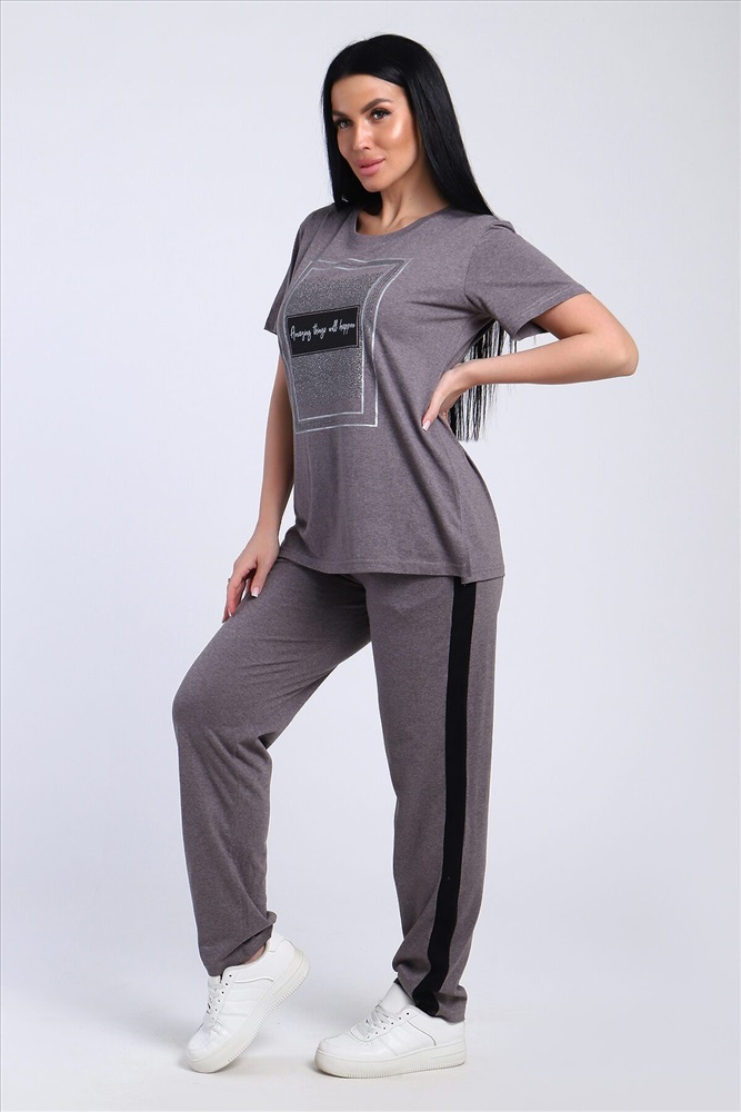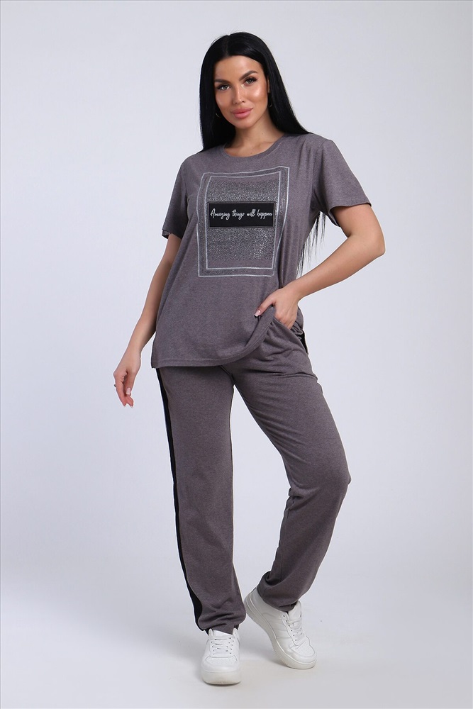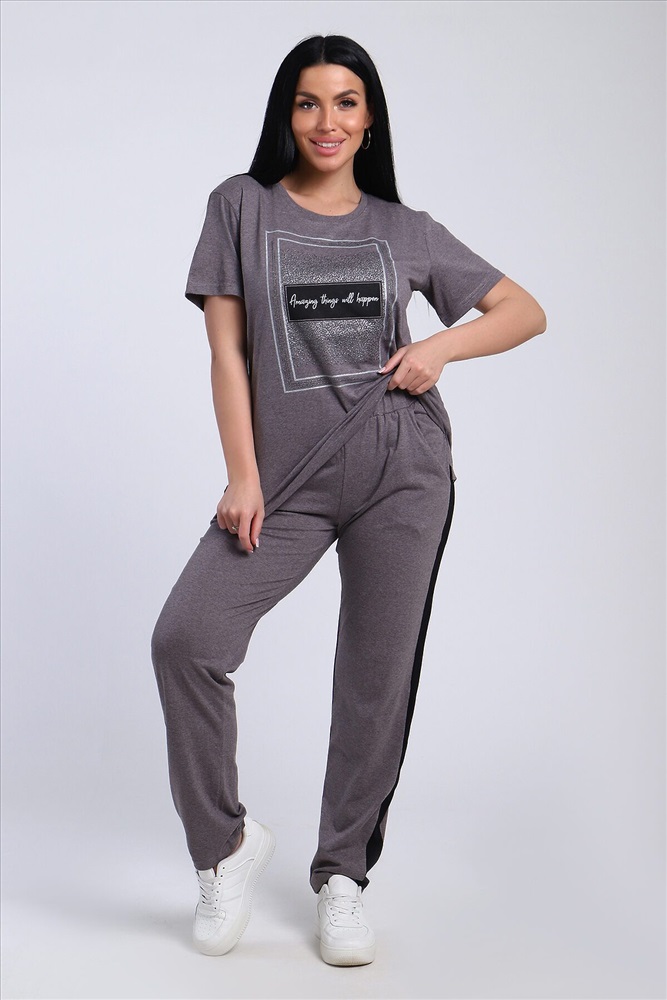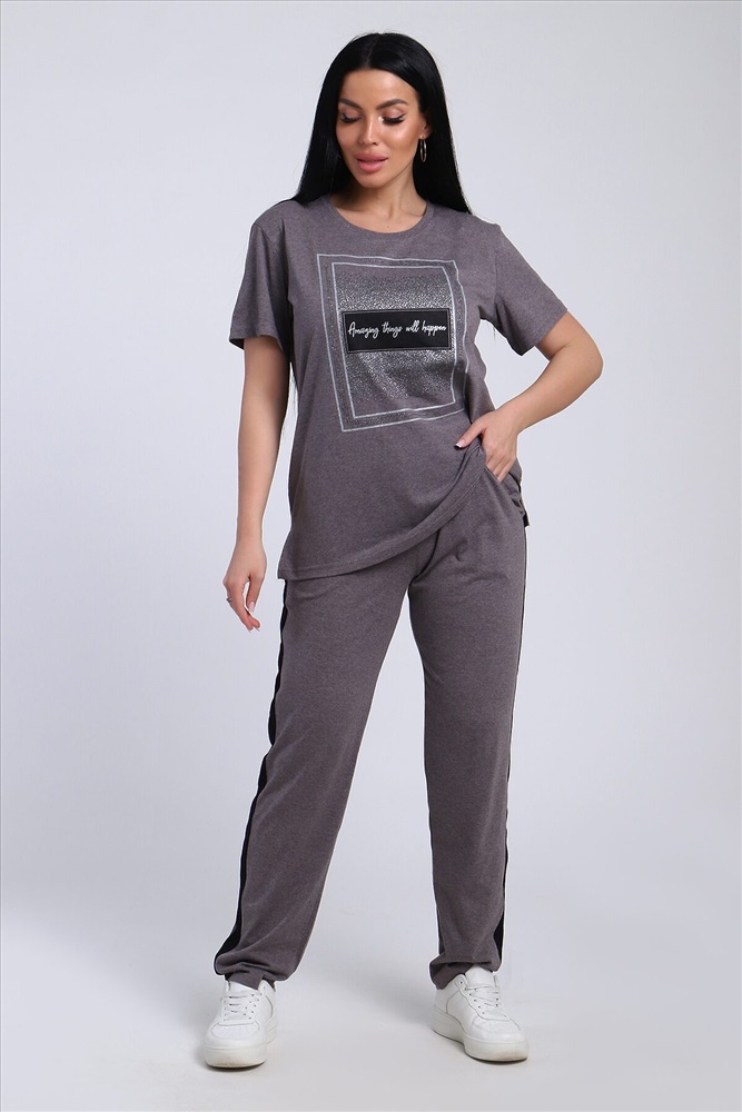Классический и удобный трикотажный костюм с брюками из легкой хлопковой ткани! В комплекте костюма представлены кофта свободного кроя и брюки универсальной посадки с лампасами по бокам. Кофта украшена лаконичным принтом. Костюм - идеальный вариант домашней одежды для женщин, также прекрасно подойдет и для повседневной носки.