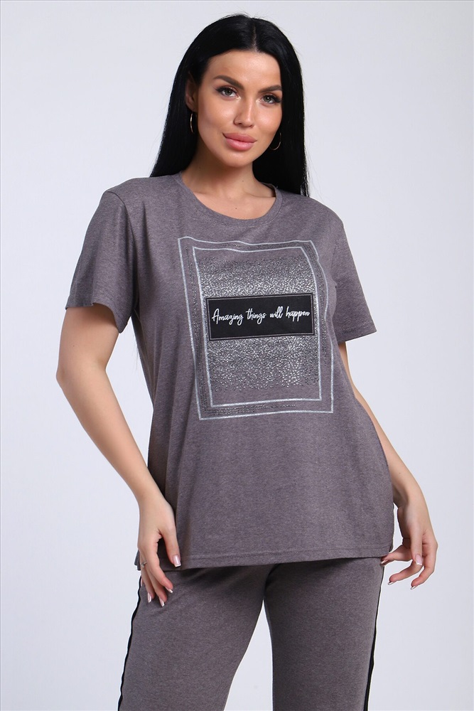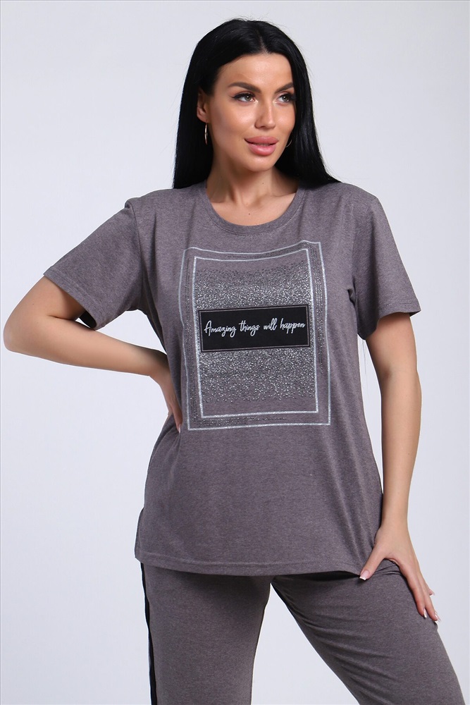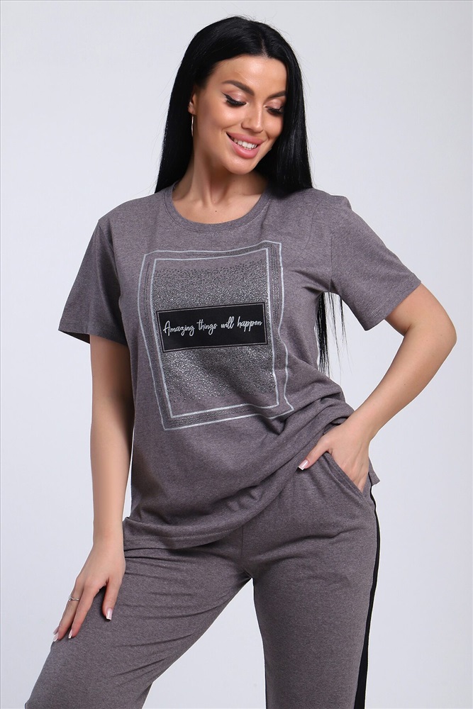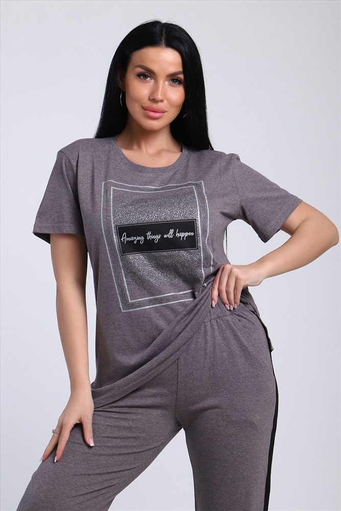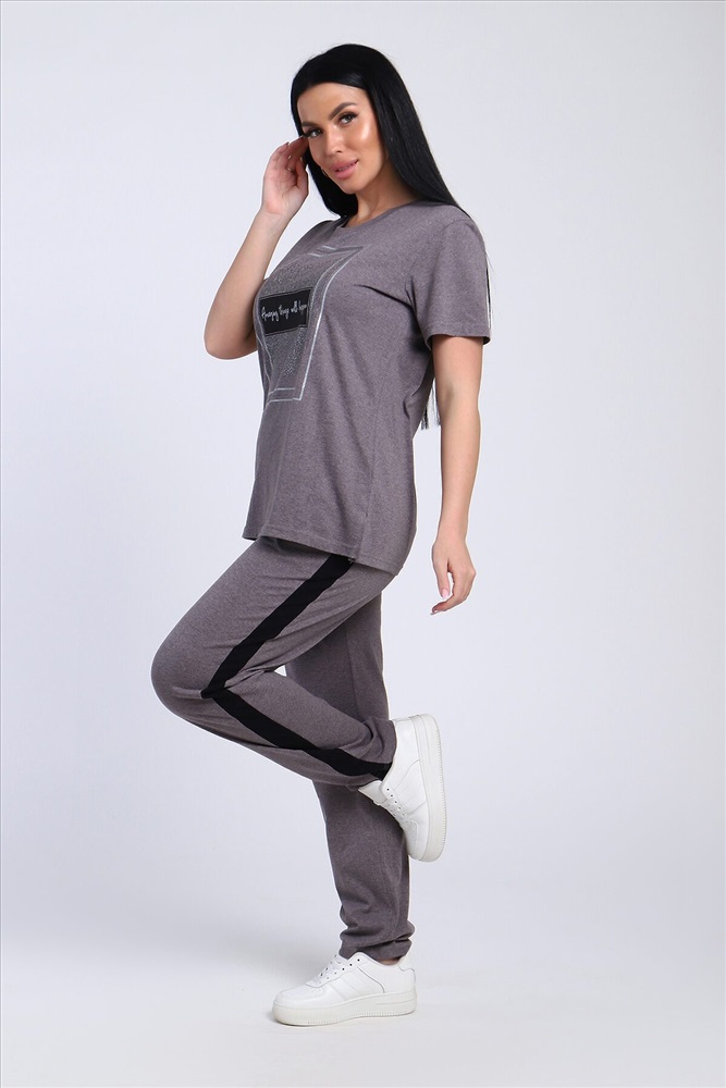 Классический и удобный трикотажный костюм с брюками из легкой хлопковой ткани! В комплекте костюма представлены кофта свободного кроя и брюки универсальной посадки с лампасами по бокам. Кофта украшена лаконичным принтом. Костюм - идеальный вариант домашней одежды для женщин, также прекрасно подойдет и для повседневной носки.