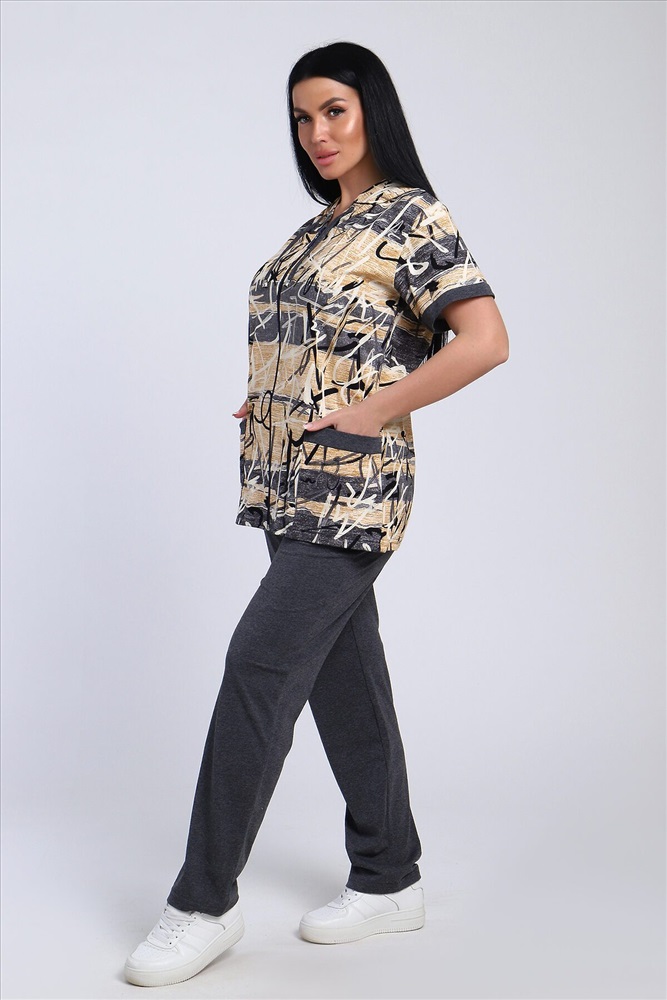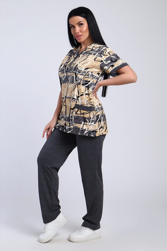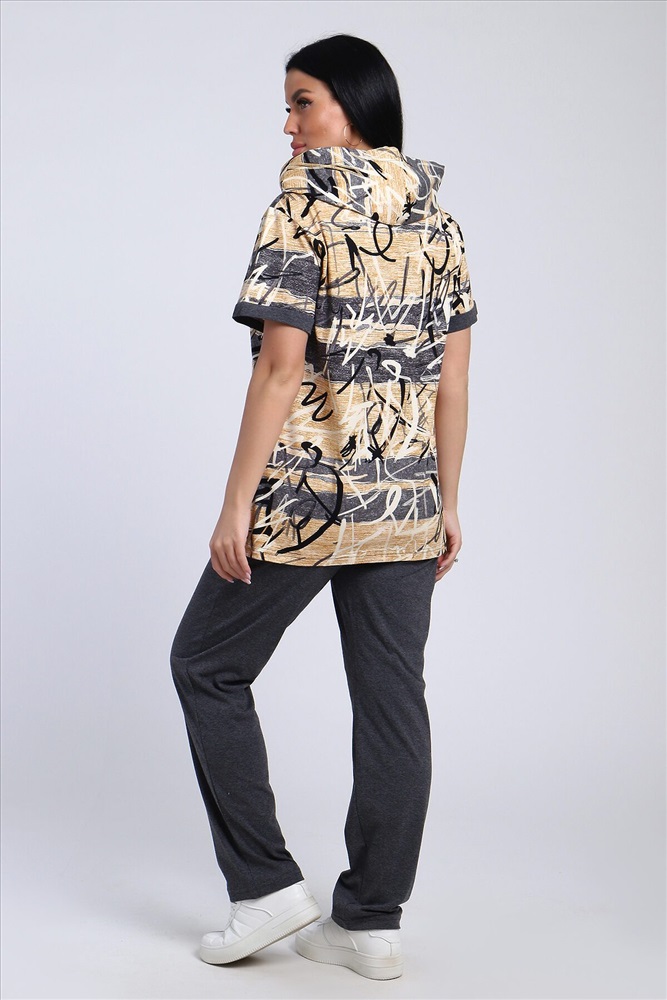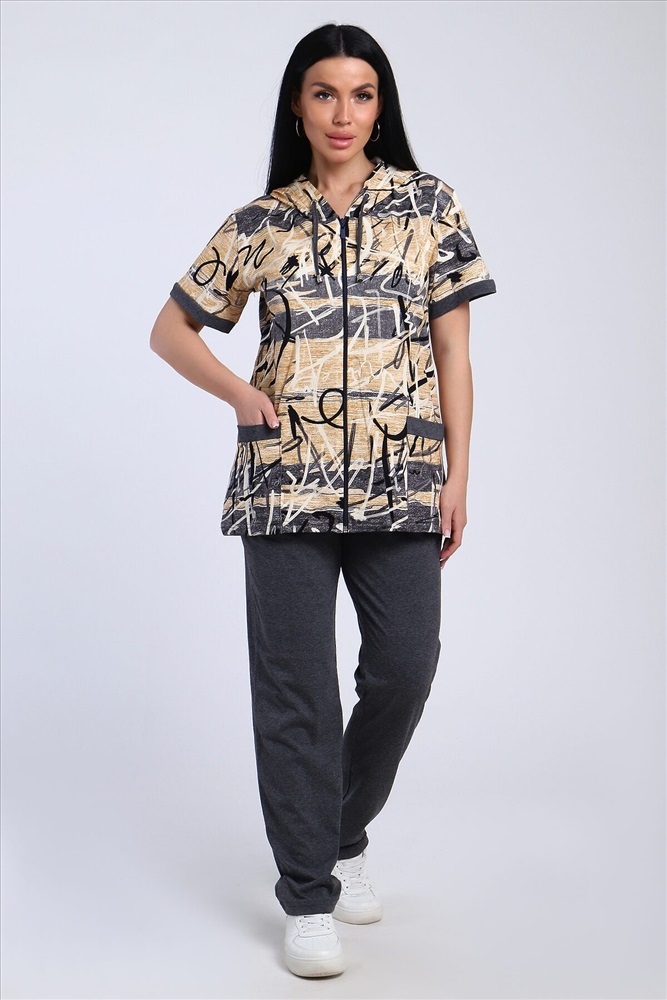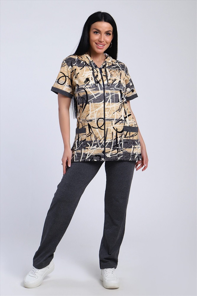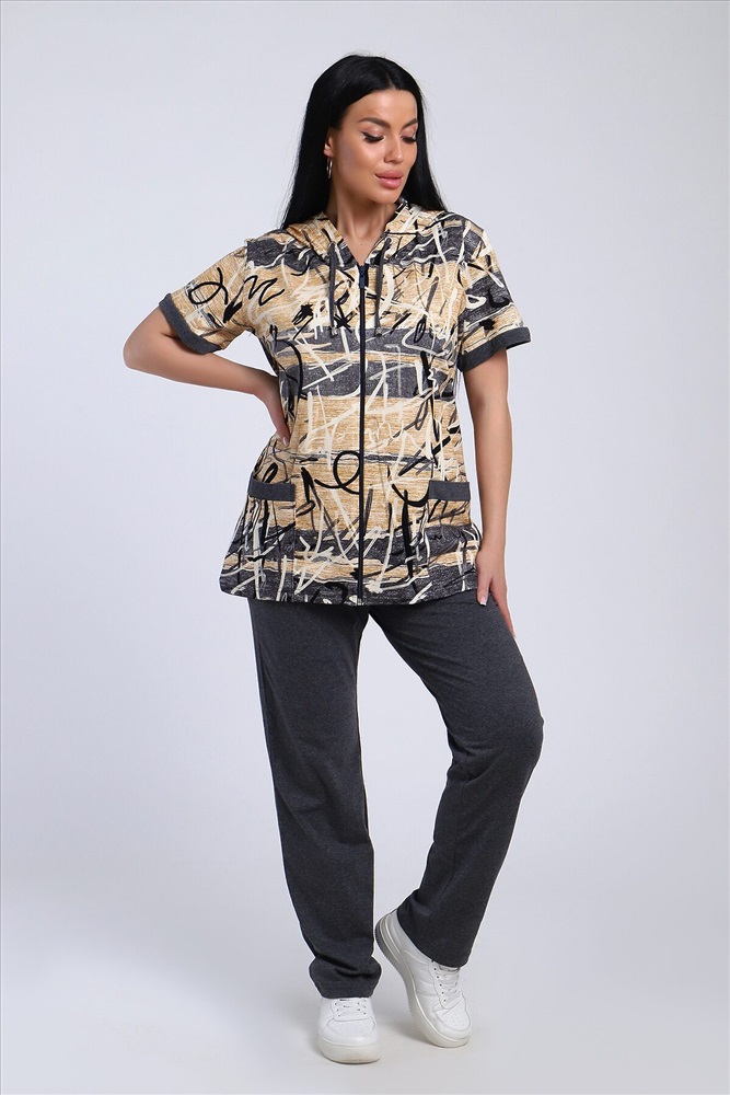 Стильный женский костюм из легкой дышащей ткани. Сшит из мягкого трикотажного полотна высокого качества. Основной изюминкой костюма является сочетание абстрактного рисунка кофты и однотонного полотна брюк, в цвет основному тону изделия. Для вашего удобства кофта застегивается на молнию, что позволяет регулировать глубину горловины, вместо воротника имеется капюшон, объем которого регулируется тонкой лентой. Этот универсальный и практичный повседневный костюм в спортивном стиле будет удобным и комфортным во многих ситуациях. Комплект отлично подойдет для спорта, бега или танцев. Брюки свободные с яркими лампасами, двумя боковыми карманами, на широком поясе с резинкой. Каждую вещь вполне можно использовать по отдельности. Комплект отлично подойдет для женщин любого возраста и поможет хозяйке выглядеть стильно, при этом даря чувство комфорта!
