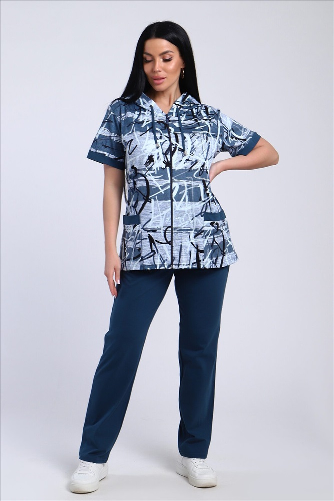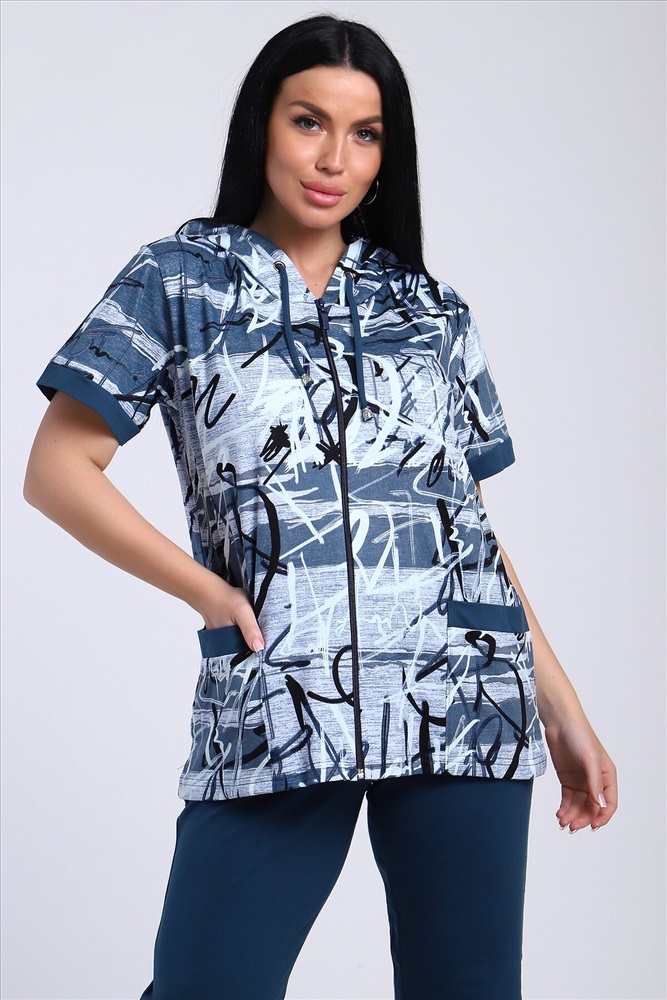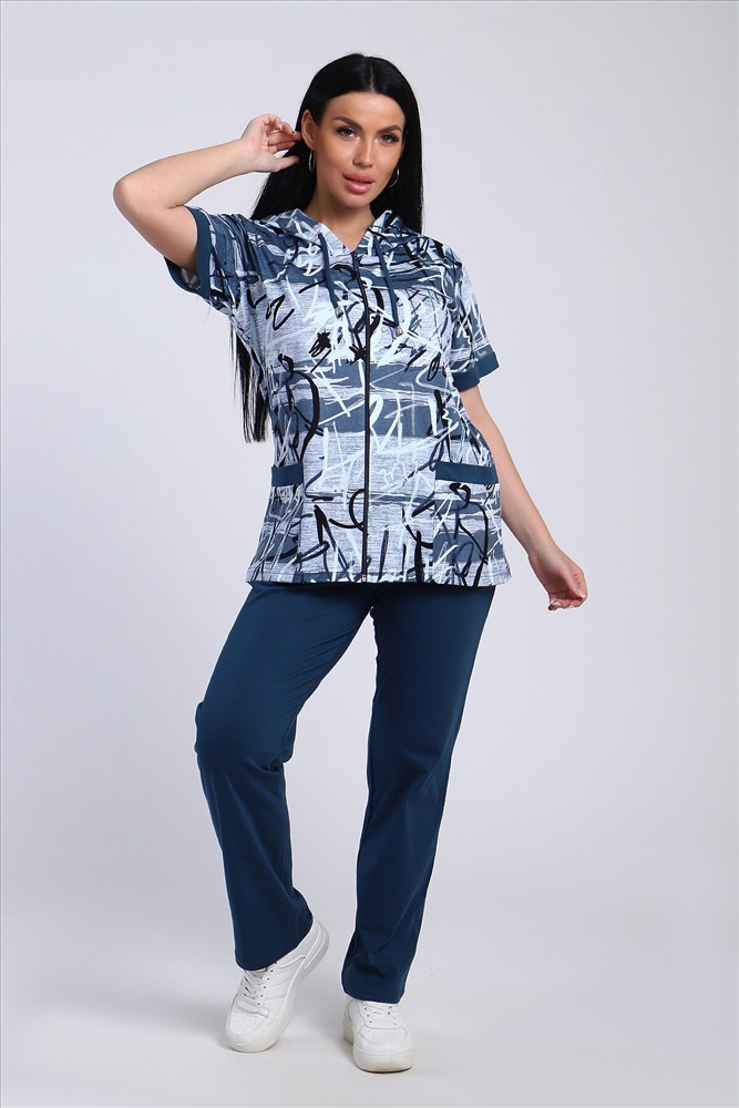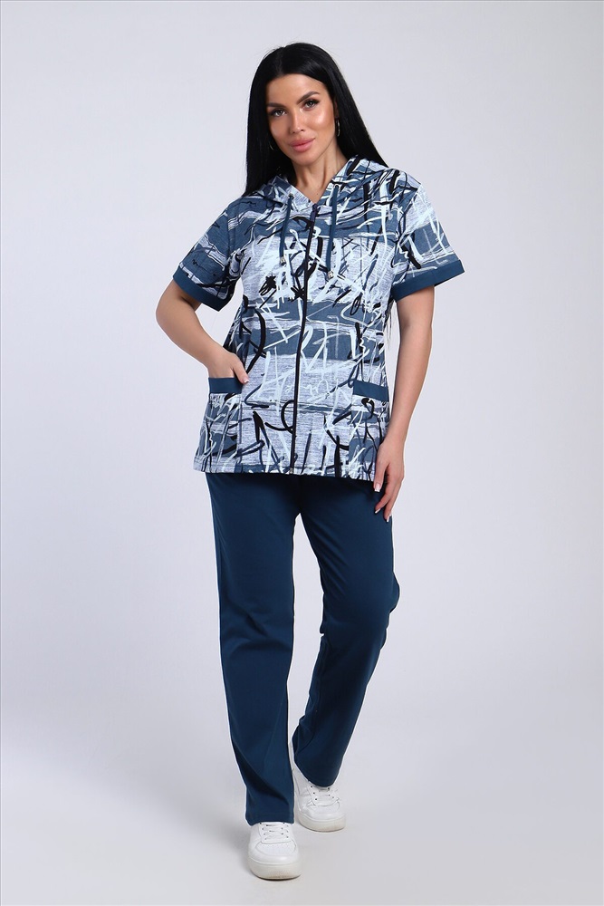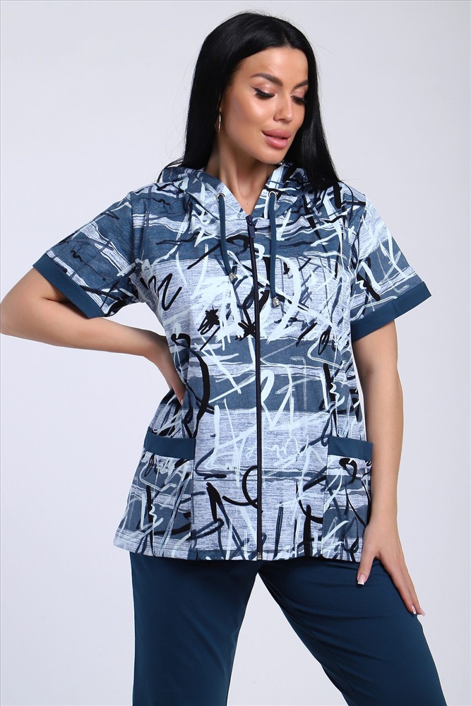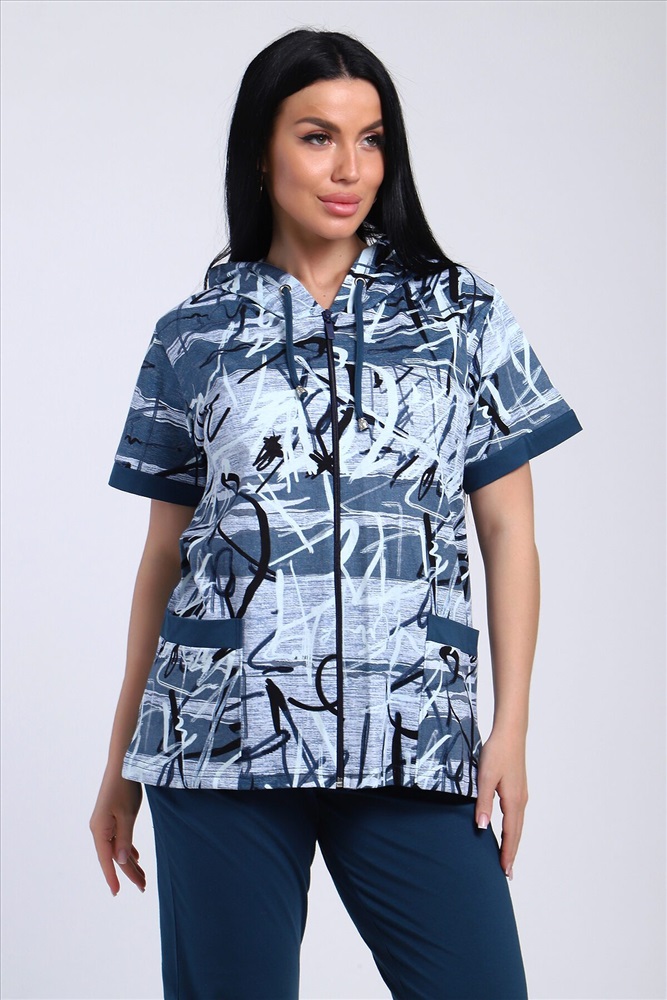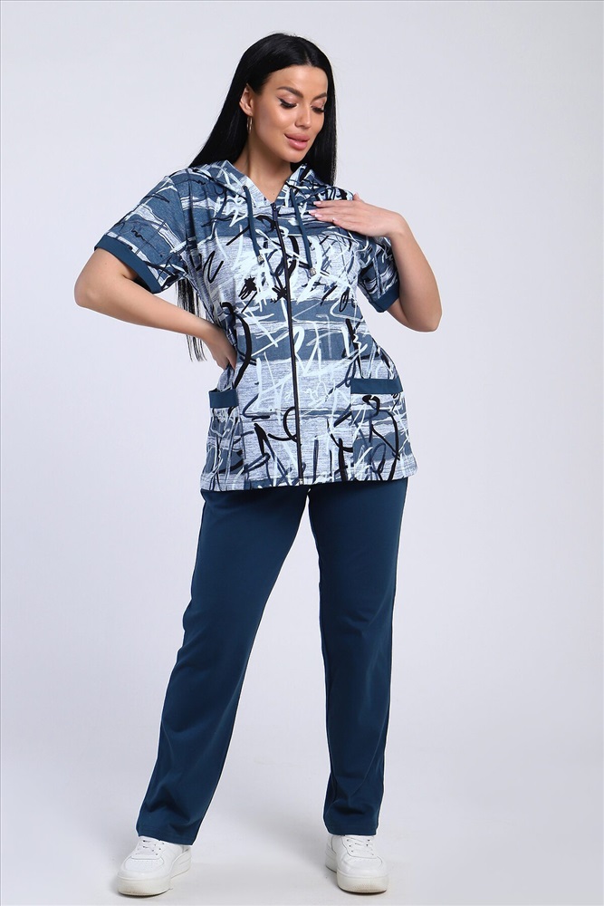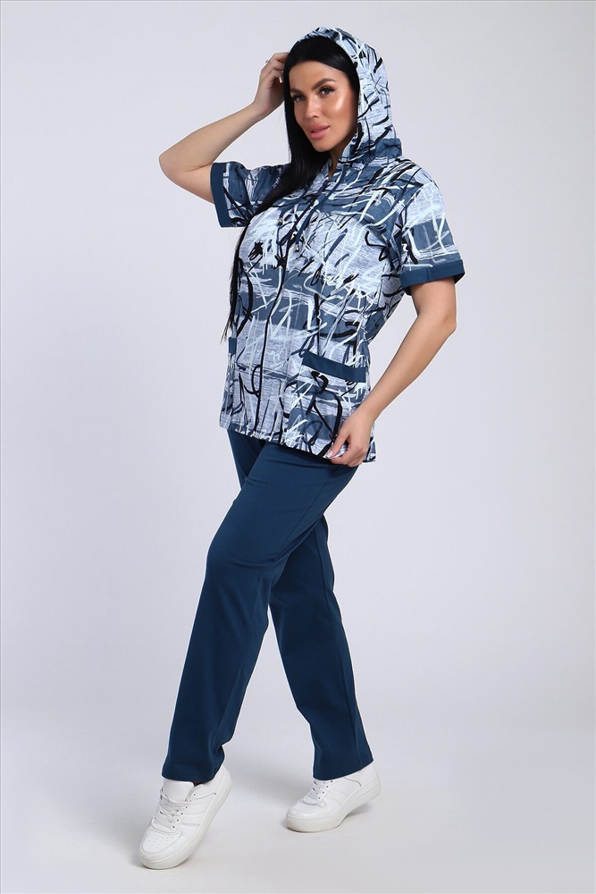 ID товара: 986669 Состав: Хлопок 100% Сезон: Весна/Лето Длина: Полная Фасон: Полуприлегающий Рукав: короткие Вид застежки: Молния Крой брючин: Прямой Рисунок: Абстракция Тип карманов: Накладные Декоративные элементы: С капюшоном Основная ткань: Хлопок Стиль: повседневный Вид ткани: Кулирка Страна бренда: Россия Страна производства: Россия Стильный женский костюм из легкой дышащей ткани. Сшит из мягкого трикотажного полотна высокого качества. Основной изюминкой костюма является сочетание абстрактного рисунка кофты и однотонного полотна брюк, в цвет основному тону изделия. Для вашего удобства кофта застегивается на молнию, что позволяет регулировать глубину горловины, вместо воротника имеется капюшон, объем которого регулируется тонкой лентой. Этот универсальный и практичный повседневный костюм в спортивном стиле будет удобным и комфортным во многих ситуациях. Комплект отлично подойдет для спорта, бега или танцев. Брюки свободные с яркими лампасами, двумя боковыми карманами, на широком поясе с резинкой. Каждую вещь вполне можно использовать по отдельности. Комплект отлично подойдет для женщин любого возраста и поможет хозяйке выглядеть стильно, при этом даря чувство комфорта! Комментарии к товару