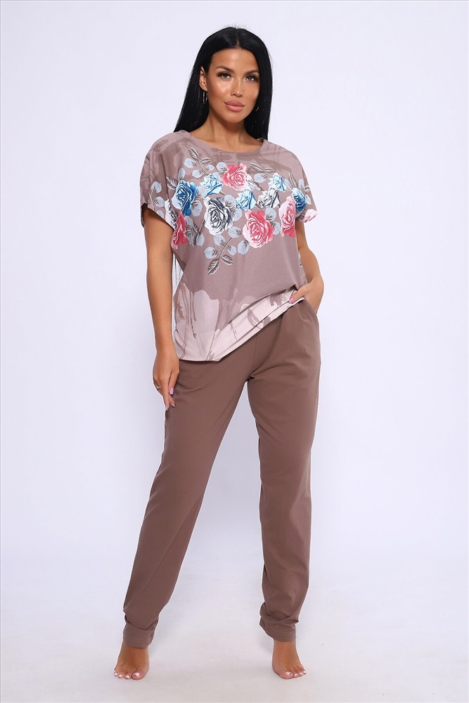 Женский трикотажный костюм с брюками - идеальный выбор для тех, кто следит за модой и всегда хочет выглядеть сногсшибательно! Костюм прекрасно подходит для дома, прогулок и повседневной носки. Брюки свободные, с двумя боковыми карманами, на широком поясе с резинкой, кофта сшита из ткани с ярким цветочным рисунком. Легкая и приятная к телу ткань станет залогом приятного времяпровождения. Яркий и стильный костюм несомненно будет радовать хозяйку и поднимать настроение ей и окружающим!