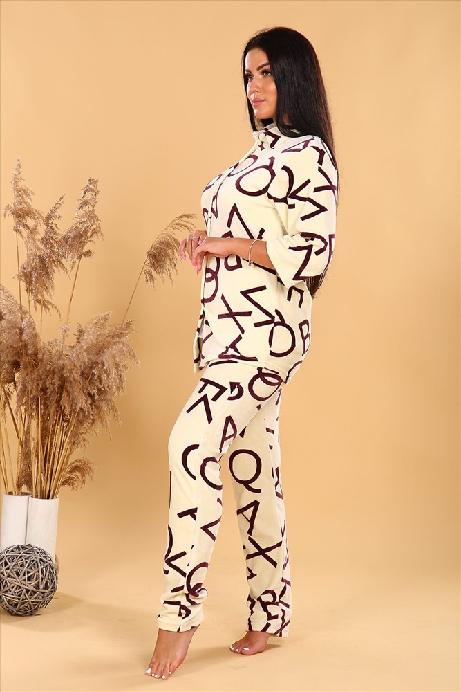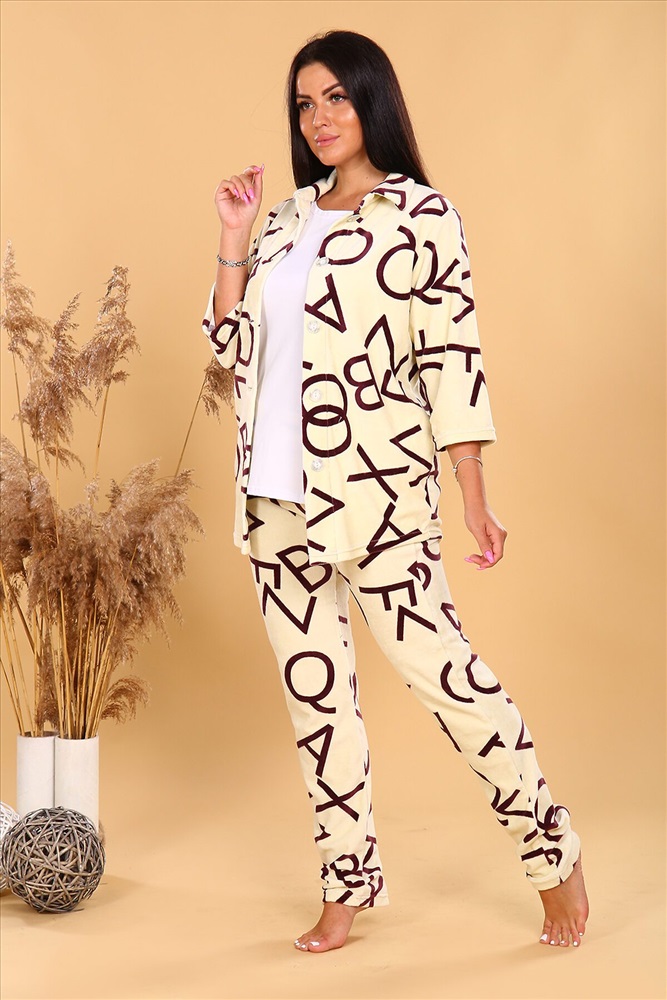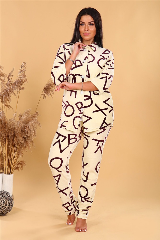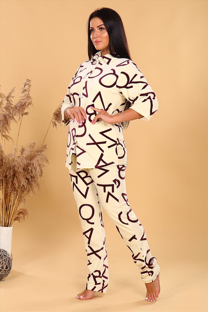 ID товара: 881570 Состав: 80% Хлопок, 20% Полиэстер Сезон: Весна/Лето Длина: Средняя Фасон: Прямой Рукав: 3/4 Вид застежки: Пуговицы Крой брючин: Прямой Рисунок: Надпись Основная ткань: Велюр Стиль: Повседневный Страна бренда: Россия Страна производства: Россия Домашний женский костюм из велюра. Кофта на пуговицах, с рубашечным воротником. Рукав 3/4. Низ кофточки закруглен. Брюки на широкой резинке, без карманов, полная длина. Ткань очень хорошего качества, мягкая, бархатная, рисунок яркий, насыщенный. Для дома и отдыха. Комментарии к товару
