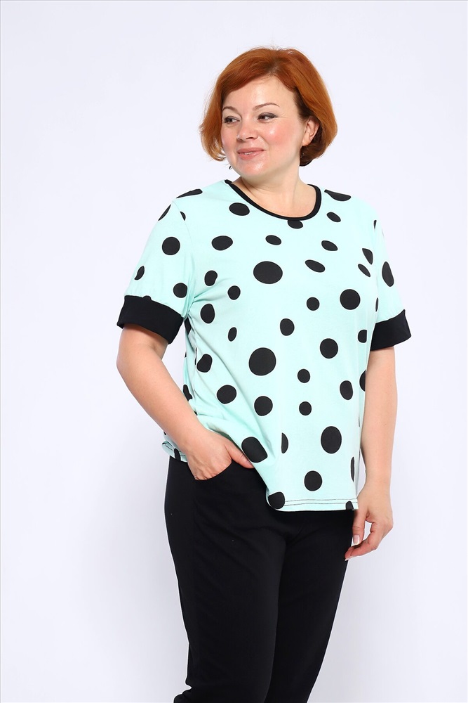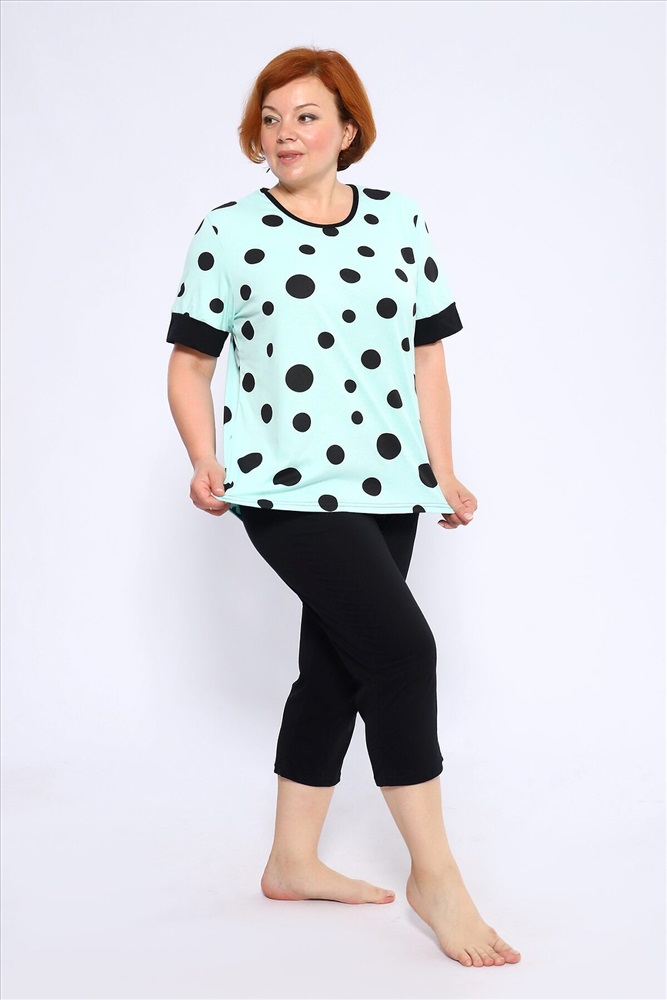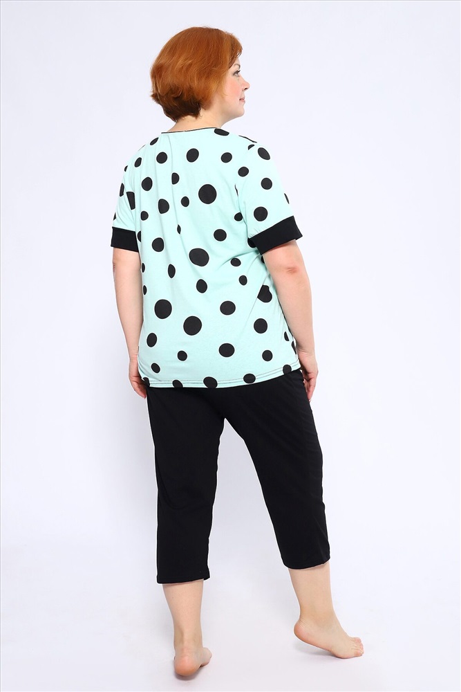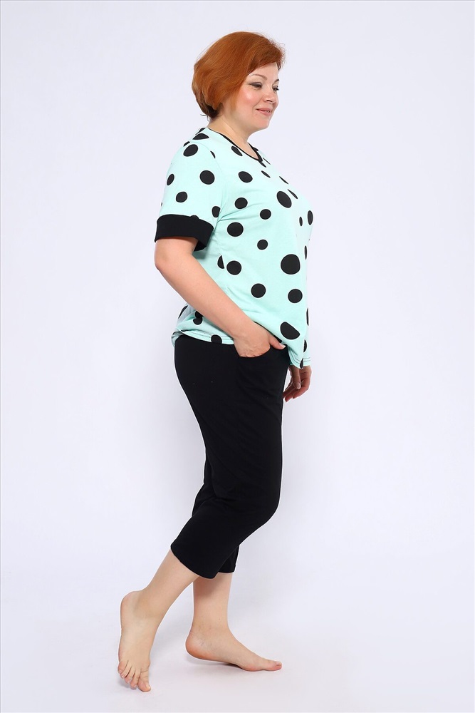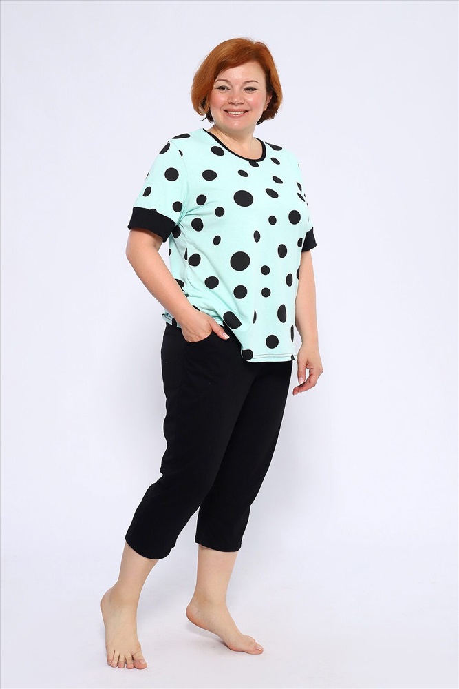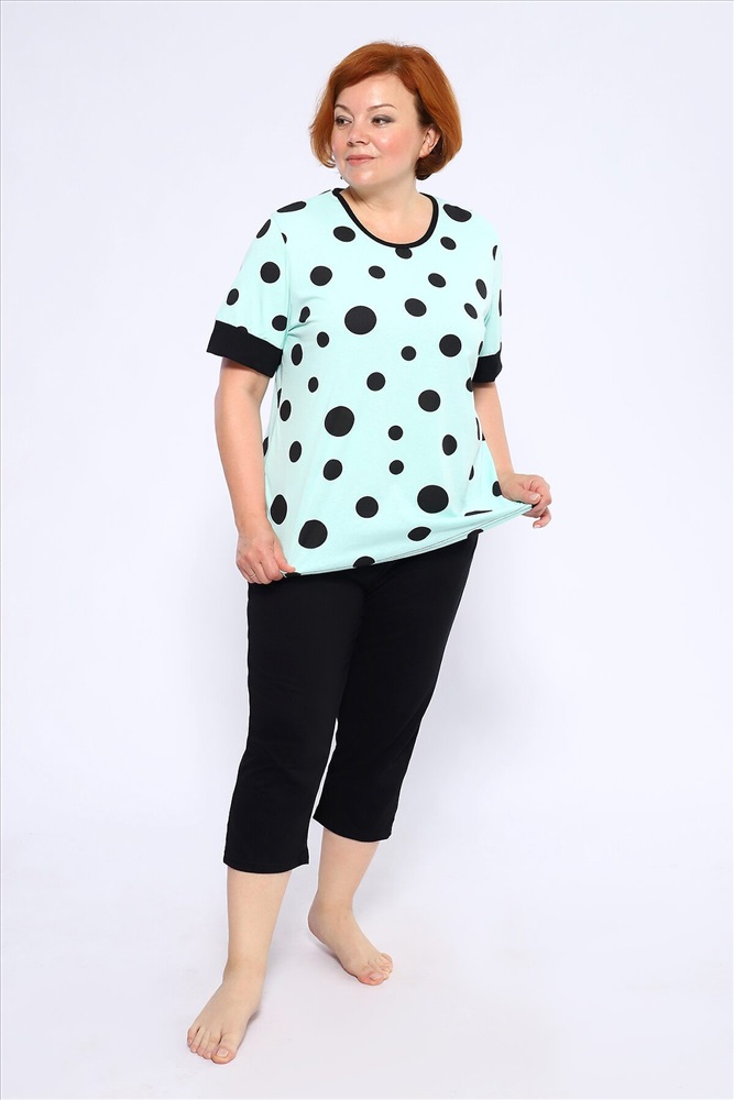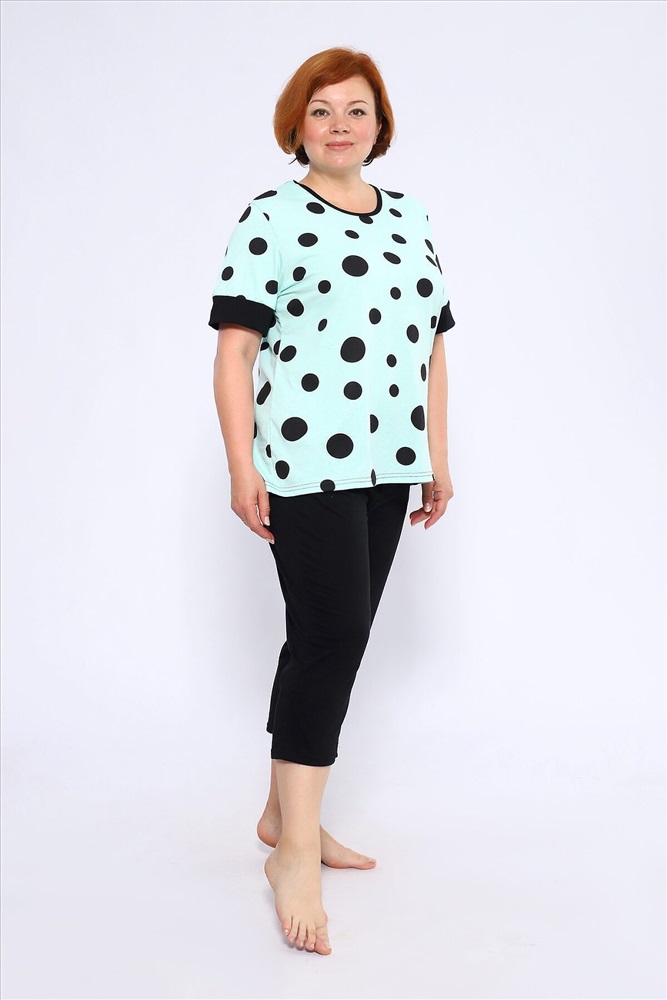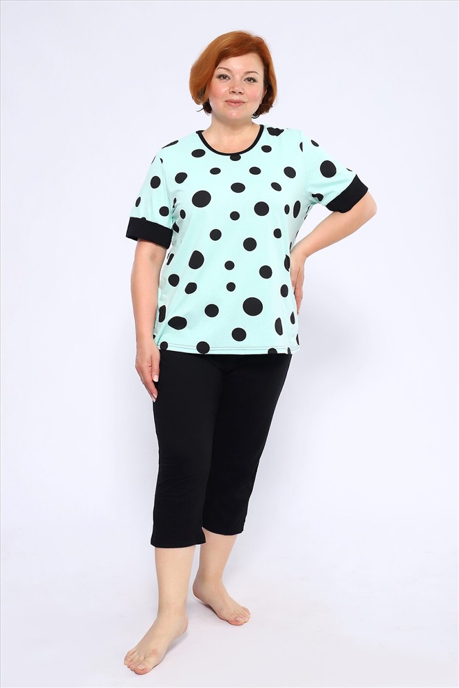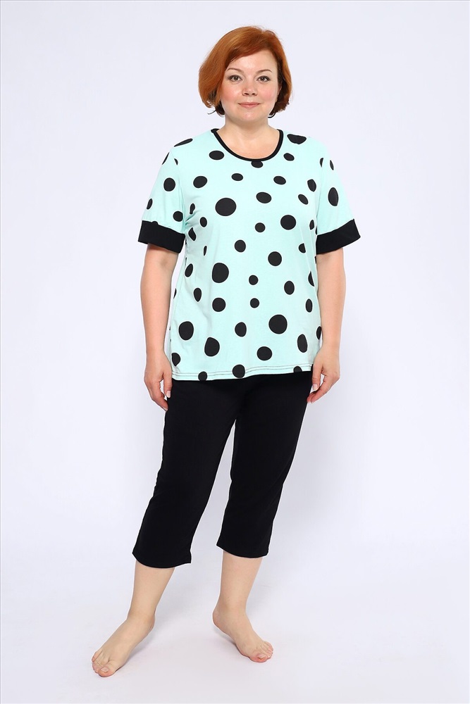 Страна производства: Россия Женский костюм из кулирки футболка + бриджи. Футболка из набивной ткани с цветами, короткие рукава с манжетами, бриджи из однотонной ткани с карманами.
