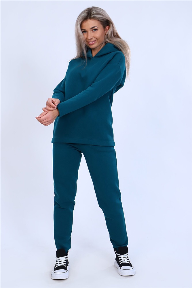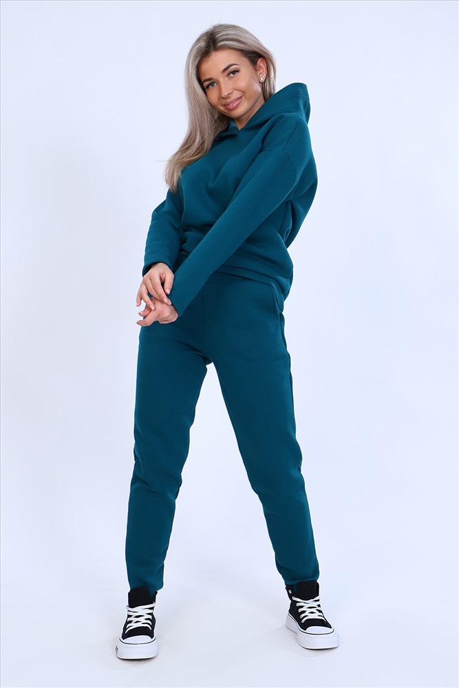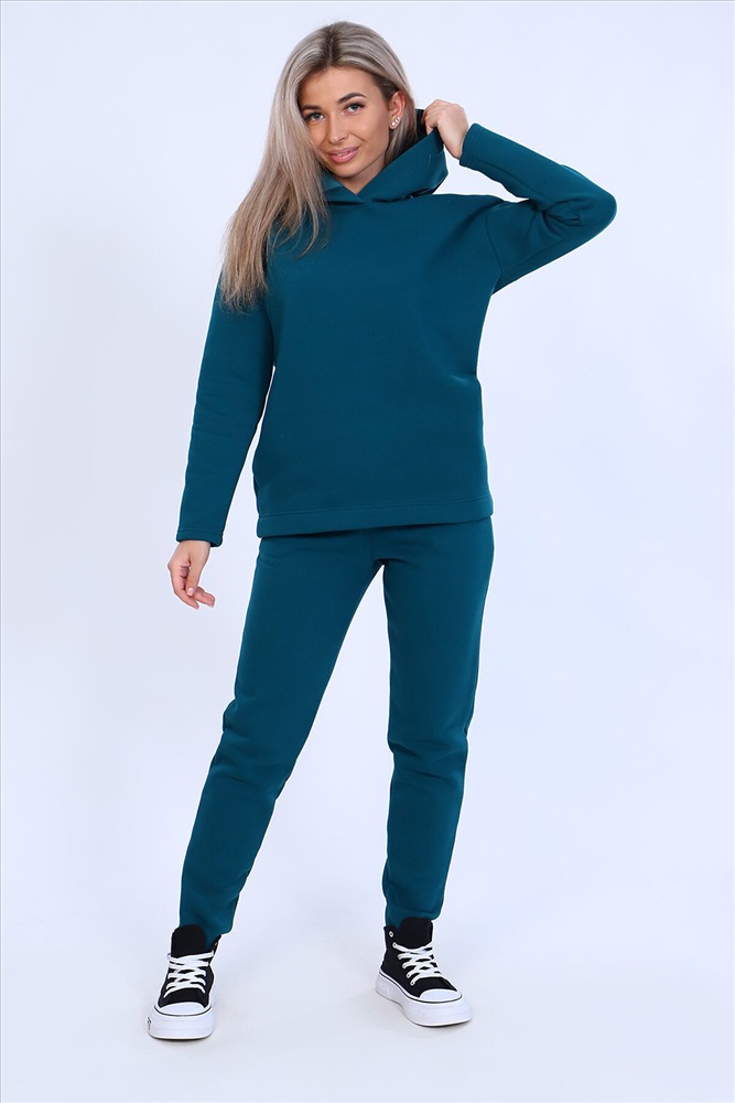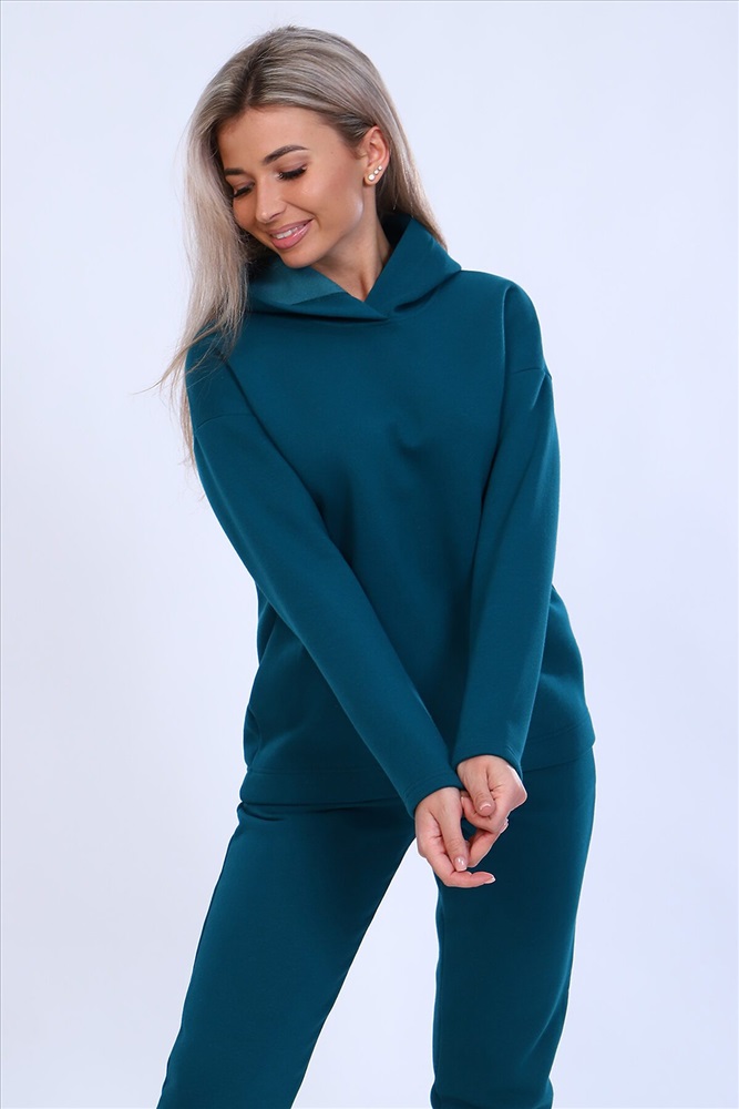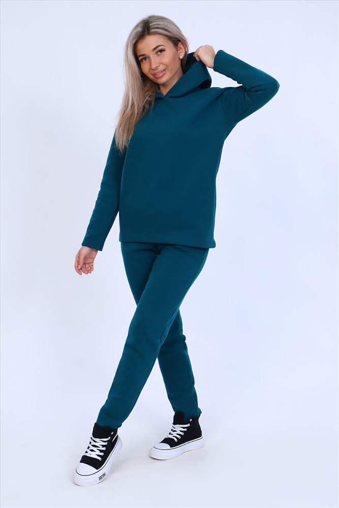 Страна производства: Россия Тёплый женский костюм, состоящий из толстовки и брюк. Комплект сшит из трехнитчатого футера высококачественного, тёплого и плотного трикотажа с начесом. Толстовка прямого силуэта с длинным рукавом и капюшоном в нахлест по центру горловины и фигурным низом - укороченной полочкой. Брюки прямого кроя с боковыми карманами в шве со скошенным входом на широкой (5 см) резинке, выполненной на поясной машине. Подклад кармана выполнен из тонкой хлопчатобумажной ткани-компаньона для избежания утолщения изделия. Низ толстовки, рукавов и брюк выполнен с широкой подгибкой, имитируя манжет. Костюм теплый, практичный, не стесняет движений, отлично подходит для занятий зимними видами спорта, для уличных прогулок в холодное время года, а также, как домашний костюм и для беременных. Отличный подарок самым прекрасным по любому поводу!