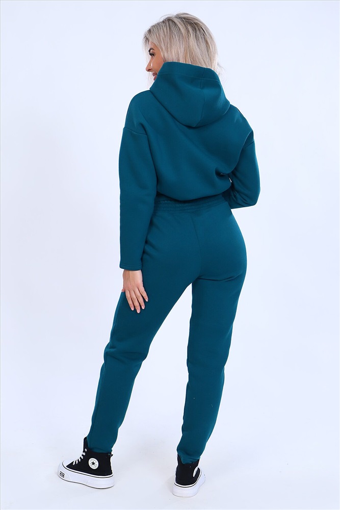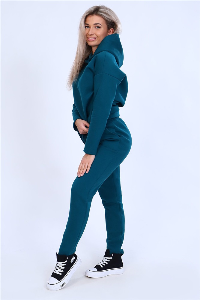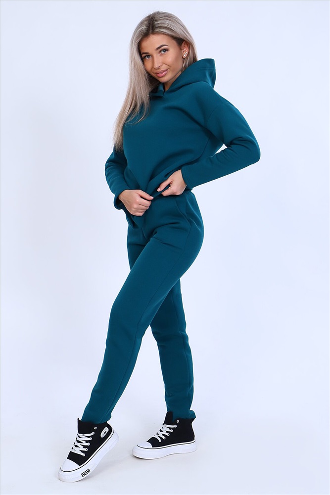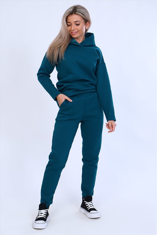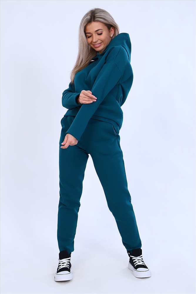 Страна производства: Россия Тёплый женский костюм, состоящий из толстовки и брюк. Комплект сшит из трехнитчатого футера высококачественного, тёплого и плотного трикотажа с начесом. Толстовка прямого силуэта с длинным рукавом и капюшоном в нахлест по центру горловины и фигурным низом - укороченной полочкой. Брюки прямого кроя с боковыми карманами в шве со скошенным входом на широкой (5 см) резинке, выполненной на поясной машине. Подклад кармана выполнен из тонкой хлопчатобумажной ткани-компаньона для избежания утолщения изделия. Низ толстовки, рукавов и брюк выполнен с широкой подгибкой, имитируя манжет. Костюм теплый, практичный, не стесняет движений, отлично подходит для занятий зимними видами спорта, для уличных прогулок в холодное время года, а также, как домашний костюм и для беременных. Отличный подарок самым прекрасным по любому поводу!