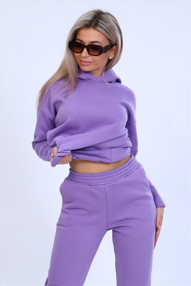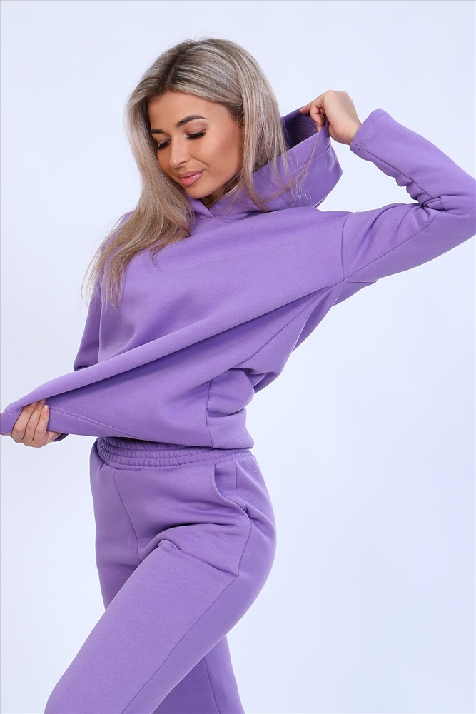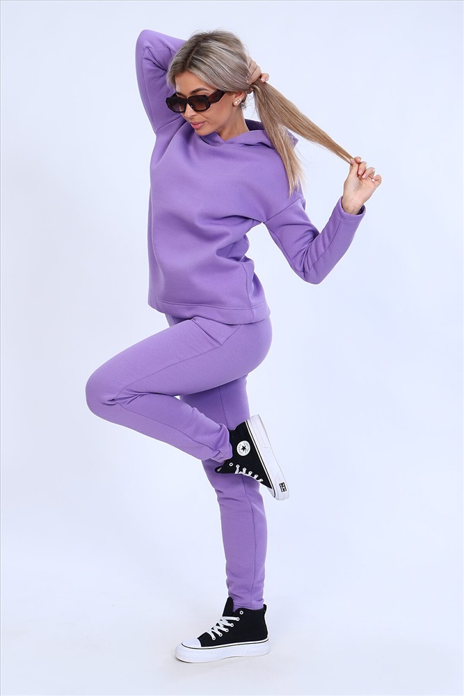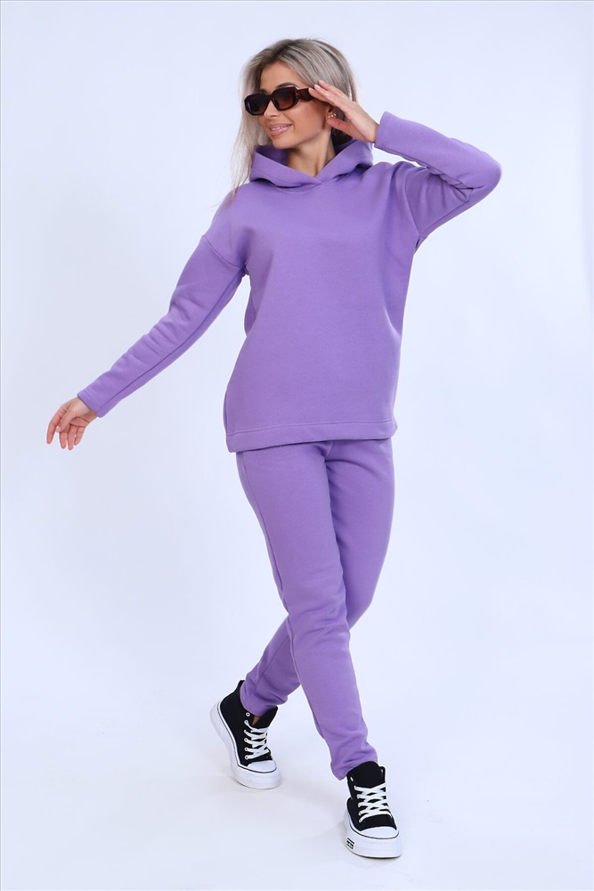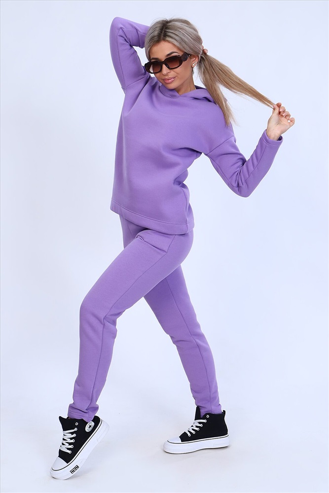Страна производства: Россия Тёплый женский костюм, состоящий из толстовки и брюк. Комплект сшит из трехнитчатого футера высококачественного, тёплого и плотного трикотажа с начесом. Толстовка прямого силуэта с длинным рукавом и капюшоном в нахлест по центру горловины и фигурным низом - укороченной полочкой. Брюки прямого кроя с боковыми карманами в шве со скошенным входом на широкой (5 см) резинке, выполненной на поясной машине. Подклад кармана выполнен из тонкой хлопчатобумажной ткани-компаньона для избежания утолщения изделия. Низ толстовки, рукавов и брюк выполнен с широкой подгибкой, имитируя манжет. Костюм теплый, практичный, не стесняет движений, отлично подходит для занятий зимними видами спорта, для уличных прогулок в холодное время года, а также, как домашний костюм и для беременных. Отличный подарок самым прекрасным по любому поводу!