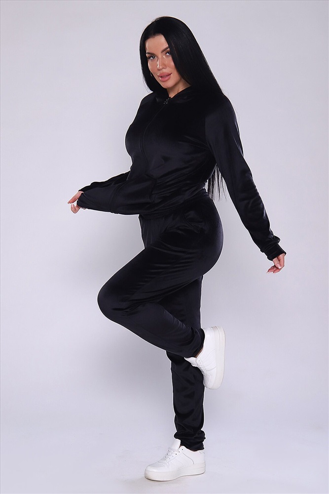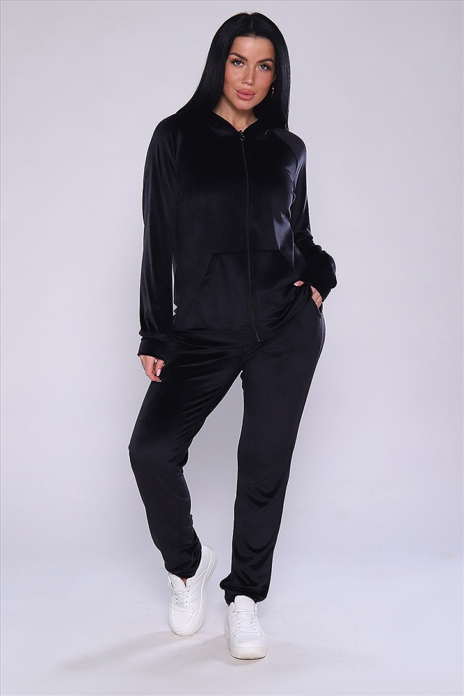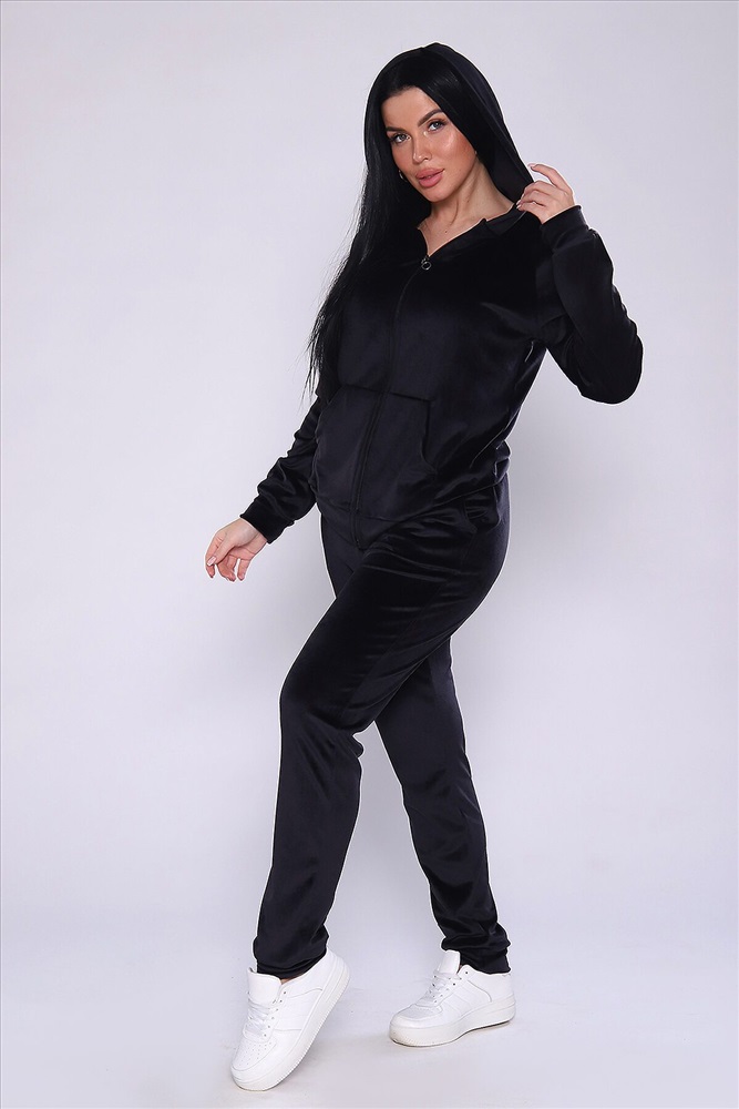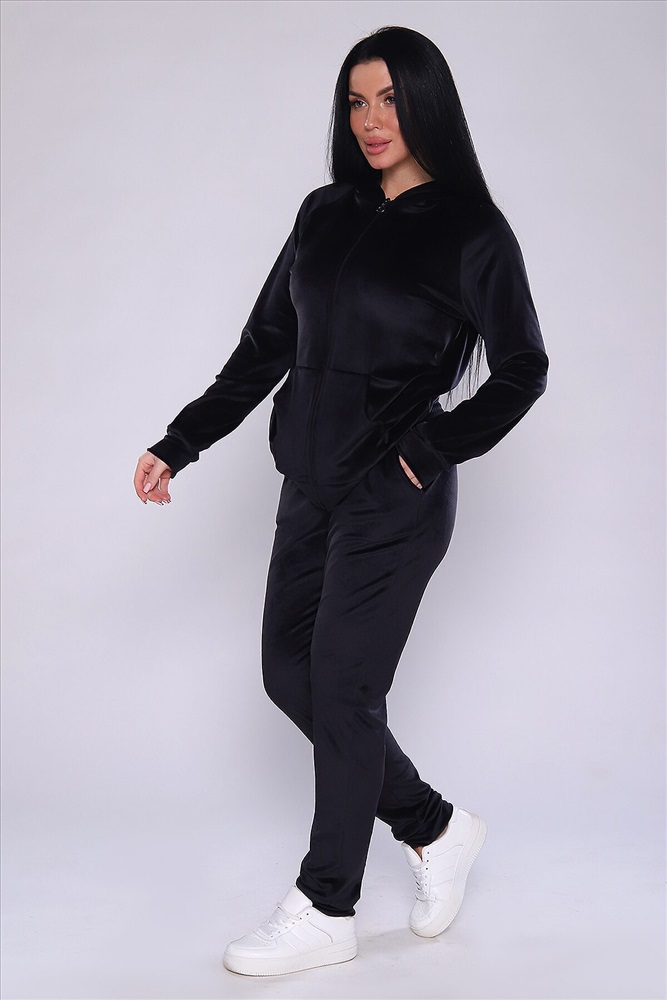 Костюм женский велюровый, повседневный, всесезонный. Костюм состоит из толстовки и брюк на широкой резинке. Толстовка на молнии, с двойным капюшоном, и с карманами кенгуру. Брюки - джоггеры на манжетах, карманы с отрезным бочком. Костюм универсальный, для прогулок, для занятия фитнесом, для дома. Замеры талии на брюках производятся по не растянутой резинке. Параметры модели 97-71-101. На модели представлен 48 размер.