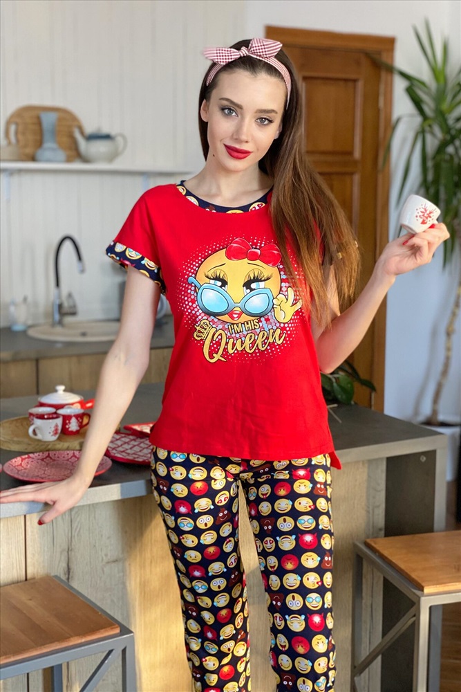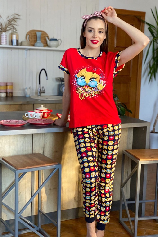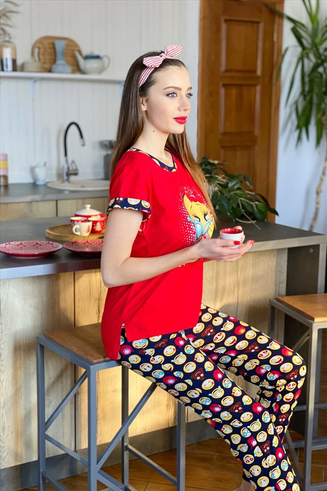 ID товара: 882901 Состав: 100% Хлопок Сезон: Весна/Лето Длина: Средняя Фасон: Прямой Рукав: Короткий Крой брючин: Прямой Рисунок: Фантазийный Основная ткань: Кулирка Стиль: Повседневный Страна бренда: Россия Страна производства: Россия Костюм женский состоит из футболки и брюк. На полочке принт. Брюки на манжете, карманы в боковых швах. Комментарии к товару