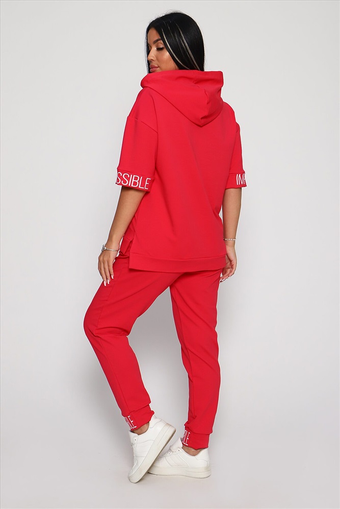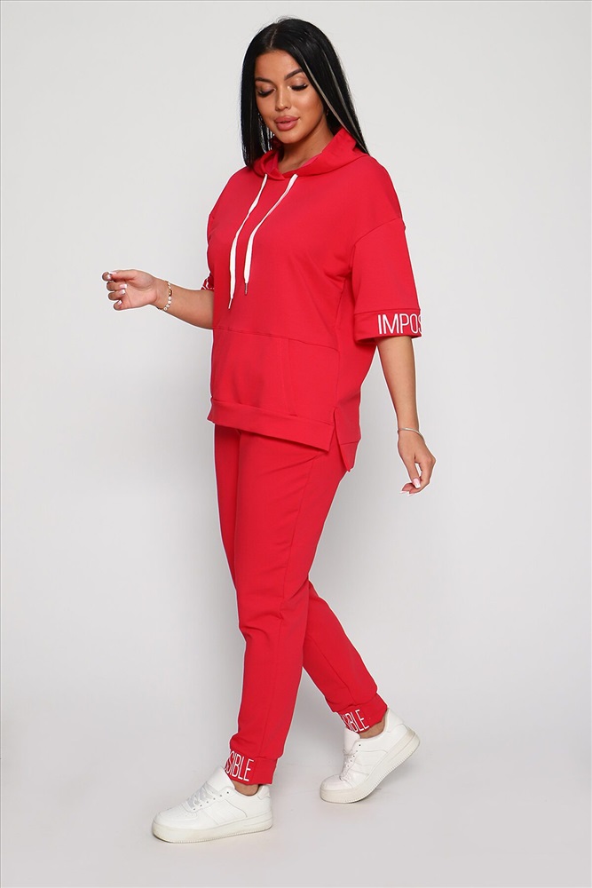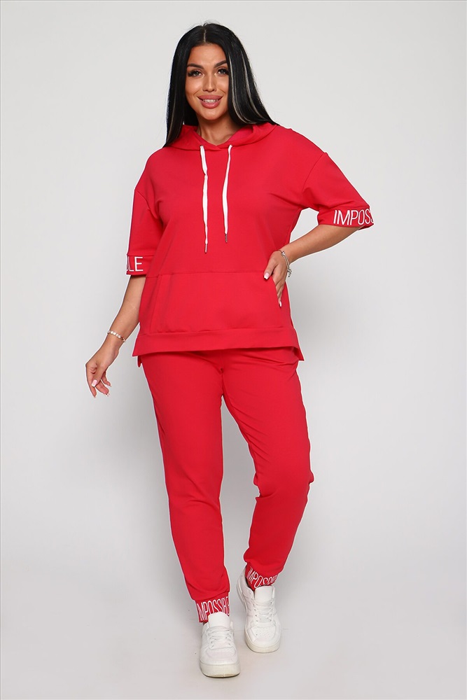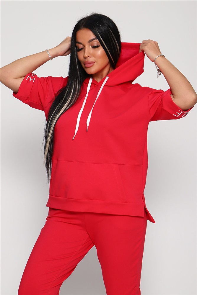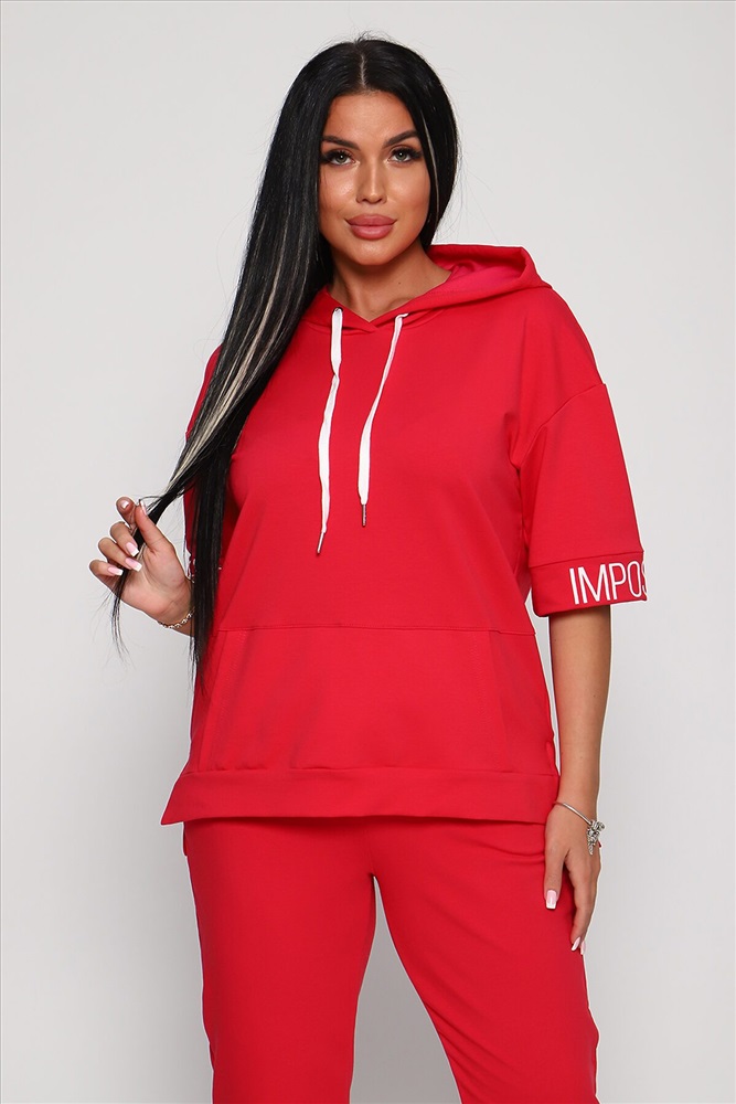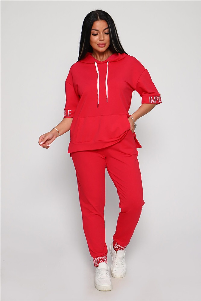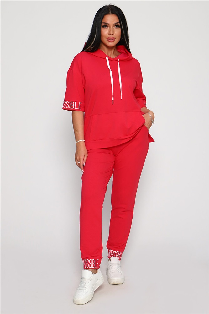Костюм женский их футера 2‑х нитки с лайкрой. Очень интересная модель, кофта удлинённая по бокам разрезы, рукава до локтя, на манжетах принт, карман кенгуру, брюки с карманами прямой посадки снизу на манжетах. На модели 48-50 размер.