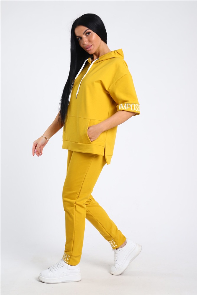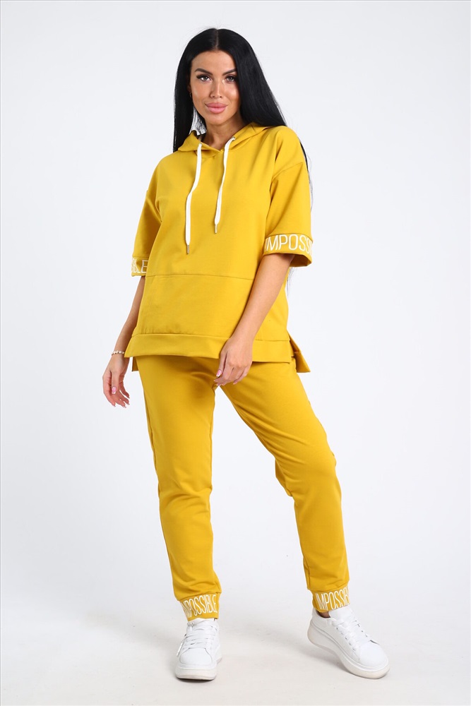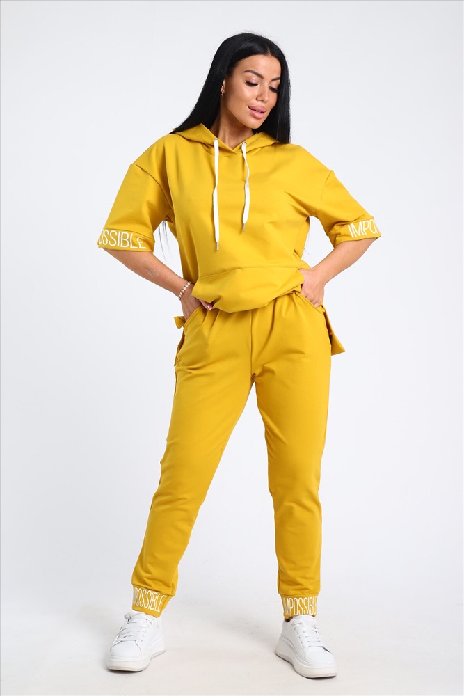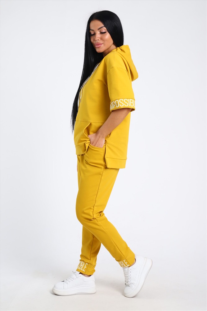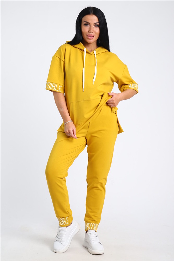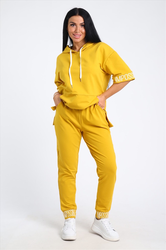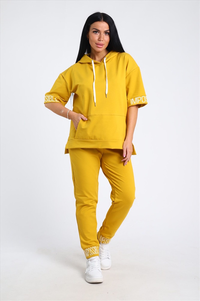 Костюм женский их футера 2‑х нитки с лайкрой. Очень интересная модель, кофта удлинённая по бокам разрезы, рукава до локтя, на манжетах принт, карман кенгуру, брюки с карманами прямой посадки снизу на манжетах. На модели 48-50 размер.