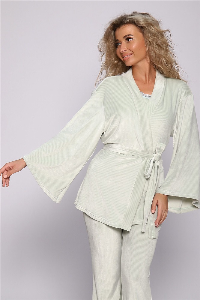 Домашний женский костюм тройка, халат на запах, топ на бретелях и брюки клеш от колена. Ткань однотонный мягкий жаккардовый велюр, который точно обеспечит тепло, удобство и комфорт, а так же подчеркнет женственность обладательницы. Халат прямого силуэта. Свободный крой, фиксируется поясом и держателями в боковых швах. Плечо халата слегка спущено, рукав широкий в стиле кимоно. По переду халата расположена планка, которая лаконично сочетается в одном изделии, что не маловажно для этического восприятия. Топ прямого силуэта на тонких бретелях, горловина переда и спинки, украшены кружевом в тон основного материала. Брюки клеш, размер в размер, талия на эластичной резинке, шириной 2 см, клеш начинается от колена, который ненавязчиво сочетается с рукавом верхнего изделия. Размерный ряд данного комплекта от 44 до 58 размера. В зависимости от величины размера, на спинке допускается стачной шов. На фото, модель представлена в 46 размере!
