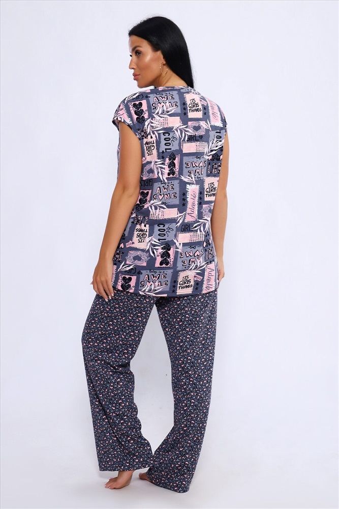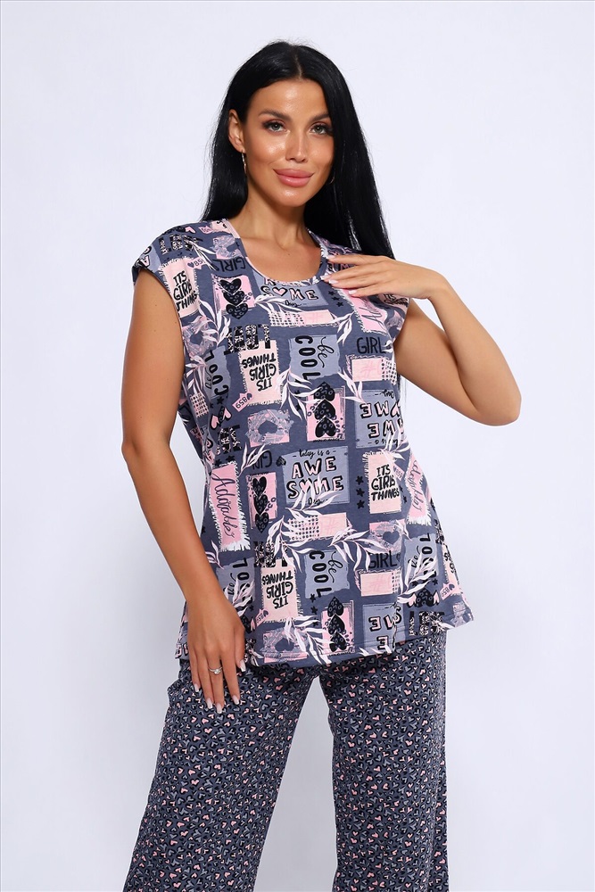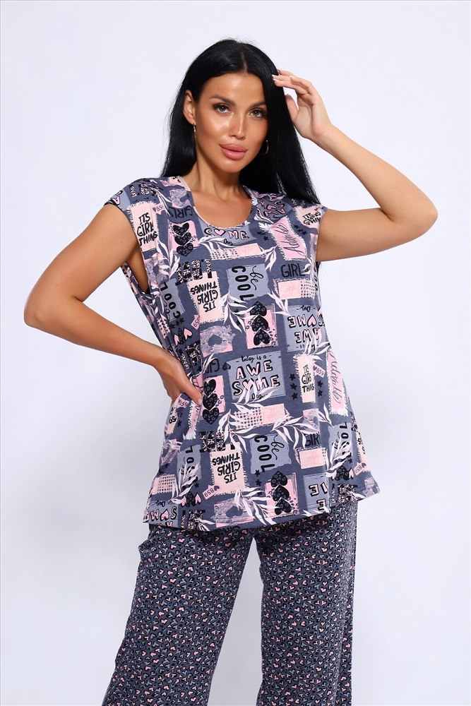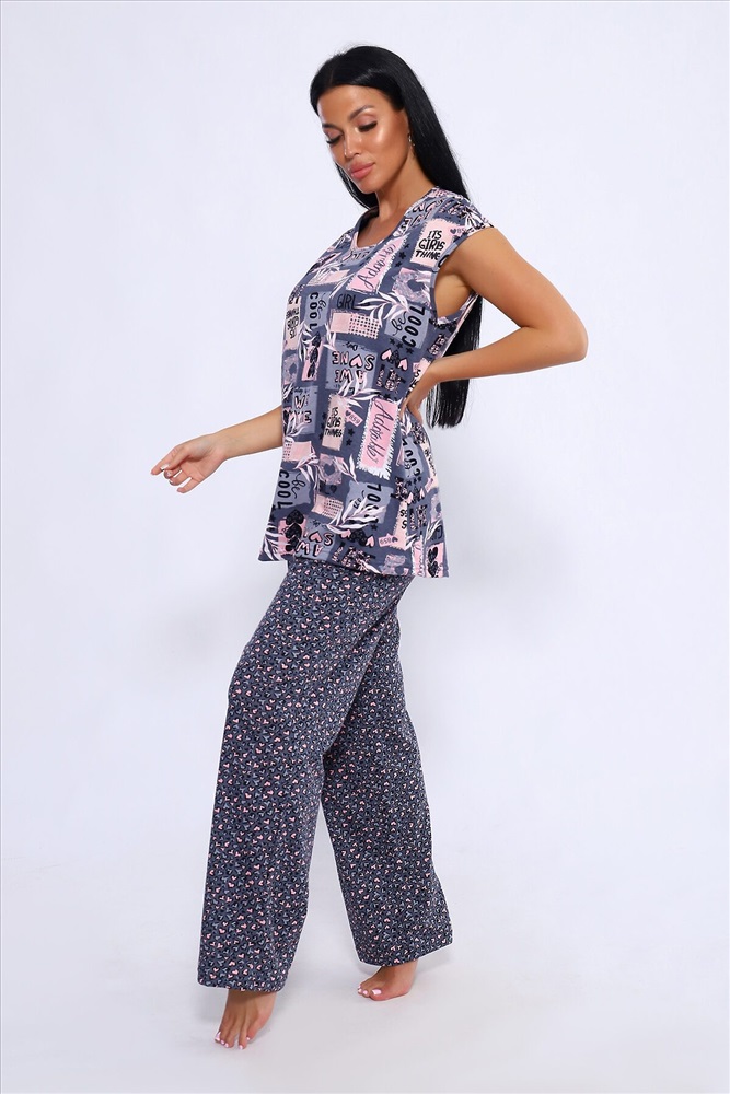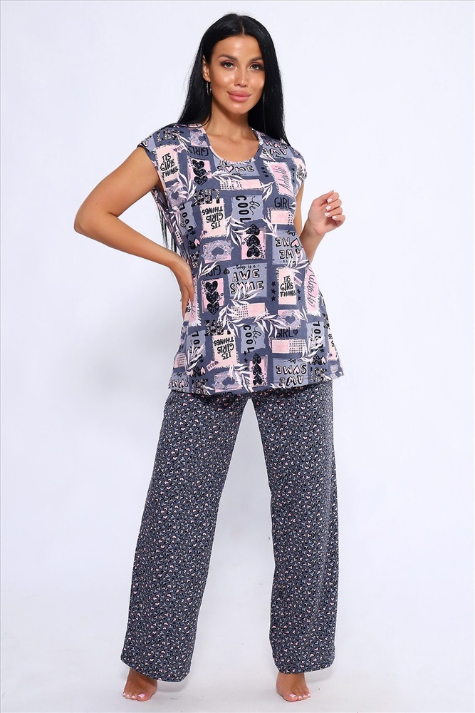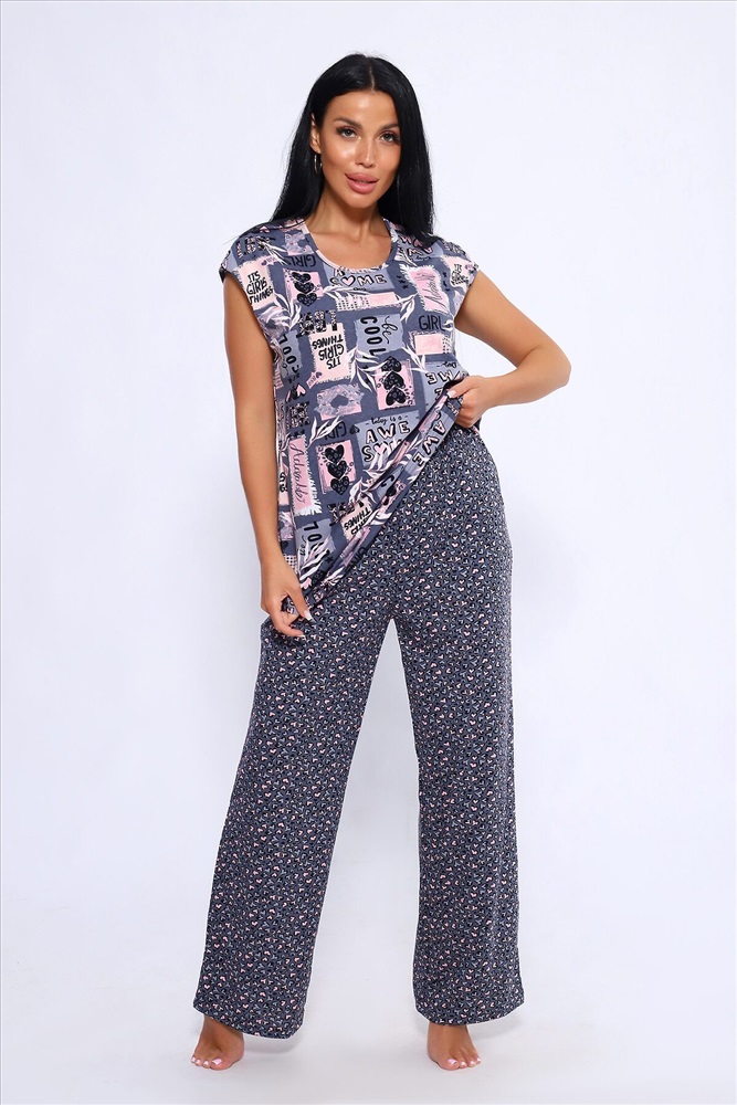 ID товара: 1023996 Состав: Хлопок 100% Сезон: Демисезон Длина: Полная Фасон: Свободный Рукав: короткие Крой брючин: Широкий Рисунок: Абстракция Тип карманов: В шве Декоративные элементы: Принт Основная ткань: Хлопок Вид ткани: Кулирка Страна бренда: Россия Страна производства: Россия Женский костюм из 100% хлопка, длинные широкие брюки на эластичной резинке по талии шириной 3 см., с карманами в боковых швах и футболкой со спущенным плечом. Брюки в двух расцветках. Интересное и актуальное цветовое сочетание серых и розовых оттенков отличный вариант. Брюки и футболку можно сочетать и с другими предметами вашего гардероба. Ткань не просвечивает и имеет эластичность, обеспечит комфортное времяпрепровождение вашего досуга как дома так и на отдыхе. На фото модель представлена в 48 размере. Комментарии к товару