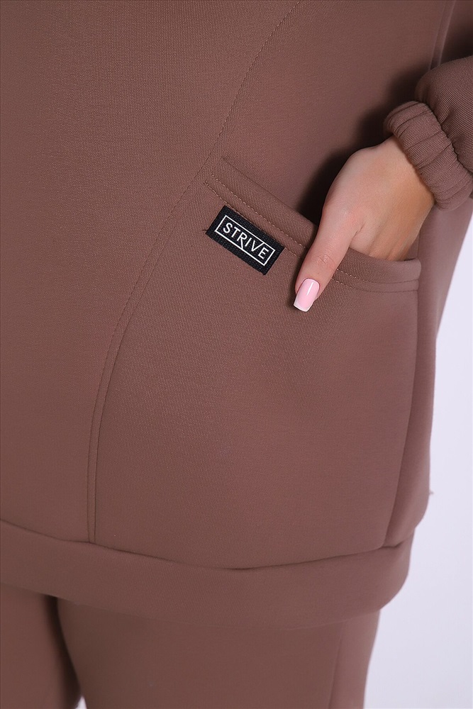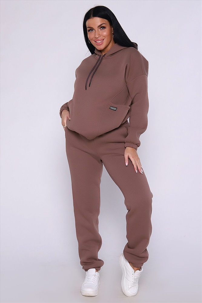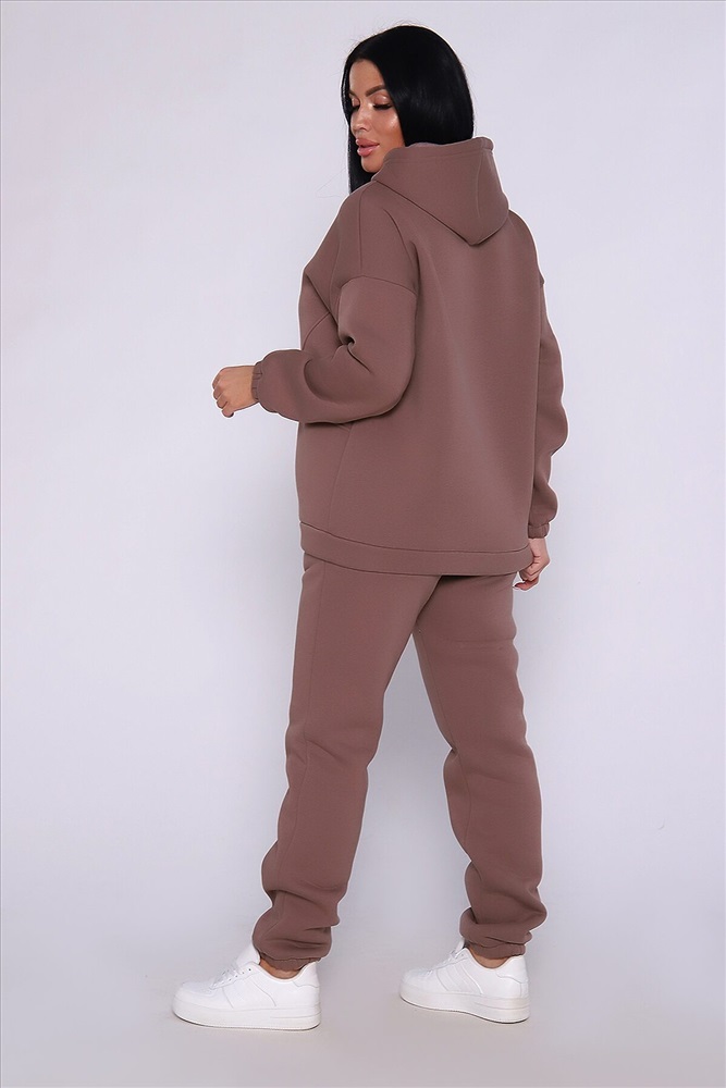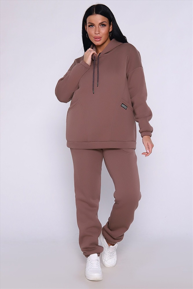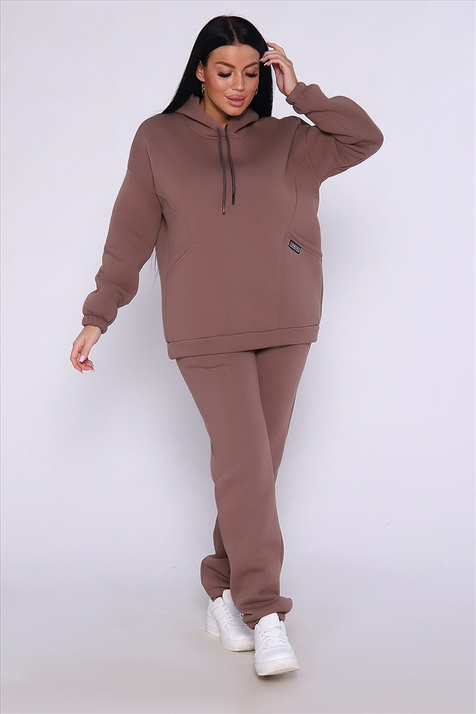 Теплый костюм выполнен из футера 3-х нитки с начесом с содержанием хлопка премиум качества. Костюм состоит из объёмной толстовки в стиле оверсайз с накладными карманами и джогеров. Низ брюк и рукавов на толстовке обработан резинкой. Пояс брюк на резинке, для удобства по бокам расположены прорезные карманы. Перед использованием желательно постирать костюм при 30 градусах, тогда излишний ворс примнется.