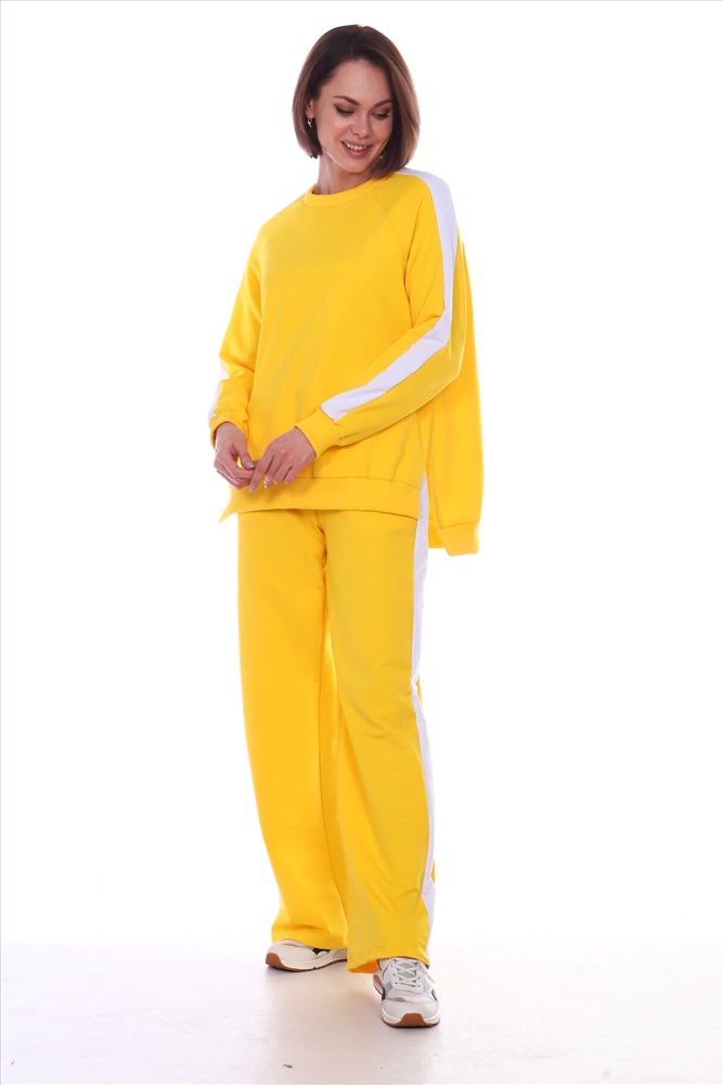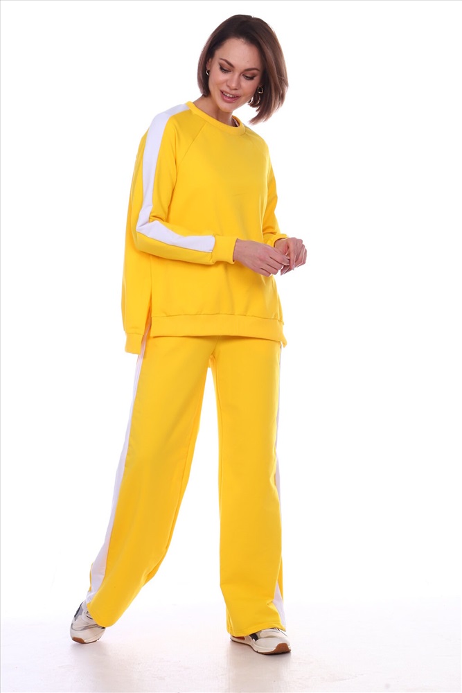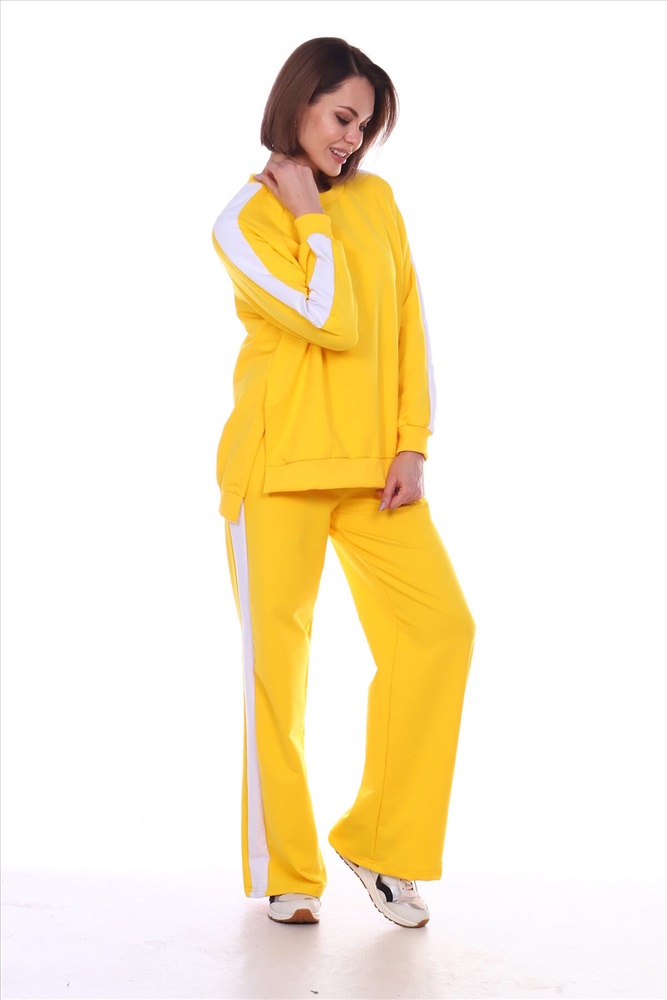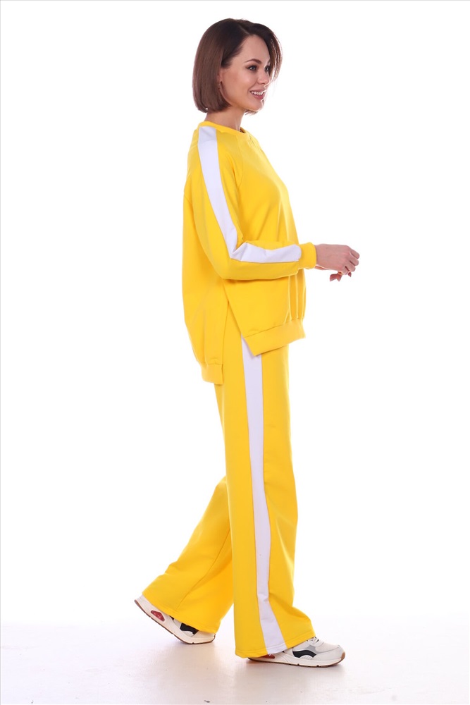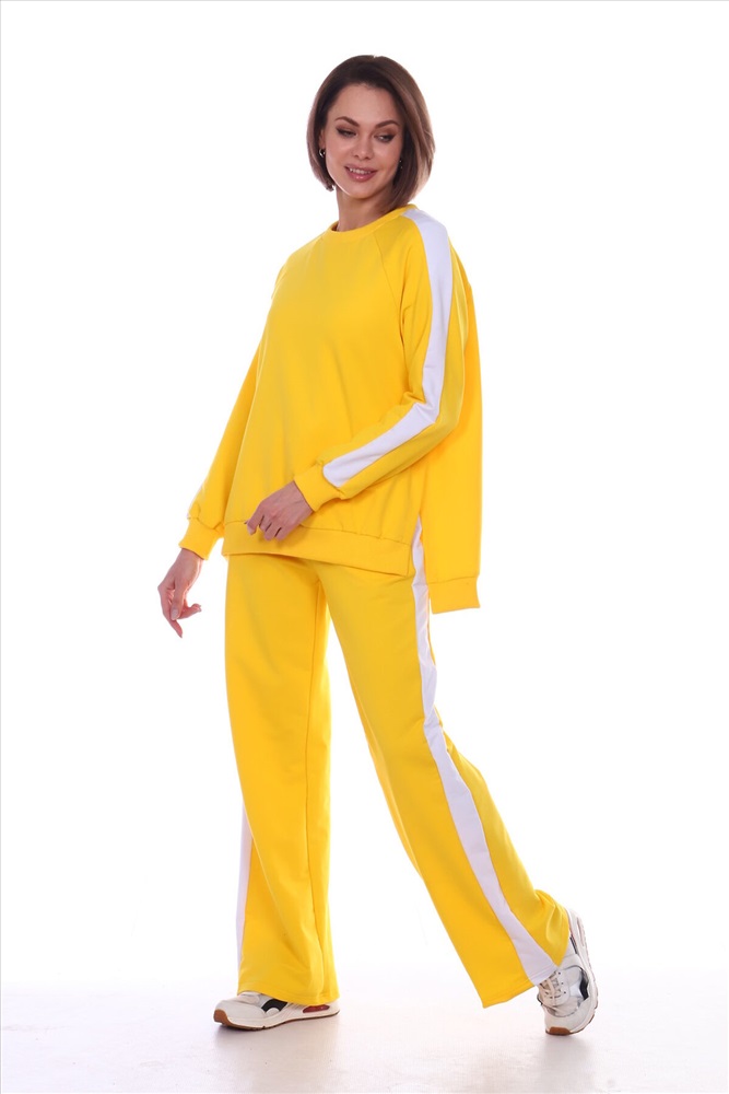 Универсальный костюм женский для повседневной жизни, выполнен из футера 2х нитки с лайкрой (без начеса). Костюм прогулочный в стиле OVERSIZE - просто идеальное решение для пополнения вашего гардероба. Комплект состоит из широких брюк и уютного свитшота. Свитшот свободного объема, прямого силуэта с рукавом реглан. По центру рукава по всей длине проходит контрастная белая вставка (лампас). Низ рукава обработан манжетой из хлопкового кашкорсе в рубчик. Разрезы в шлице по бокам делают свитшот стильным и элегантным. Более длинная спинка поможет скрыть недостатки фигуры. Брюки прямого силуэта имеют притачной пояс на резинке и боковые карманы с отрезным бочком. Тканевые лампасы очень актуальны в этом сезоне. В них кроется особая прелесть, они позволяют привычным вещам играть по-новому, более интересно. Вертикальные полоски отлично удлиняют силуэт. Такой наряд гарантирует вам максимальный комфорт и уют. Он позволит вам подчеркнуть свой стиль, создавая действительно запоминающиеся образы. Модный костюм с брюками и кофтой прекрасно сочетается с кроссовками и кедами, а брюки можно носить с туфлями на каблуках дополнив их элегантным топом. В костюме с лампасами любая девушка сразу же превращается в грациозную и уверенную в себе леди, которая знает толк в модной одежде и имеет врожденное чувство стиля. Обращаем ваше внимание модель оверсайз, предполагает свободную посадку.