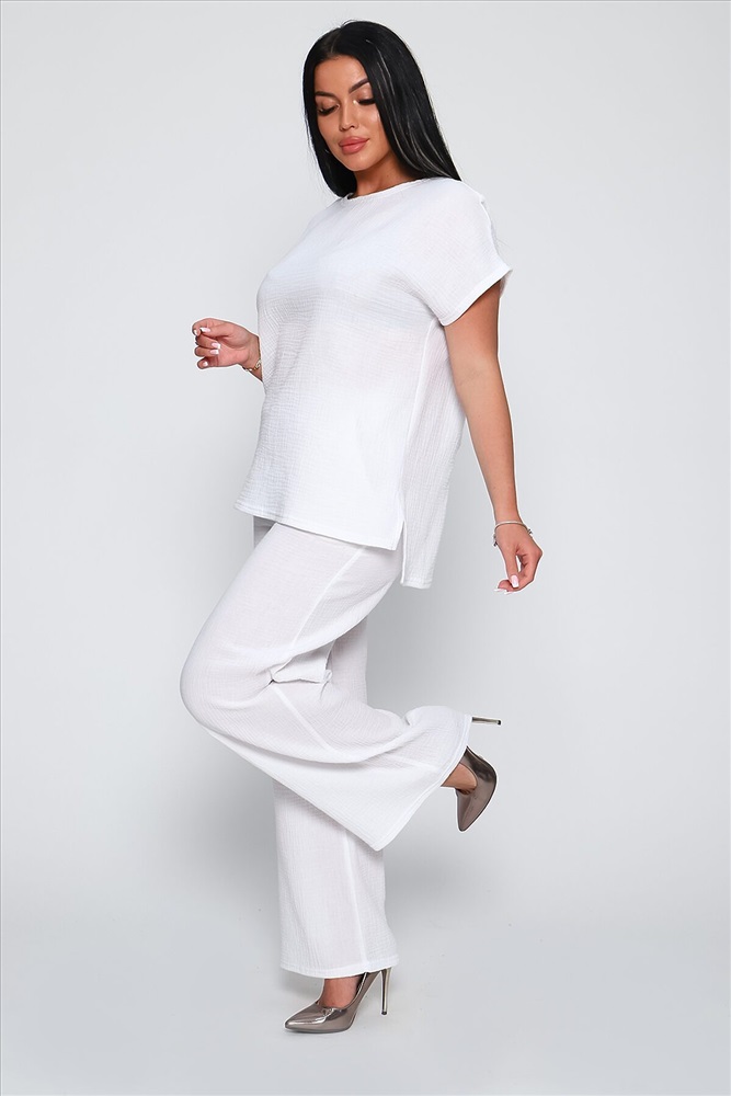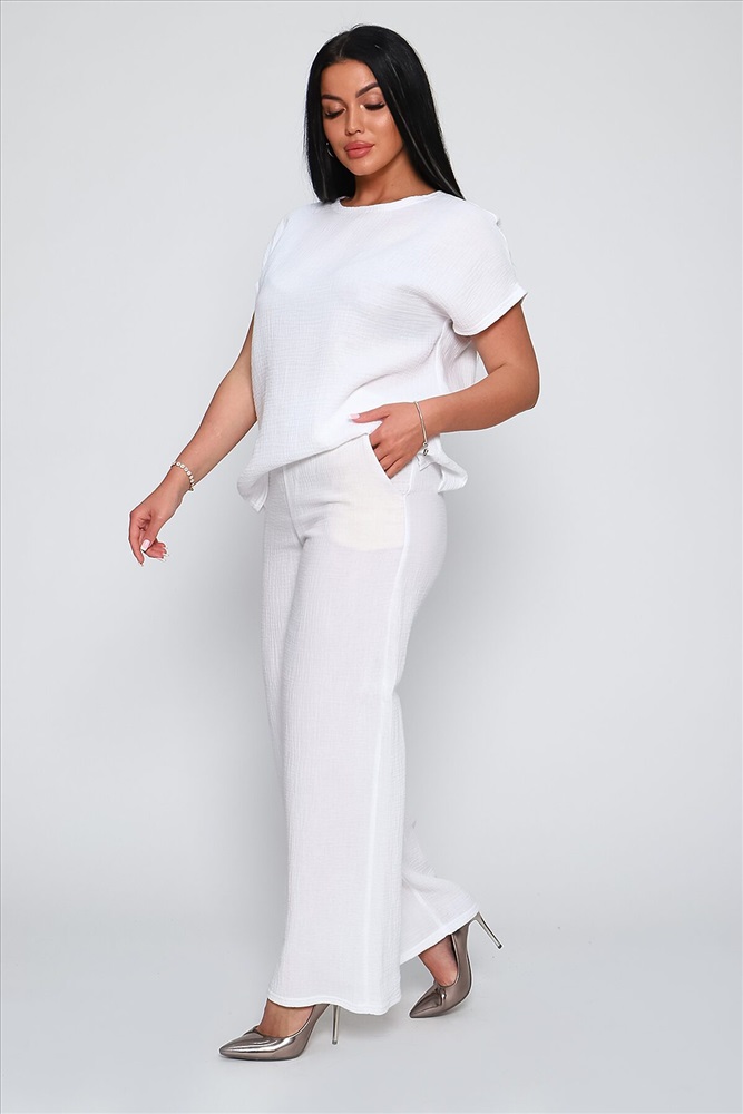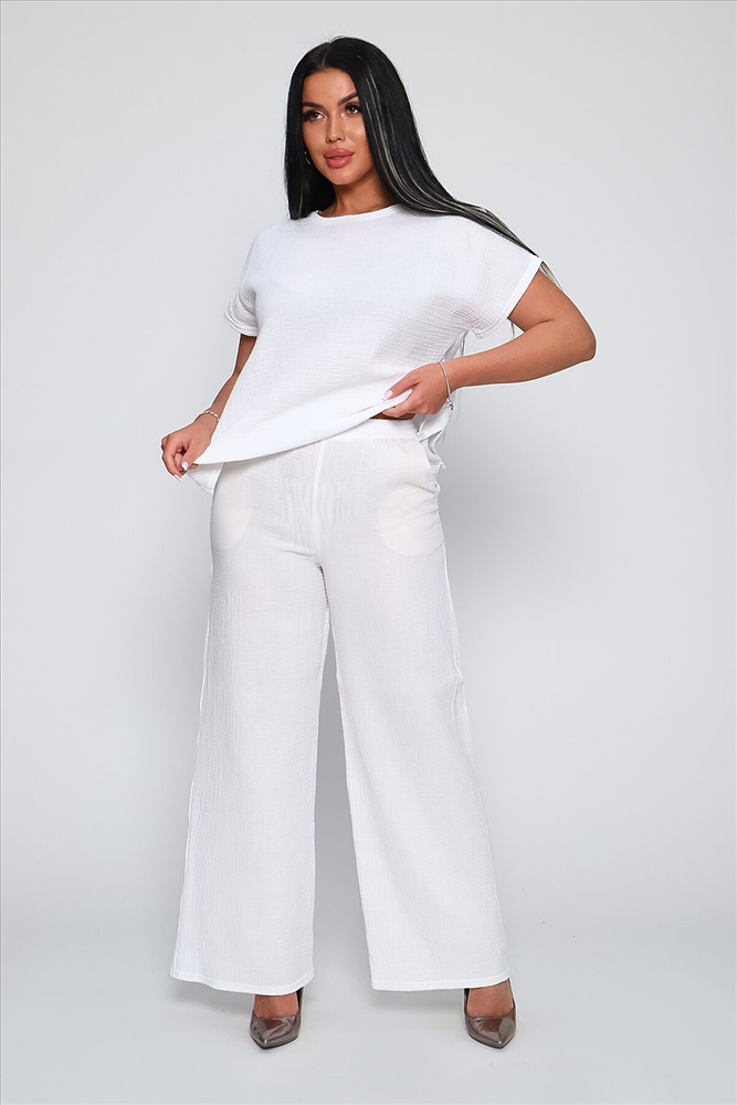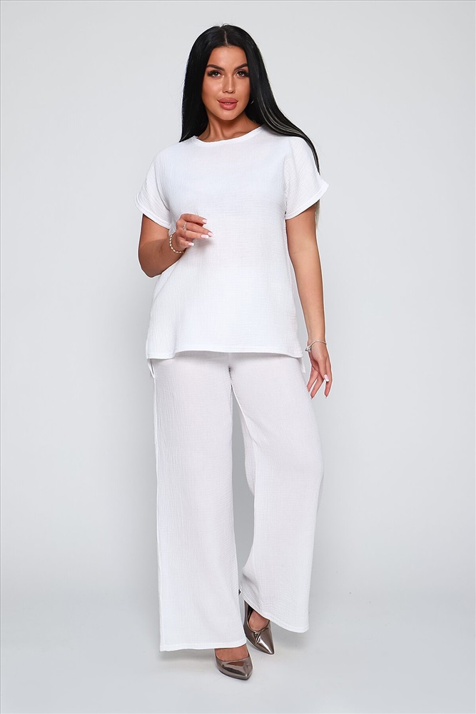 ID товара: 894179 Состав: Хлопок 100% Сезон: Весна/Лето Длина: Средняя Фасон: Свободный крой Рукав: Короткий Крой брючин: Прямой Тип карманов: В боковом шве Основная ткань: Хлопок Стиль: Повседневный Вид ткани: Муслин Страна бренда: Россия Страна производства: Россия Костюм брючный из качественной, гипоаллергенной, дышащей ткани муслин двухслойный. Стильный комплект состоит из футболки и брюк - палаццо. Футболка в стиле оверсайз, горловина лодочка, спущенная пройма, цельнокройный короткий рукав, спинка чуть длиннее переда, по бокам небольшие разрезы. Брюки - палаццо с боковыми карманами, удобная посадка, широкий на резинке распошитый пояс. Комфортный, летний костюм необходимая вещь в женском гардеробе, подойдет на любую фигуру, скроет недостатки и подчеркнёт достоинства фигуры. Изделие из однотонной, хлопковой ткани муслин двухслойный не требует особого ухода, не дает усадку, не скатывается и не теряет форму после стирки. Костюм представлен в широкой палитре цветов, что позволит подобрать вещь на любой вкус и стиль, а также непременно подчеркнет женственность и романтичность вашего образа. Комментарии к товару