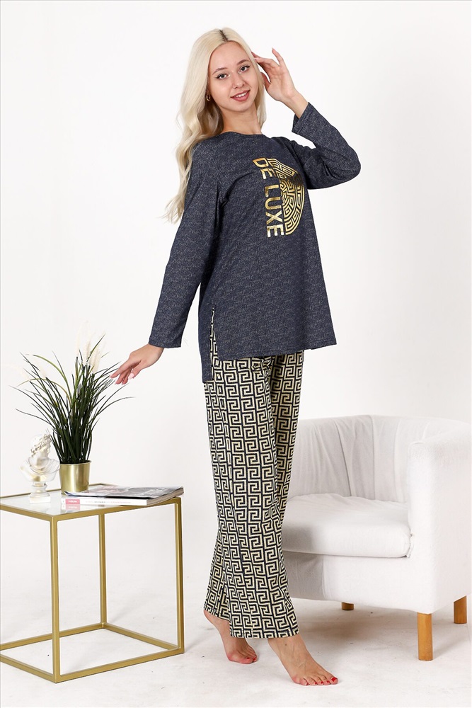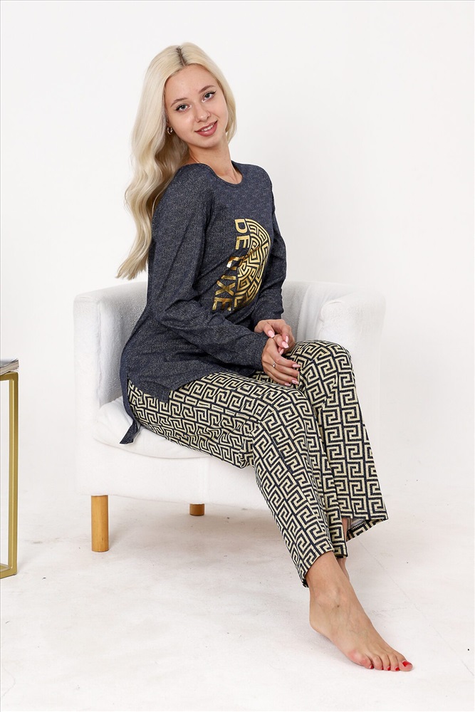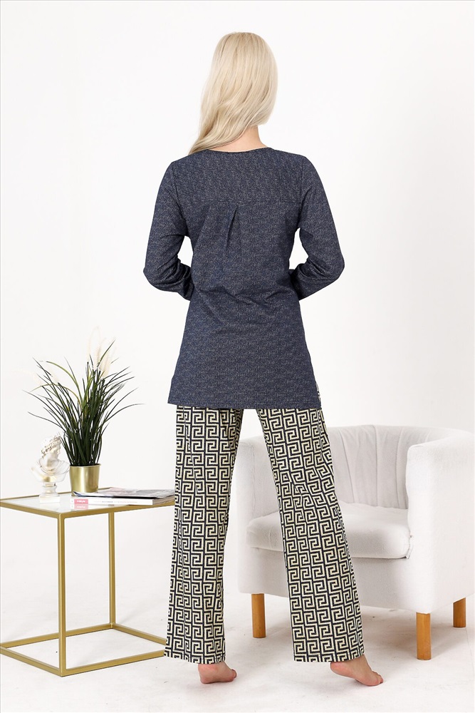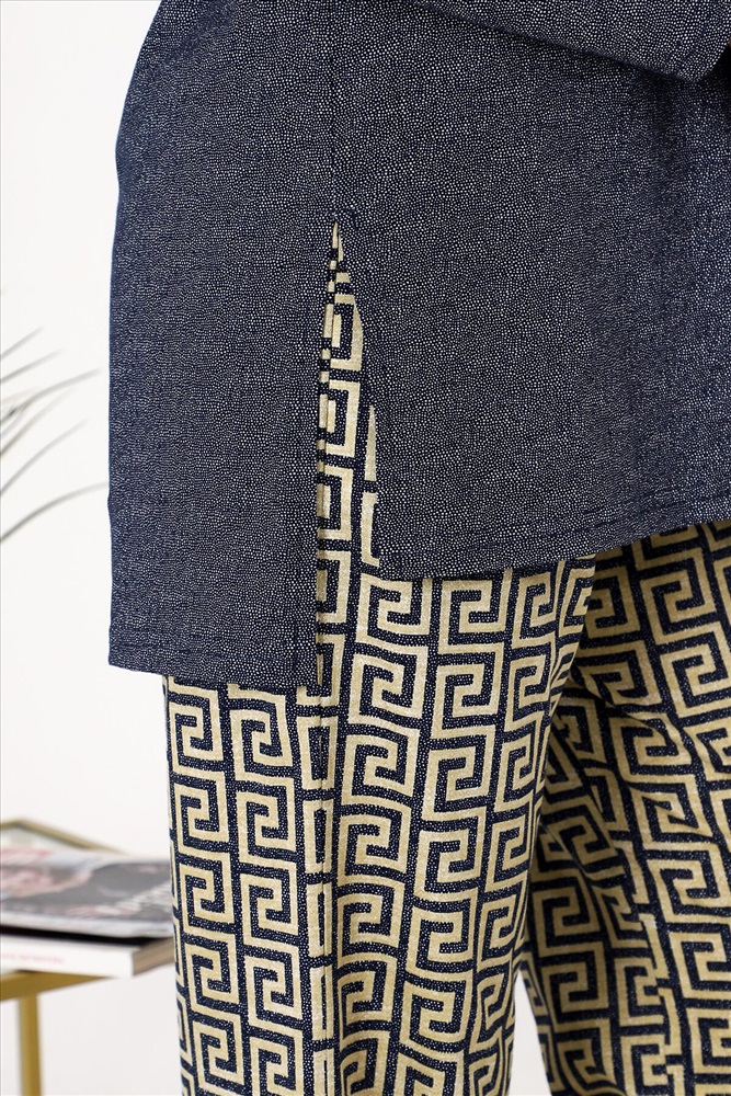 Страна производства: Россия Костюм состоит из туники и брюк. Туника прямого силуэта, с округлой горловиной, длиной до середины бедра и удлиненной спинкой. Спинка с кокеткой. Рукав втачной, длинный. Горловина обработана бейкой из основного полотна. Брюки свободные, прямые, с боковыми карманами, на поясе.
