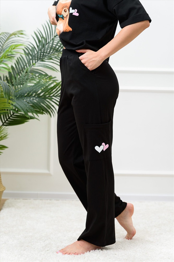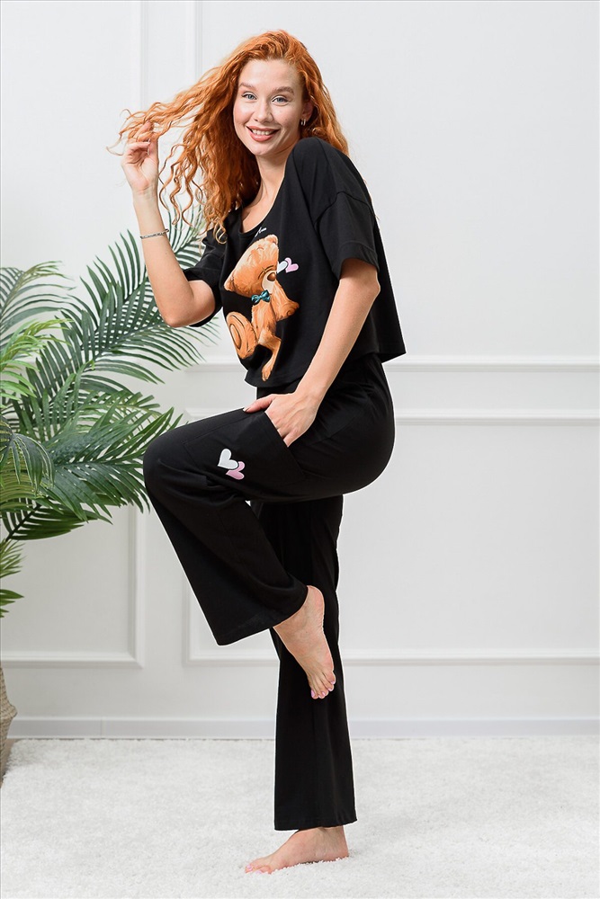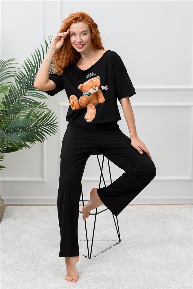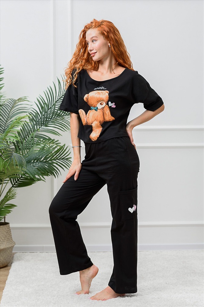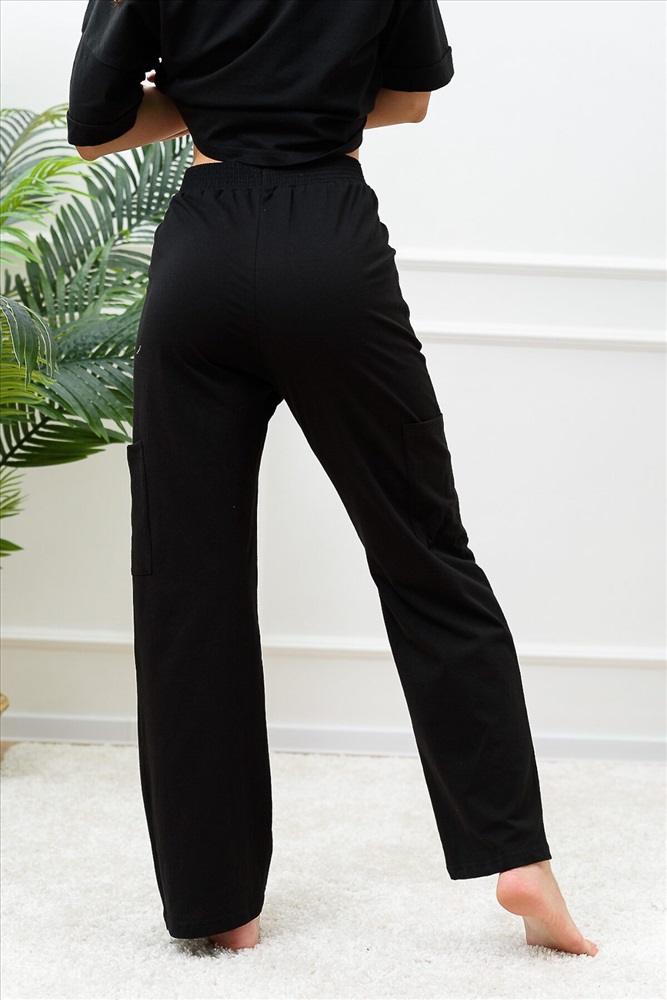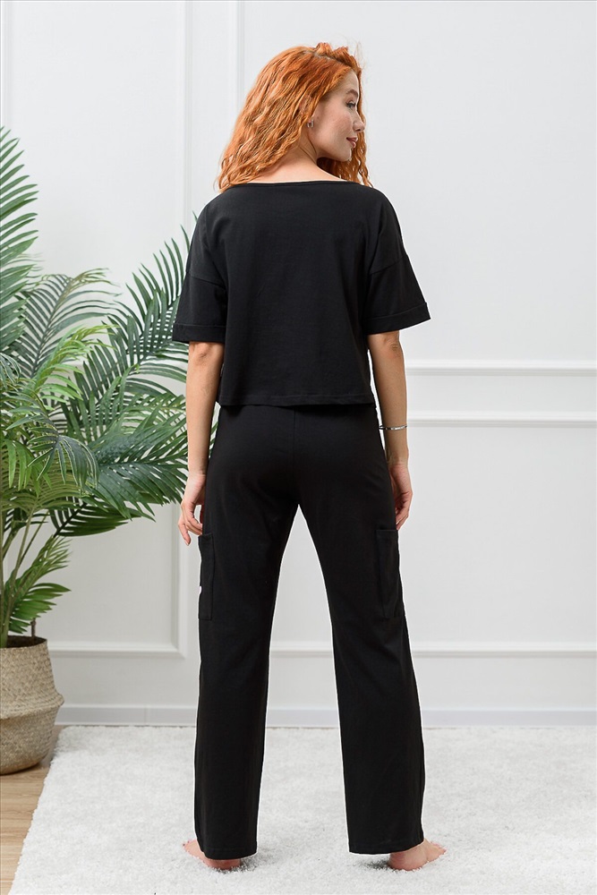 Костюм состоит из укороченной футболки оверсайз и брюк. Футболка с округлой горловиной. Рукав короткий, с манжетом. Горловина обработана бейкой из основного полотна. Брюки прямые, на поясе, с боковыми карманами, с накладными карманами по боковым швам.