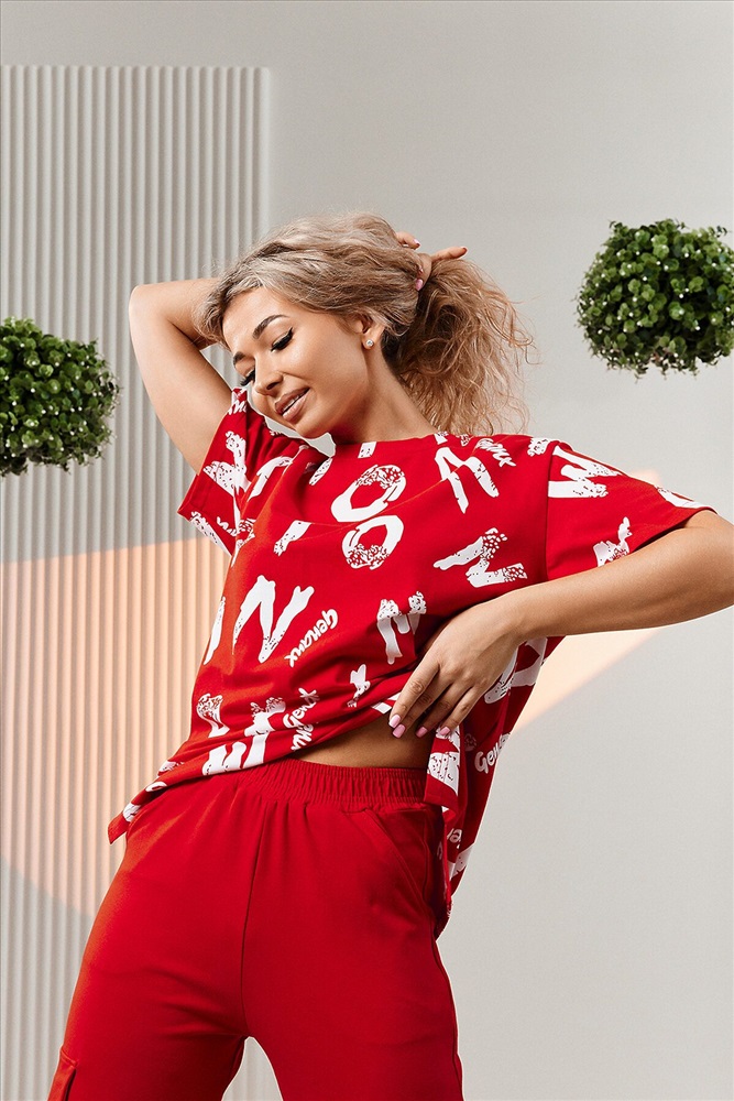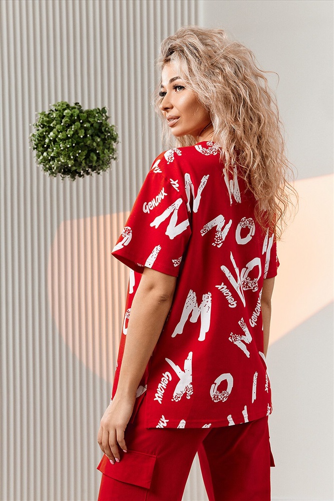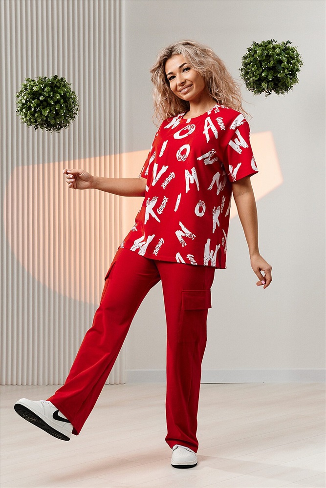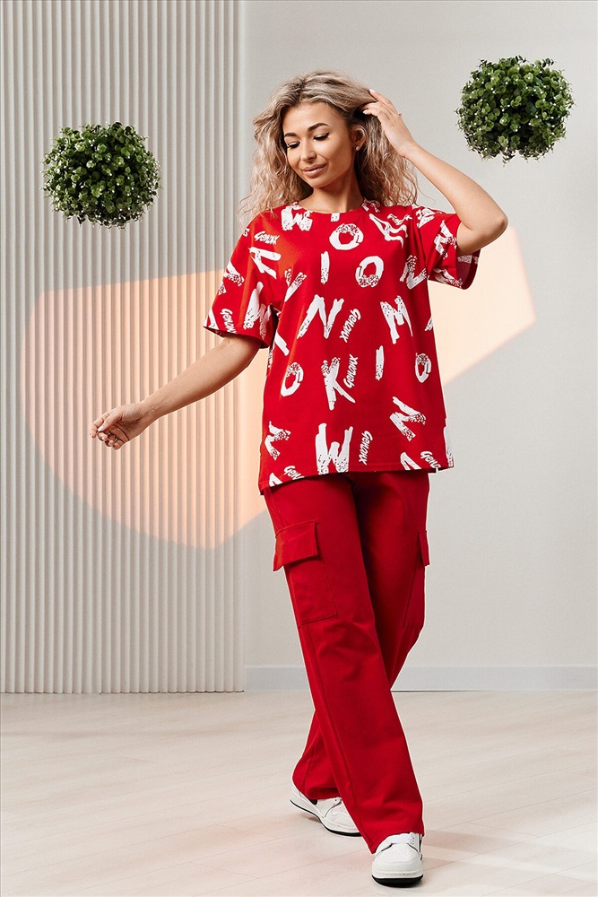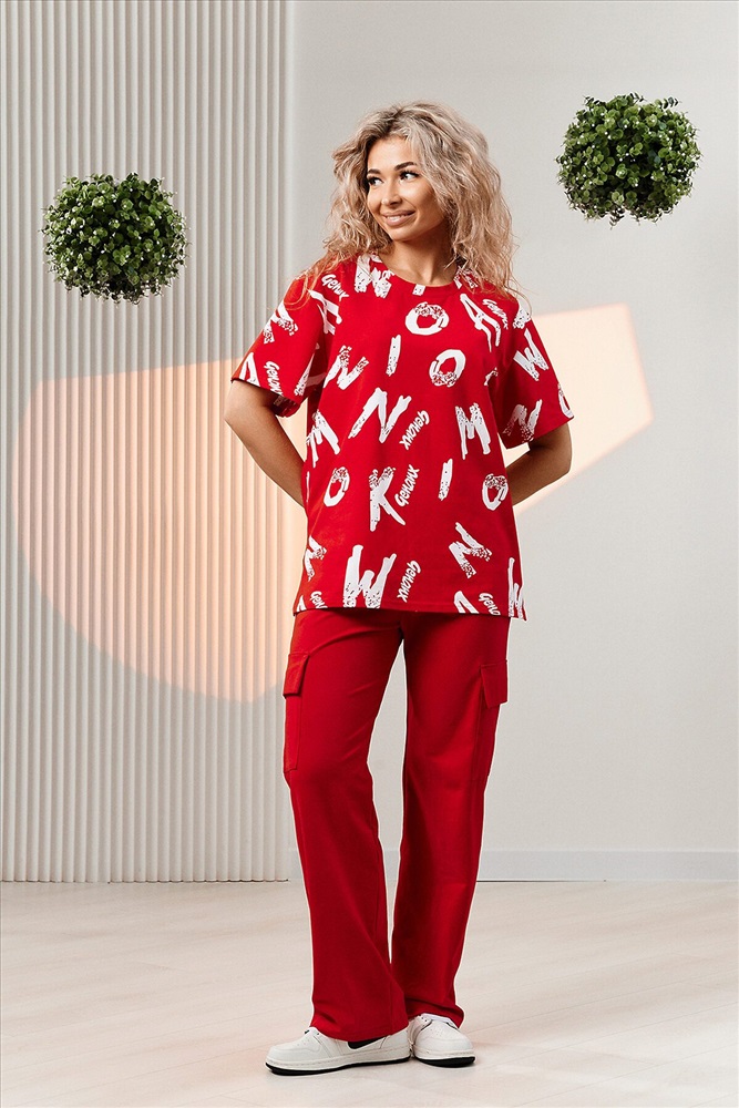 ID товара: 1002682 Состав: Хлопок 95%, Лаикра 5% Сезон: Весна/Лето Фасон: Прямой Рукав: Короткие Крой брючин: Прямой Рисунок: Фантазийный Тип карманов: Прорезные Вид ткани: Кулирка с лайкрой Страна бренда: Россия Страна производства: Россия Костюм состоит из футболки и брюк. Футболка прямая, свободная, с округлой горловиной. В нижней части боковых швов футболки обработаны разрезы. Рукав короткий. Горловина обработана обтачкой из основного полотна. Брюки прямые, на поясе, с боковыми карманами, с накладными карманами и клапанами по боковым швам. Комментарии к товару
