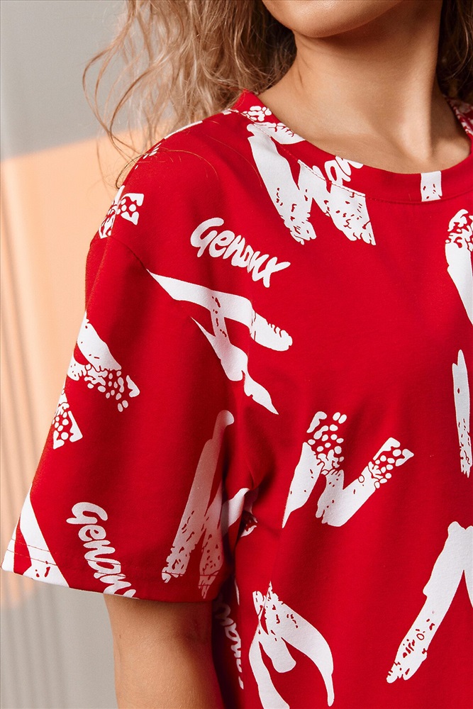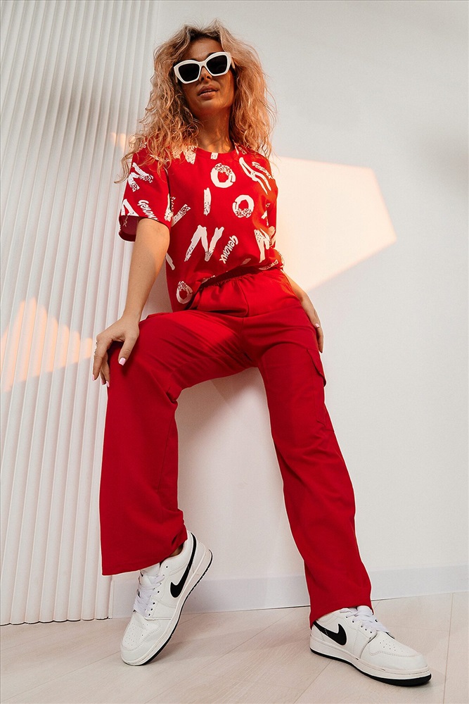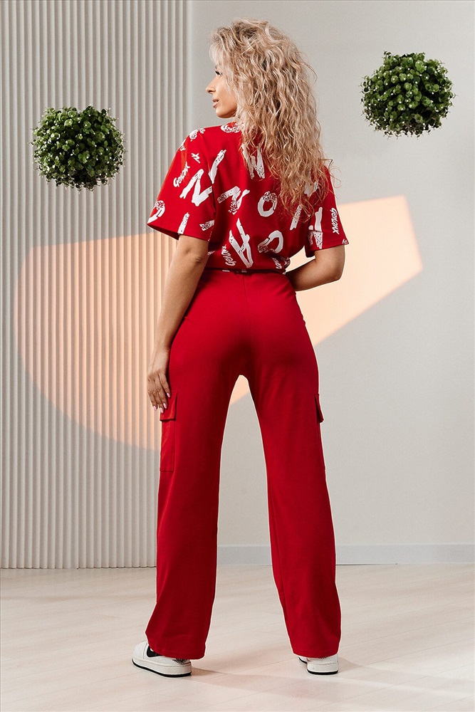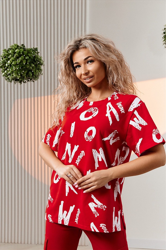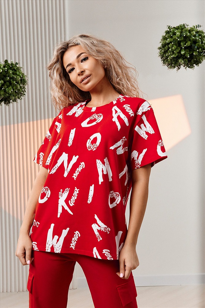 ID товара: 1002682 Состав: Хлопок 95%, Лаикра 5% Сезон: Весна/Лето Фасон: Прямой Рукав: Короткие Крой брючин: Прямой Рисунок: Фантазийный Тип карманов: Прорезные Вид ткани: Кулирка с лайкрой Страна бренда: Россия Страна производства: Россия Костюм состоит из футболки и брюк. Футболка прямая, свободная, с округлой горловиной. В нижней части боковых швов футболки обработаны разрезы. Рукав короткий. Горловина обработана обтачкой из основного полотна. Брюки прямые, на поясе, с боковыми карманами, с накладными карманами и клапанами по боковым швам. Комментарии к товару