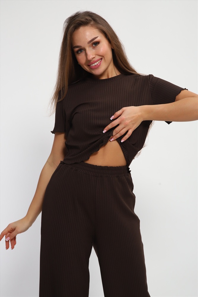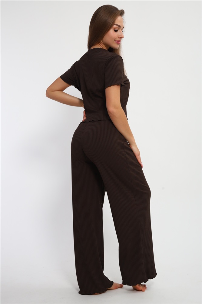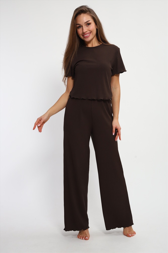 Застежка: без застежки Базовая однотонная женская пижама со штанами и футболкой идеальный стильный комплект для сна. Наши лёгкие брюки и красивая удобная футболка созданы для того, чтобы чувствовать себя комфортно и уютно. Благодаря широкой размерной сетки пижама подойдёт каждой девушке. Вискозная двойка из ткани с фактурой лапша практически не мнётся и быстро сохнет, что очень удобно. Рубчик добавляет интересный акцент, а трендовый шоколадный цвет делают этот костюм по-настоящему привлекательным.