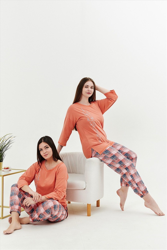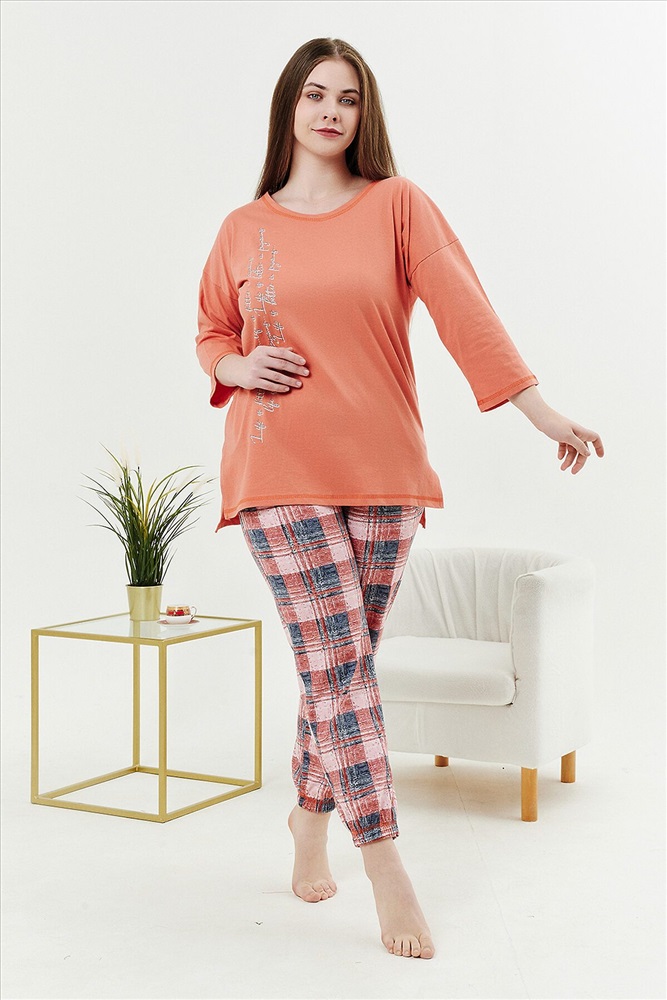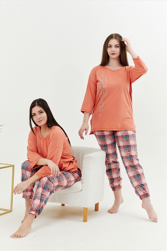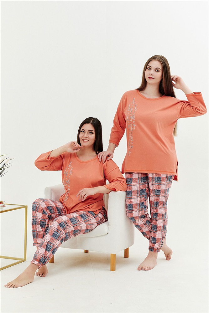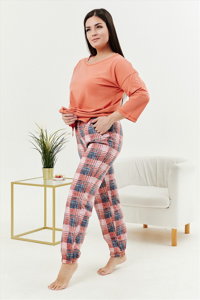 Страна производства: Россия Костюм женский: туника и брюки. Туника прямого силуэта с округлой горловиной, в боковых швах разрезы, на полочке стильный принт. Брюки из ткани в клетку, на поясе, простроченном на многоигольной машине. Низ брюк собран на эластичную тесьму. На передней половинке брюк внутренние карманы.