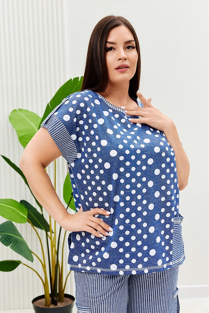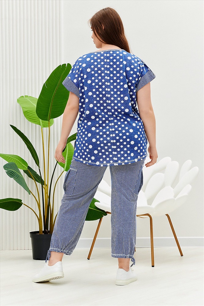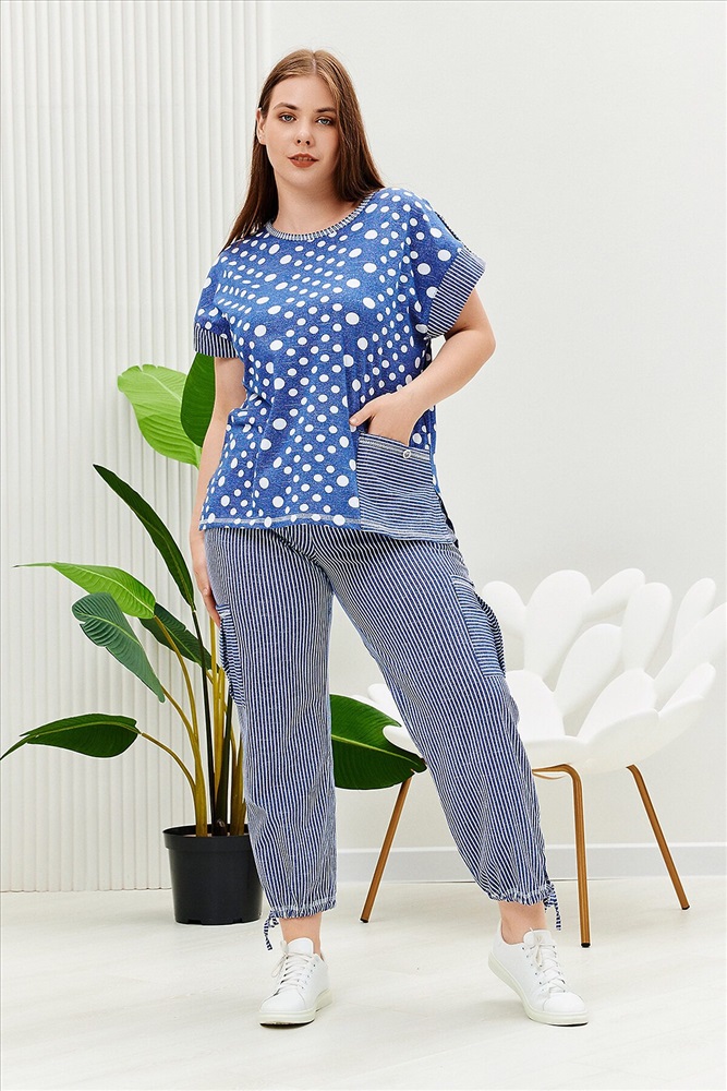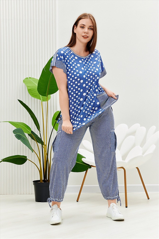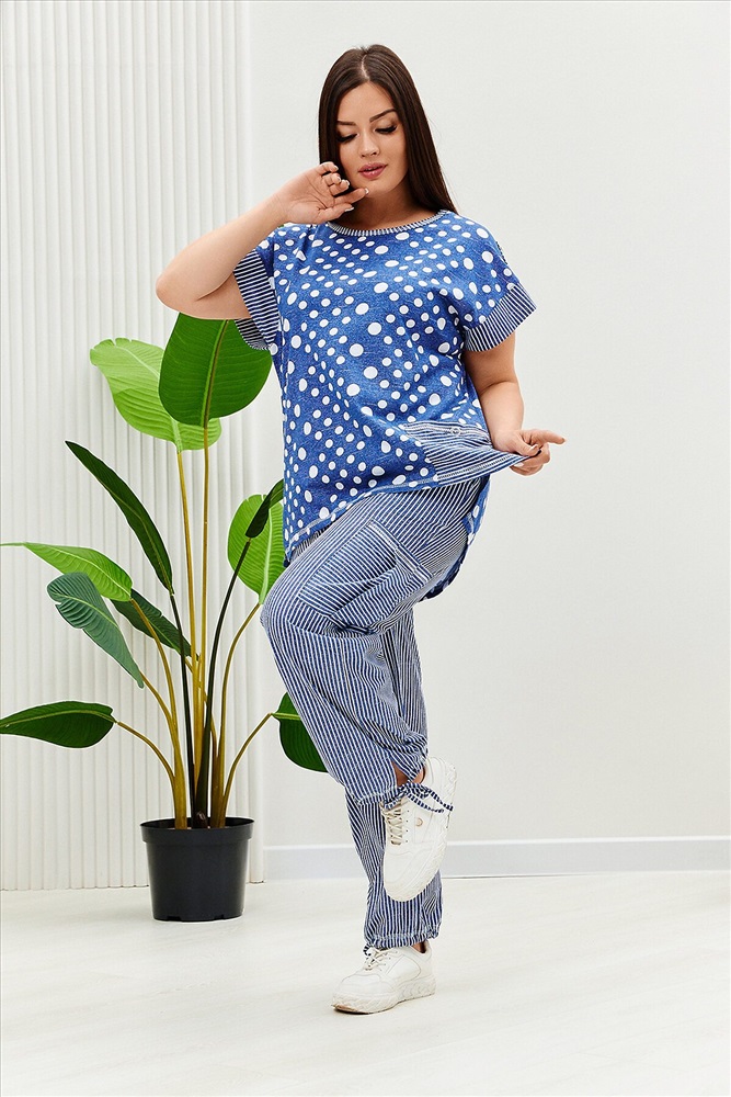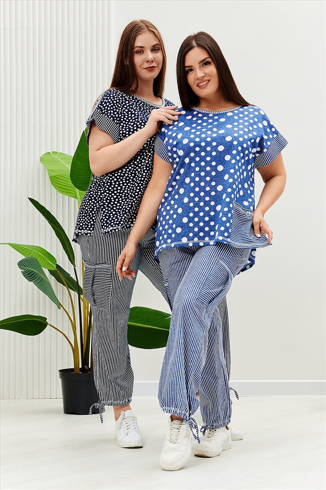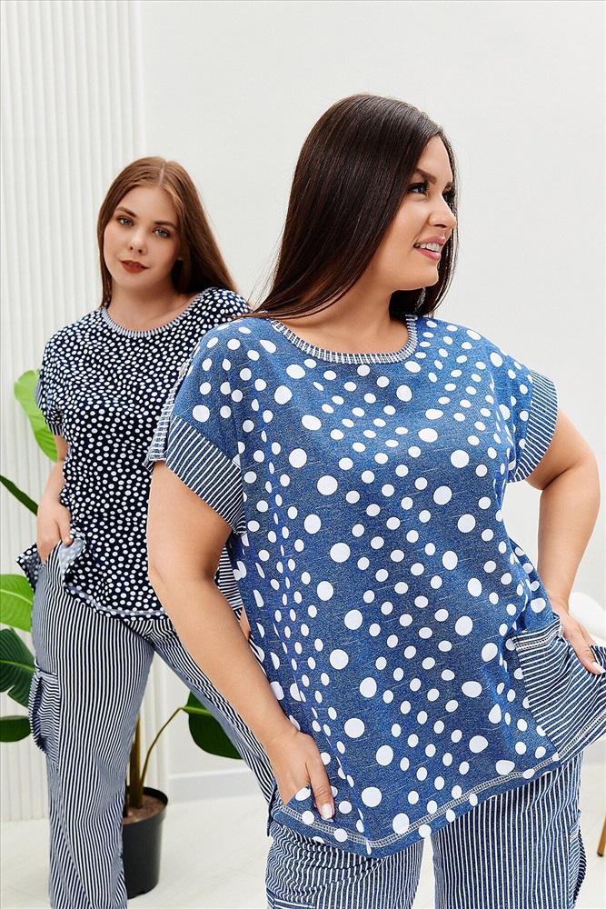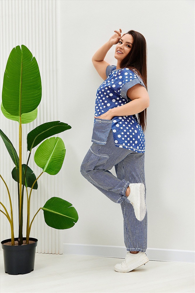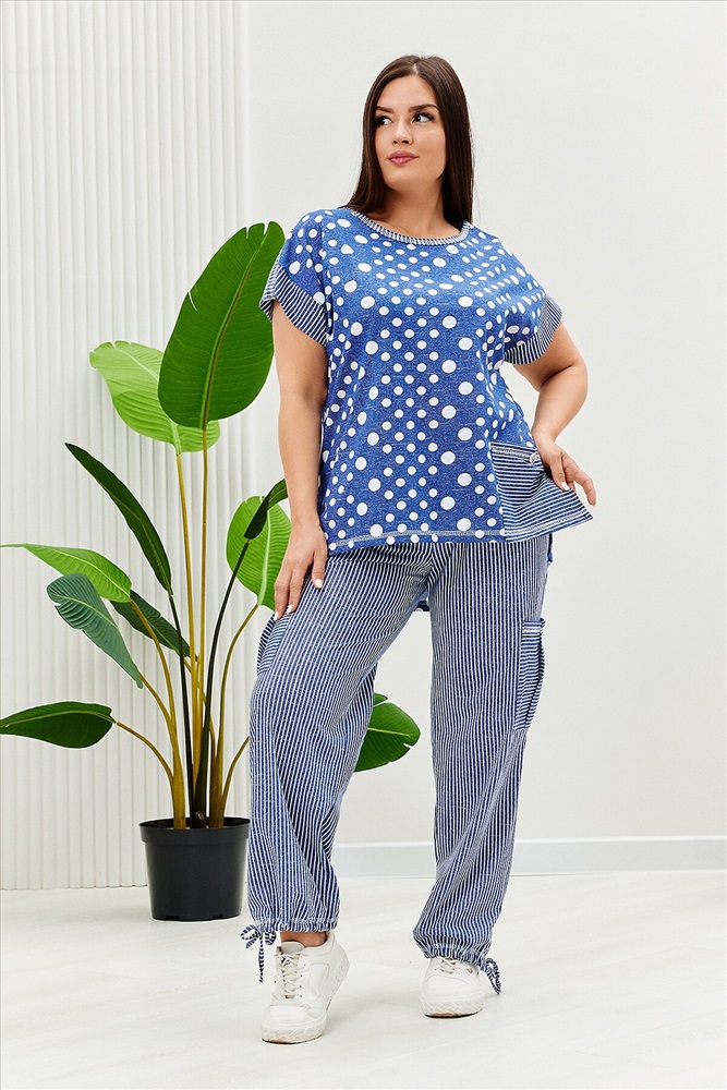 ID товара: 910808 Состав: Хлопок 100% Сезон: Весна/Лето Длина: Полная Фасон: Свободный крой Рукав: короткие Крой брючин: Широкий Рисунок: Горох Тип карманов: накладной Декоративные элементы: Завязки Основная ткань: Хлопок Стиль: повседневный Вид ткани: Кулирка Страна бренда: Россия Страна производства: Россия Костюм женский, туника и брюки. Туника прямого силуэта. Вырез горловины округлый. Рукав цельнокроенный короткий. С одной стороны на полочке сбоку накладной карман. Брюки в полоску, прямого силуэта, внизу брюк разрезы и утяжки. На передних частях внутренние карманы и боковые с бантовой складкой. Пояс выполнен на многоигольной машине. Комментарии к товару