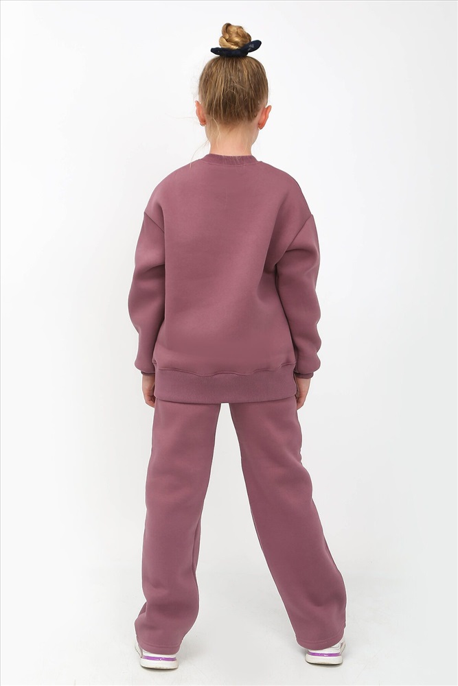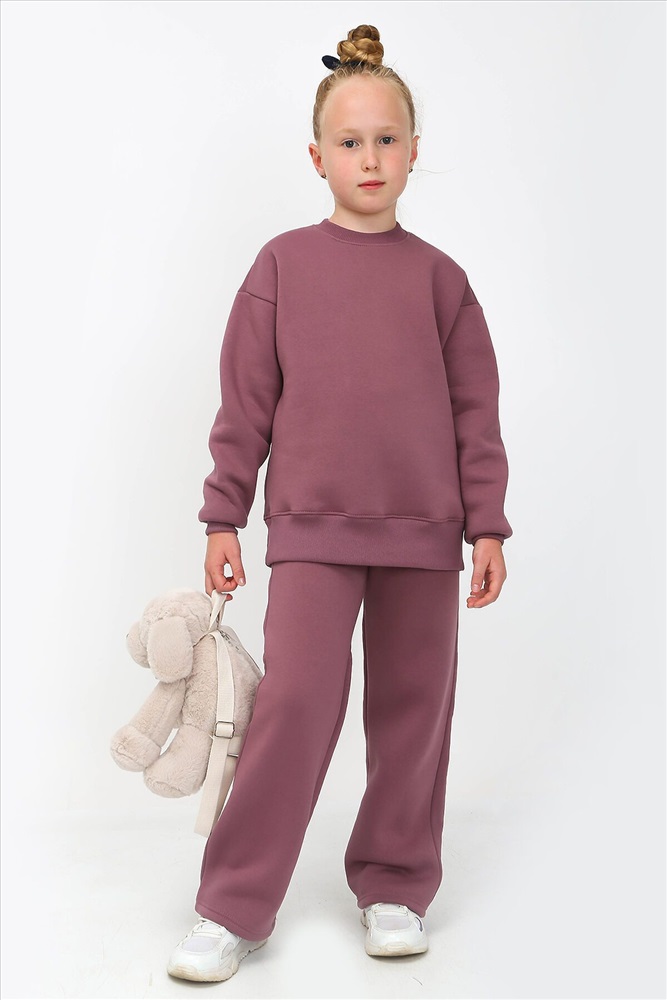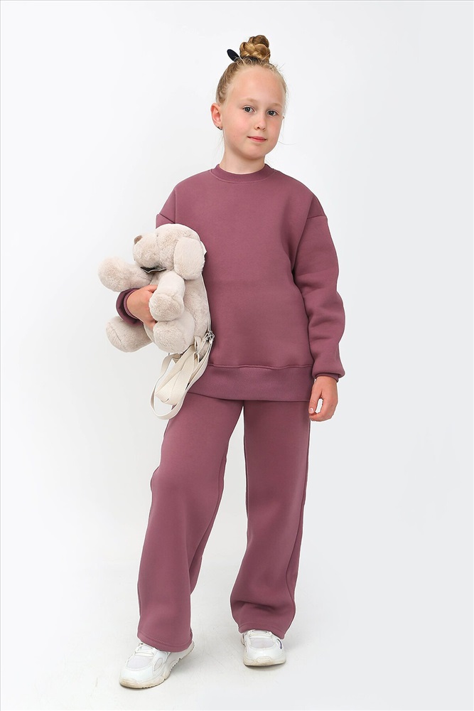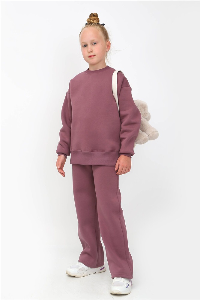 Костюм из толстой ткани с начесом. Джемпер свободного покроя, удлиненный, на широком поясе из кашкорсе. Рукав втачной, со спущенным плечом, на манжете. Брюки прямого кроя, свободные, на широком поясе. Ткань хорошо пропускает воздух и удерживает тепло.