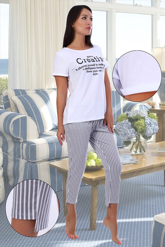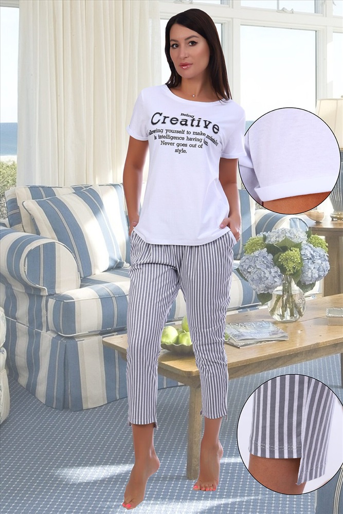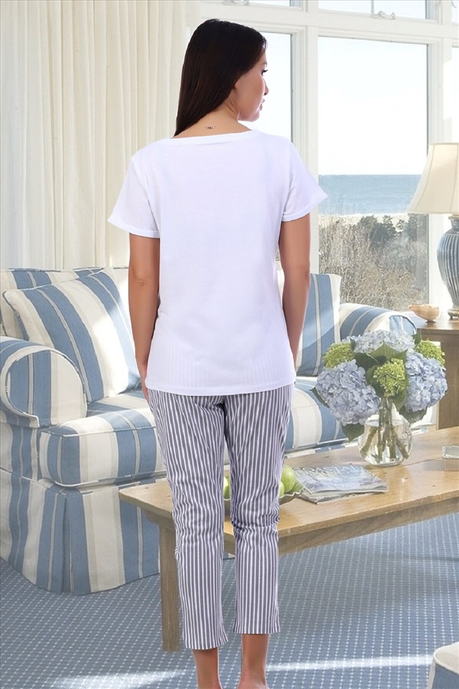 Страна производства: Россия Молодежный костюм, состоящий из футболки и брюк. Футболка с печатью на полочке, с коротким рукавом. Брюки 7/8 с прорезными карманами в боковых швах, задние половинки брюк чуть длиннее передних.