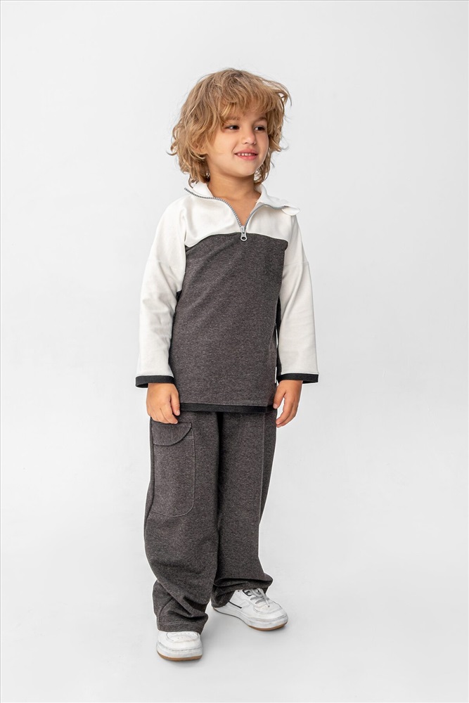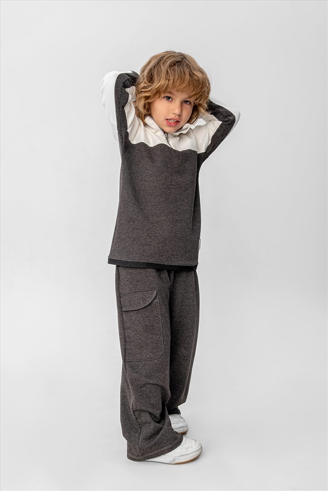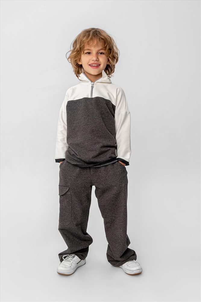 Костюм из футера двунитки. Свитшот и брюки. Свитшот дополнен нашитыми световозвращающими элементами. Брюки прямого кроя с боковыми карманами и накладным карманом на брючине. Легко стирается, не образует катышков, не линяет. Состав 90%хб, 10% п\э