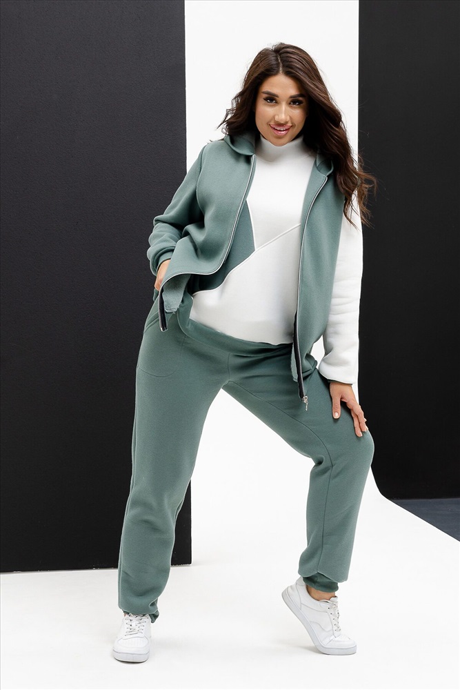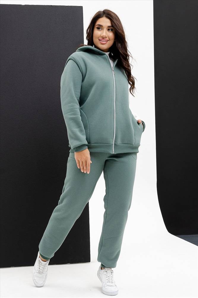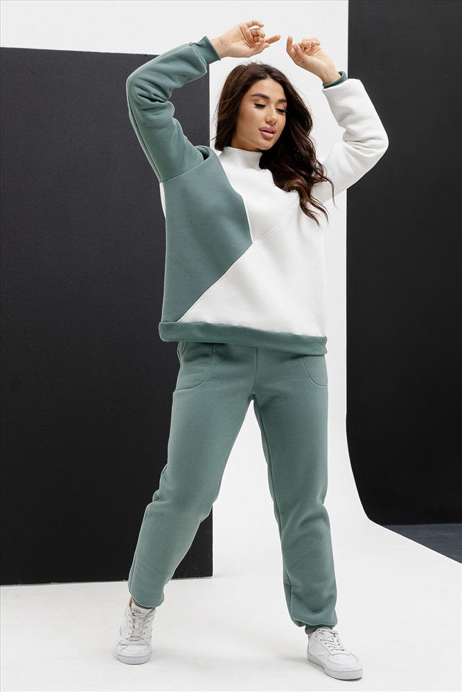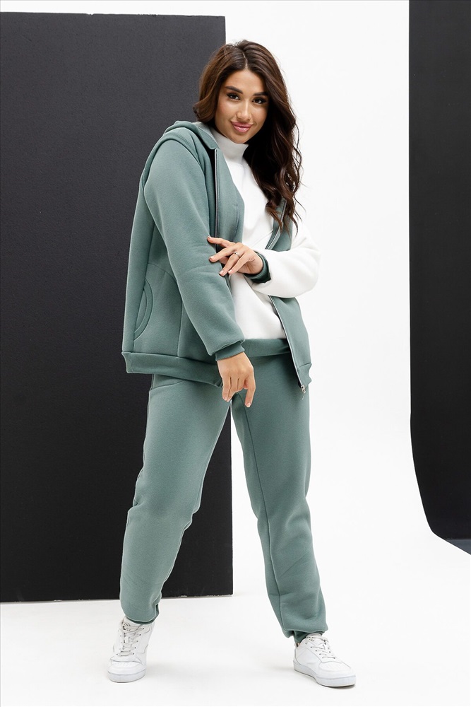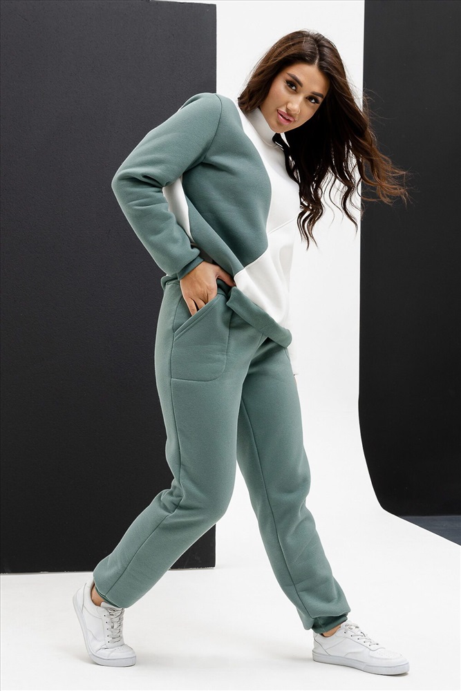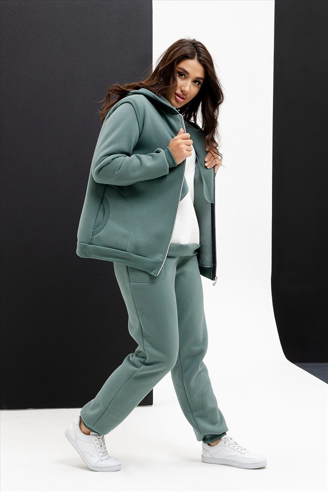 Костюм женский тройка: жилет, толстовка и брюки прямого силуэта. Жилет с капюшоном, застежка на тесьму-молнию, карман боковой с круглым входом. Обтачка капюшона, пройм, пояс жилета, брюк и толстовки, манжеты, воротник толстовки из кашкорсе. Брюки с манжетами и внутренними карманами на передней части брюк. Полочка толстовки состоит из трех частей, две из них и рукав из отделочной ткани.