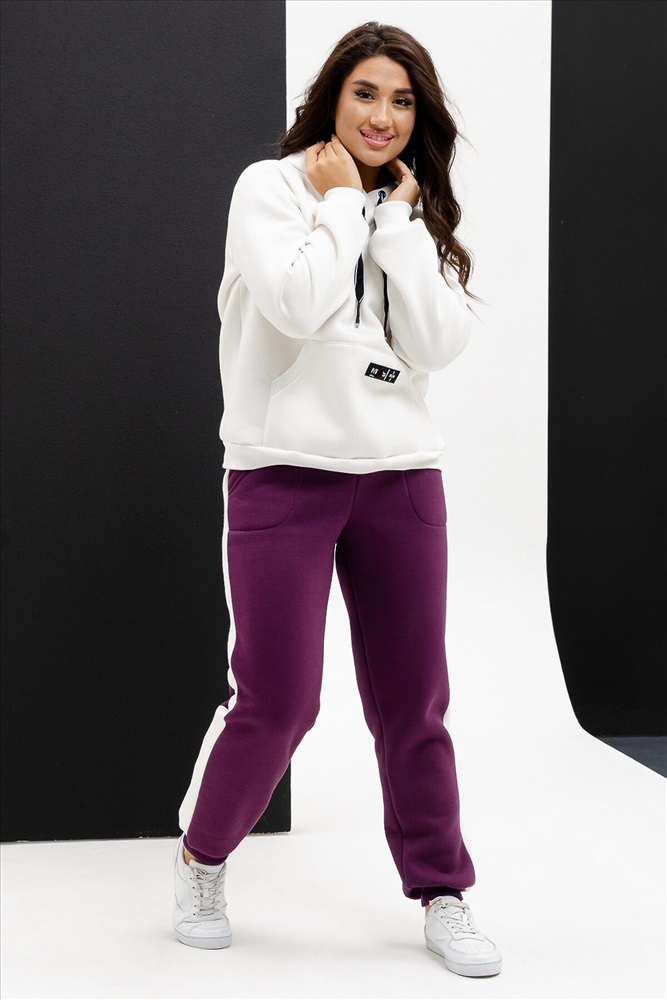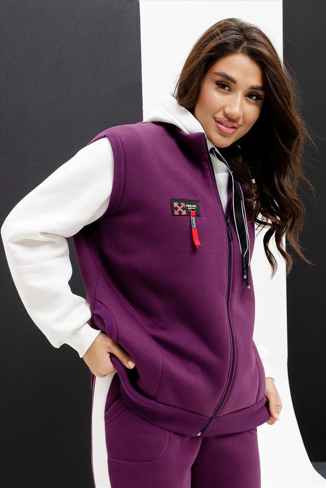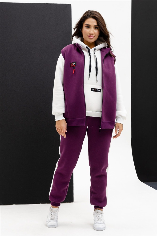 ID товара: 942649 Состав: Хлопок 66%; Полиэстер 34% Сезон: Демисезон Длина: Средняя Фасон: Свободный крой Рукав: длинные Вид застежки: Молния Крой брючин: Прямой Основная ткань: Хлопок Стиль: Повседневный Вид ткани: Футер 3-х нитка с начесом Страна бренда: Россия Страна производства: Россия Костюм женский тройка: Жилет, толстовка и брюки прямого силуэта. Жилет с воротником-стойкой, застежка на тесьму-молнию, карман боковой с круглым входом. Обтачка пройм, пояс жилета, брюк и толстовки, манжеты из кашкорсе. Брюки с манжетами, лампасами из отделочной ткани и внутренними карманами на передней части брюк. Толстовка прямого силуэта с капюшоном из отделочной ткани, карман кенгуру. На правой полочке жилета и кармане толстовки модные нашивки. Комментарии к товару