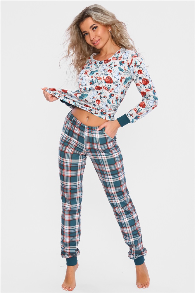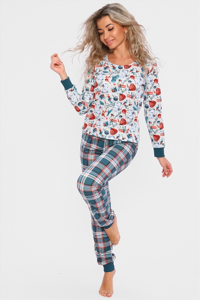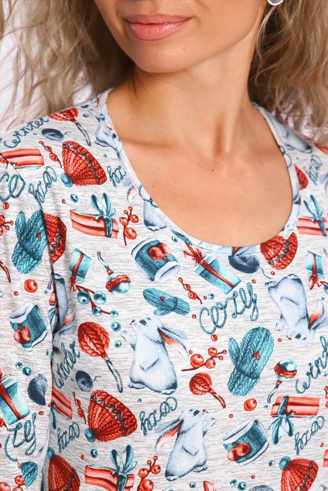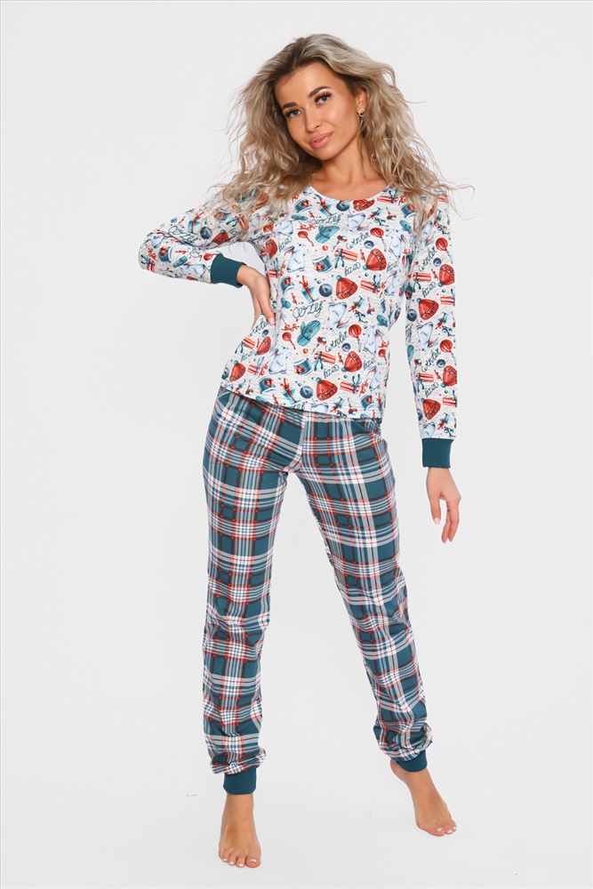 Застежка: без застежки Домашний костюм с НОВОГОДНИМ принтом, состоит из футболки с длинным рукавом (длина рукава указана от горловины) и брюк с карманами в боковых швах, все манжеты на костюме выполнены из плотной резинки - кашкорсе. Стильный домашний комплект двойка имеет натуральный состав 100% хлопок, удобная и практичная одежда для дома . Ночной костюм идеально подойдёт для дома, отдыха и сна, пижамной вечеринки ,подарок на Новый год, 8 марта.