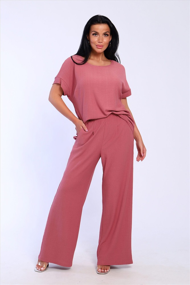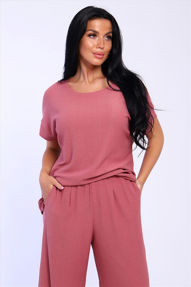 Брюки палаццо и футболка со спущенной проймой и с круглым вырезом горловины из тонкого, струящего материала - жатка. Такой красивый модный костюм не оставит равнодушной ни одну модницу. Вещи представлены стандартных и больших размеров для дам с пышными формами. Расклешенные брючки с завышенной талией на резинке с карманами отличаются удобным кроем, они стандартной длины и превосходно садятся по фигуре женщин, визуально удлиняют ноги и придают силуэту идеальные очертания. Благодаря наличию нагрудных вытачек футболка идеально садиться по фигуре.
