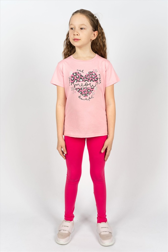 Страна производства: Россия Яркий комплект для девочки, состоящий из футболки и лосин. Выразительный принт с глиттером в виде сердца в сочетании с нежными цветом одежды не оставит никого равнодушным! Футболка для девочки прямого силуэта с втачным коротким рукавом. Горловина круглая, обработана воротником из кулирки. Низ изделия и рукавов обработан швом в подгибку. Лосины для девочки прилегающего силуэта. Пояс цельнокроенный, с эластичной тесьмой внутри, закрепленной в шов. Низ лосин обработан швом в подгибку.