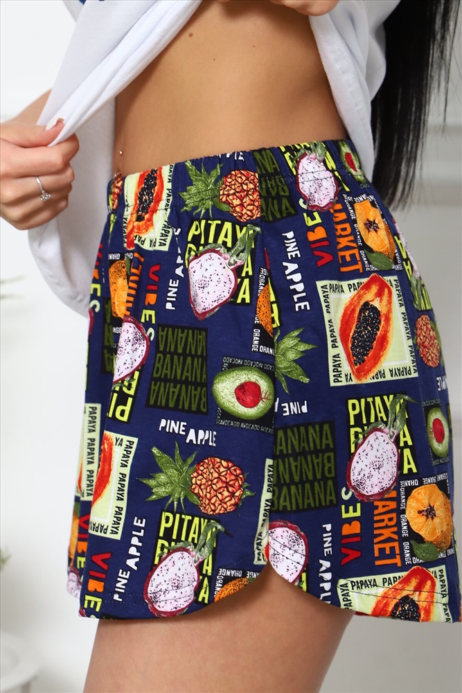 Костюм женский, выполнен из трикотажного полотна кулирка. Костюм состоит из футболки и шорт. Футболка свободного силуэта, горловина окантована, на полочке выполнена печать.