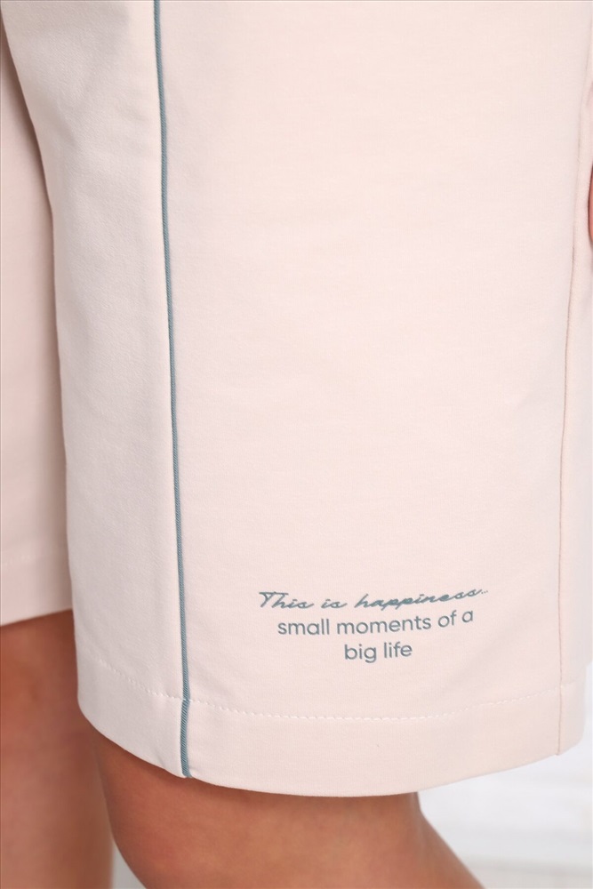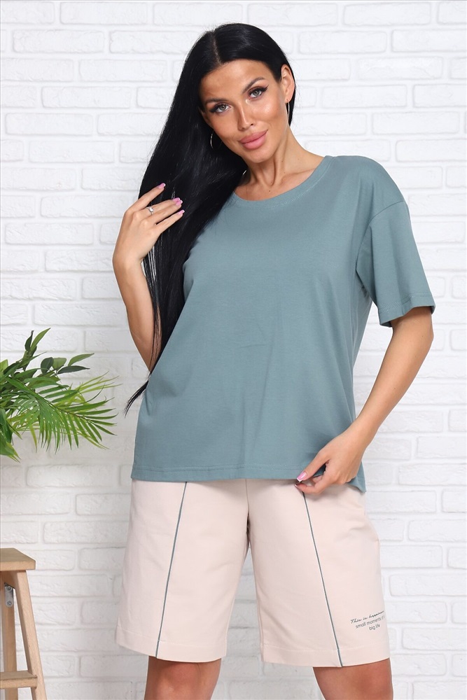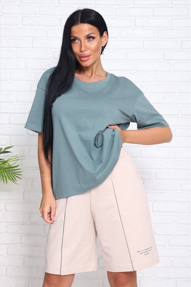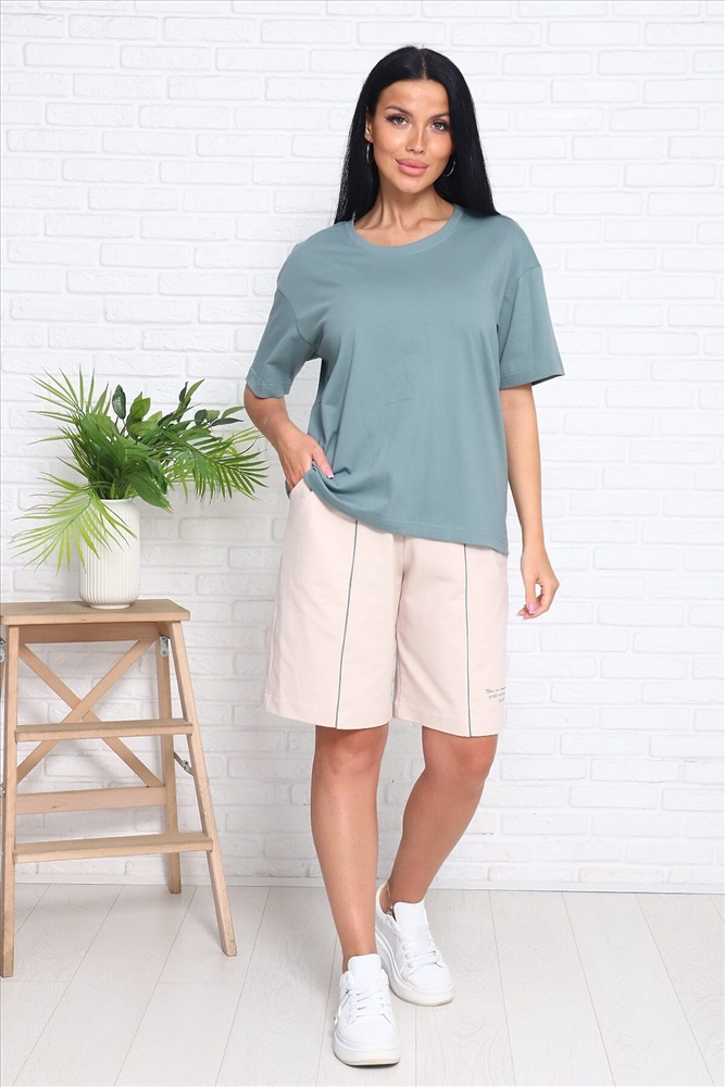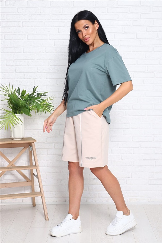 Костюм женский с шортами: футболка (кулирка) с коротким рукавом, спущенное плечо, шорты (футер 2-х нитка) с кантом спереди, с принтом и боковыми карманами. Актуальный силуэт, благородная расцветка и комфортные материалы.