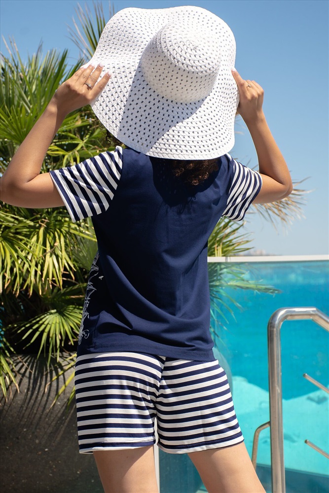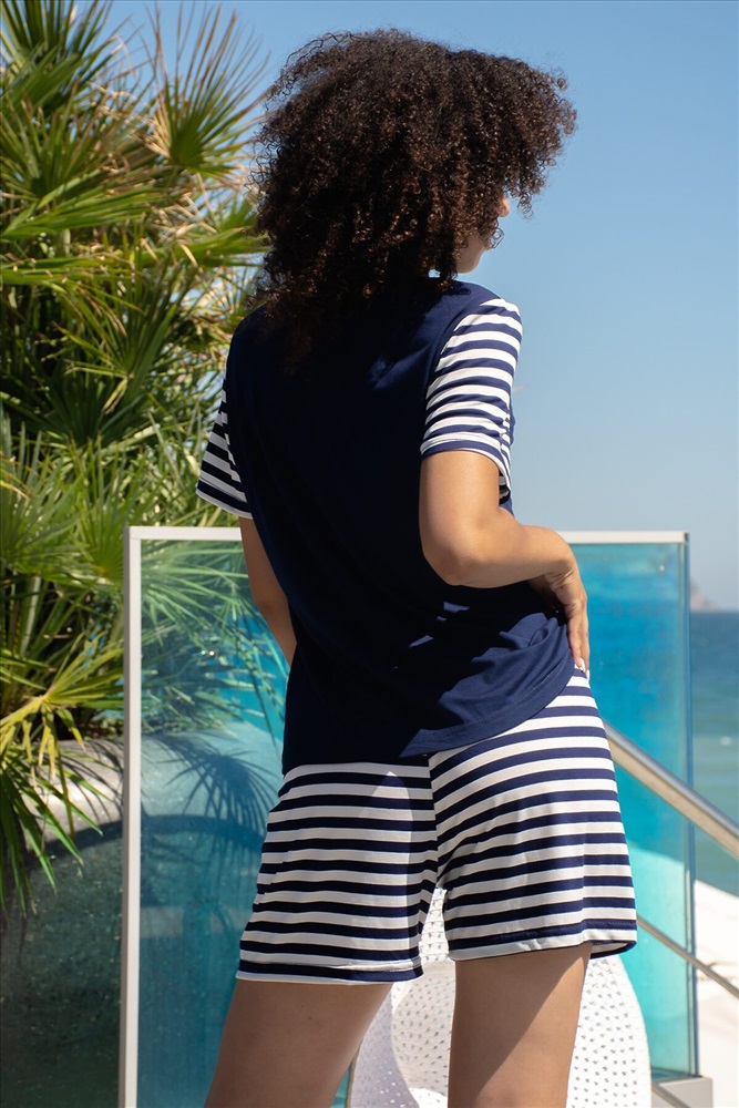 ID товара: 883315 Состав: 55% Вискоза, 40% Полиэстер, 5% Лайкра Сезон: Весна/Лето Фасон: Прямой Рукав: Короткие Крой брючин: Прямой Рисунок: Полоска Основная ткань: Вискоза Страна бренда: Россия Страна производства: Россия Если вам хочется чего-то полосатого и необычного, обратите внимание на модный костюм с полосатыми шортами! Отличное решение для лета. Выполнен из вискозы. На полочке - печать. Оригинальный крой футболки Комментарии к товару