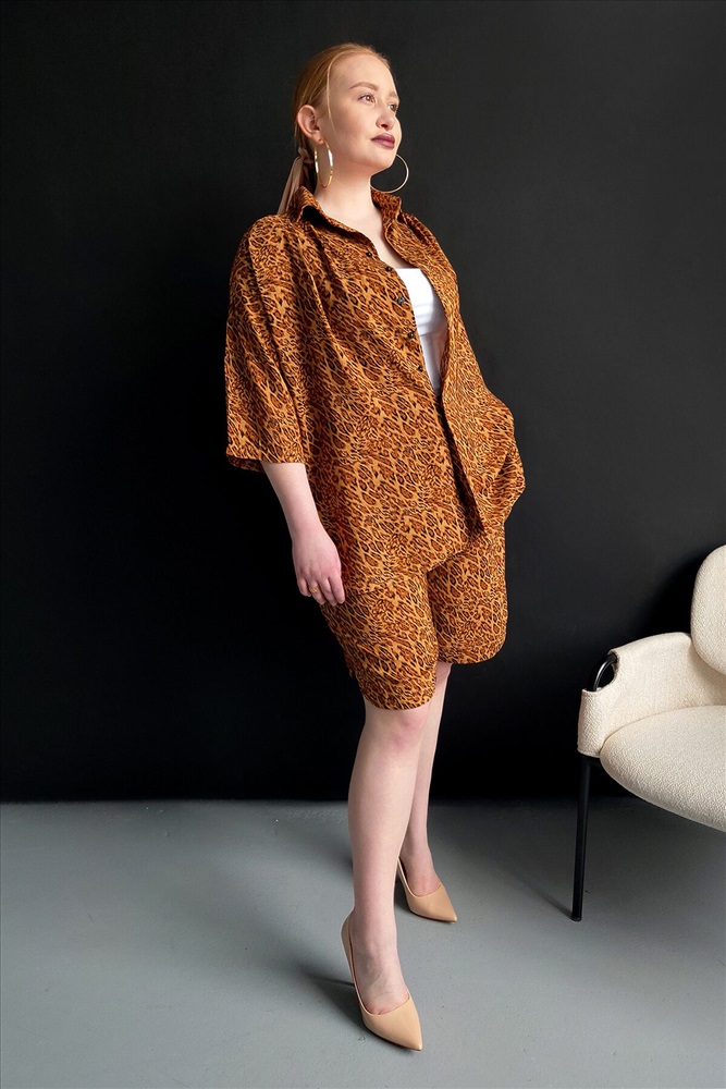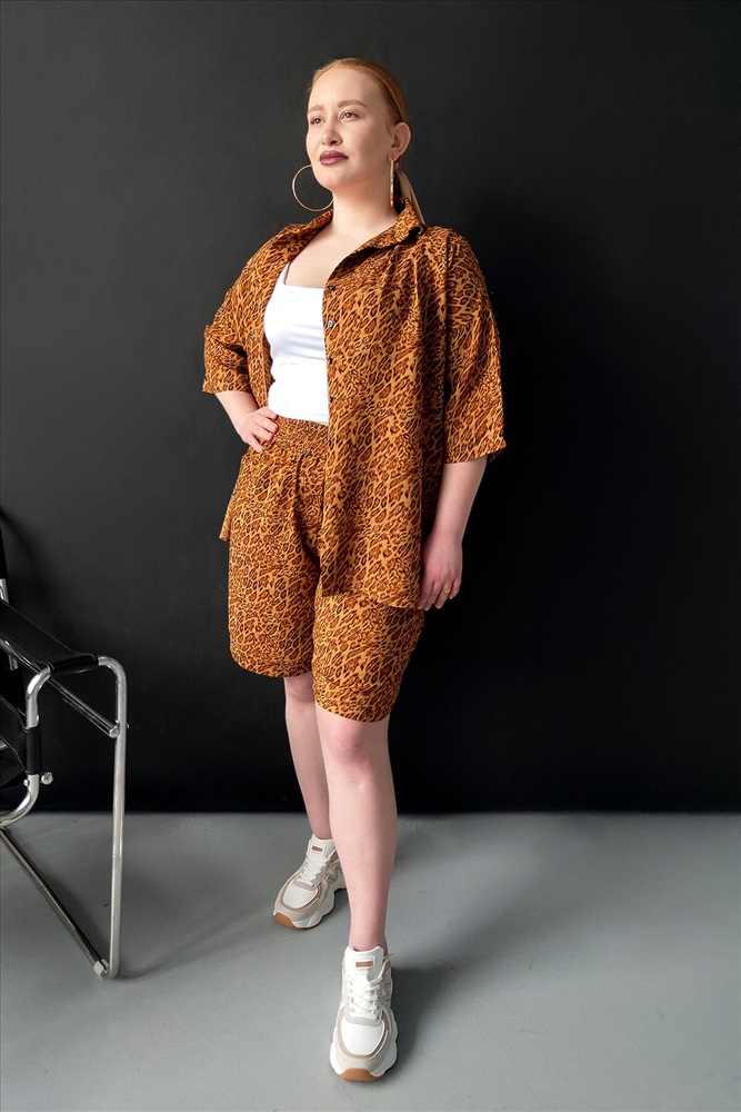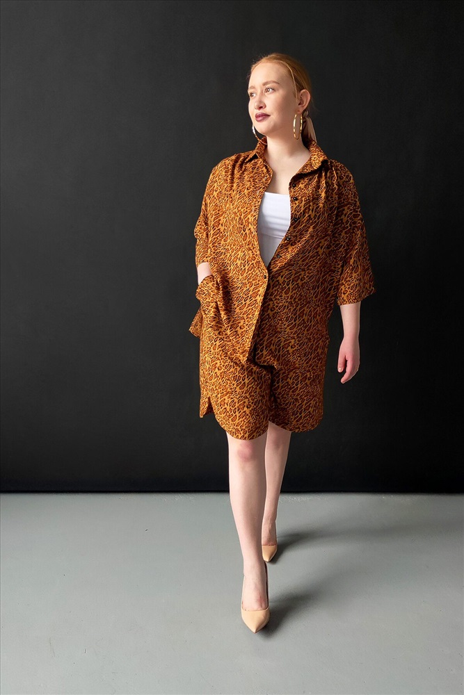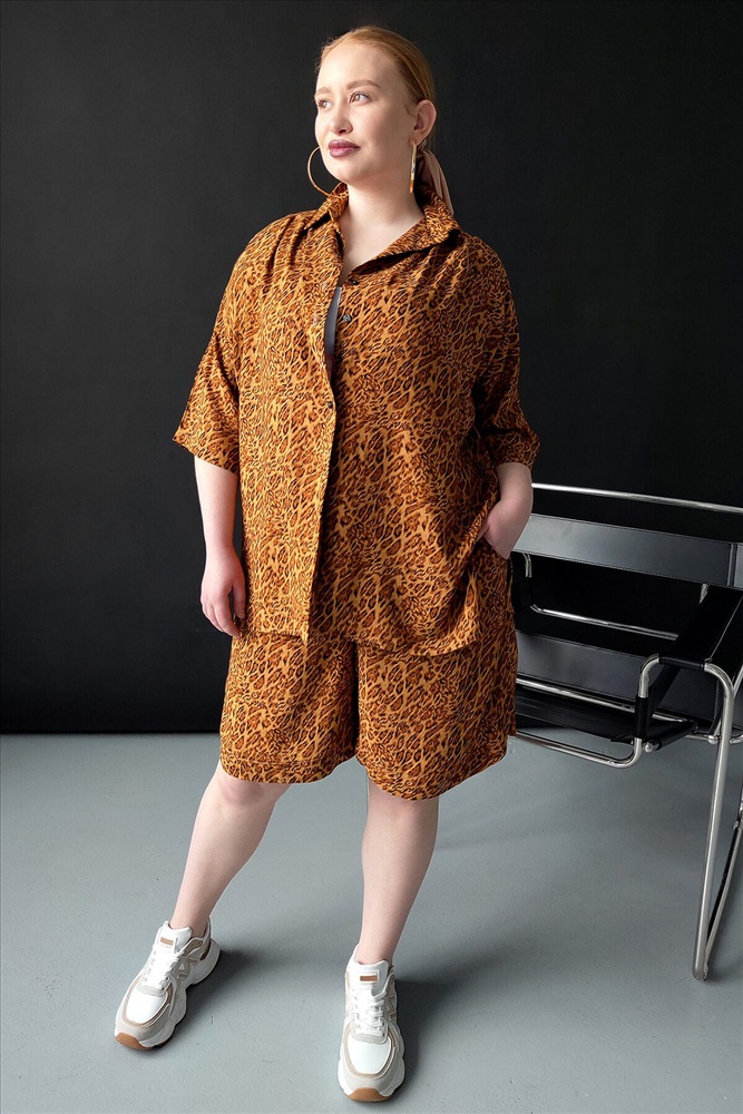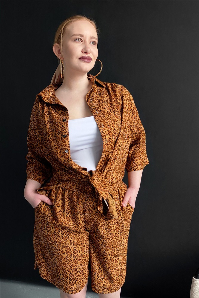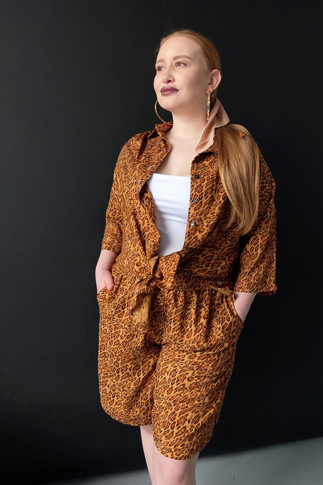 ID товара: 981297 Состав: Вискоза 100% Сезон: Весна/Лето Длина: Средняя Фасон: Свободный крой Рукав: Ниже локтя Вид застежки: Пуговица Крой брючин: Прямой Рисунок: леопардовый Тип карманов: В шве Декоративные элементы: Принт Стиль: повседневный Вид ткани: Вискоза Страна бренда: Россия Страна производства: Россия Костюм летний женский представляет собой комплект - шорты и рубашка, который станет отличным дополнением вашего гардероба. Данная модель выполнена из штапеля (100 % вискоза). Ткань, из которой выполнен костюм летний, не мнётся, быстро сохнет и не садится при стирке. Приобретая данный летний женский костюм, вы получаете не только полноценный образ, но и два отдельных элемента одежды. Мы уверены, что летний женский костюм топ станет вашим любимым этим летом! Комментарии к товару