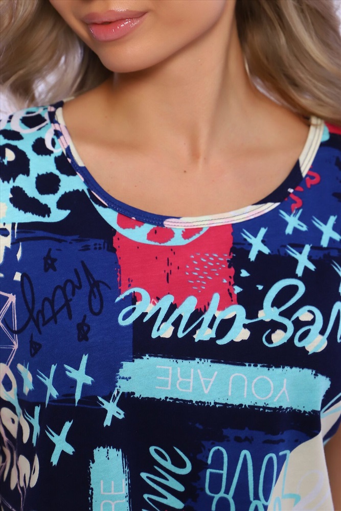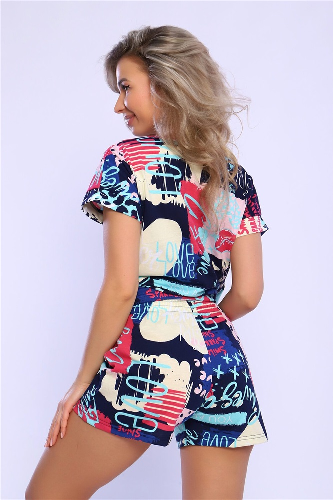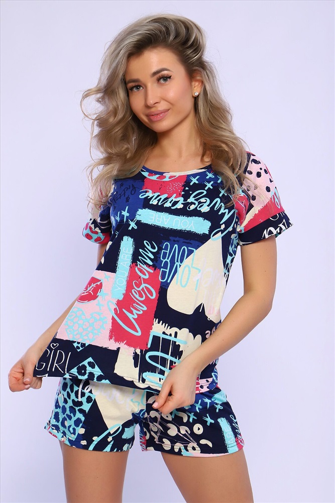 ID товара: 978350 Состав: 100% Хлопок Сезон: Весна/Лето Длина: Средняя Фасон: Полуприлегающий Рукав: короткие Крой брючин: Прямой Рисунок: Абстракция Декоративные элементы: Принт Основная ткань: Хлопок Стиль: повседневный Вид ткани: Кулирка Страна бренда: Россия Страна производства: Россия Костюм состоит из футболки и шорт. Футболка свободного кроя с манжетами на спущенном плече. Комментарии к товару