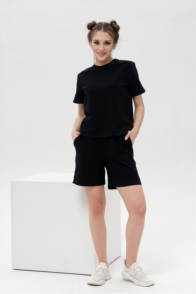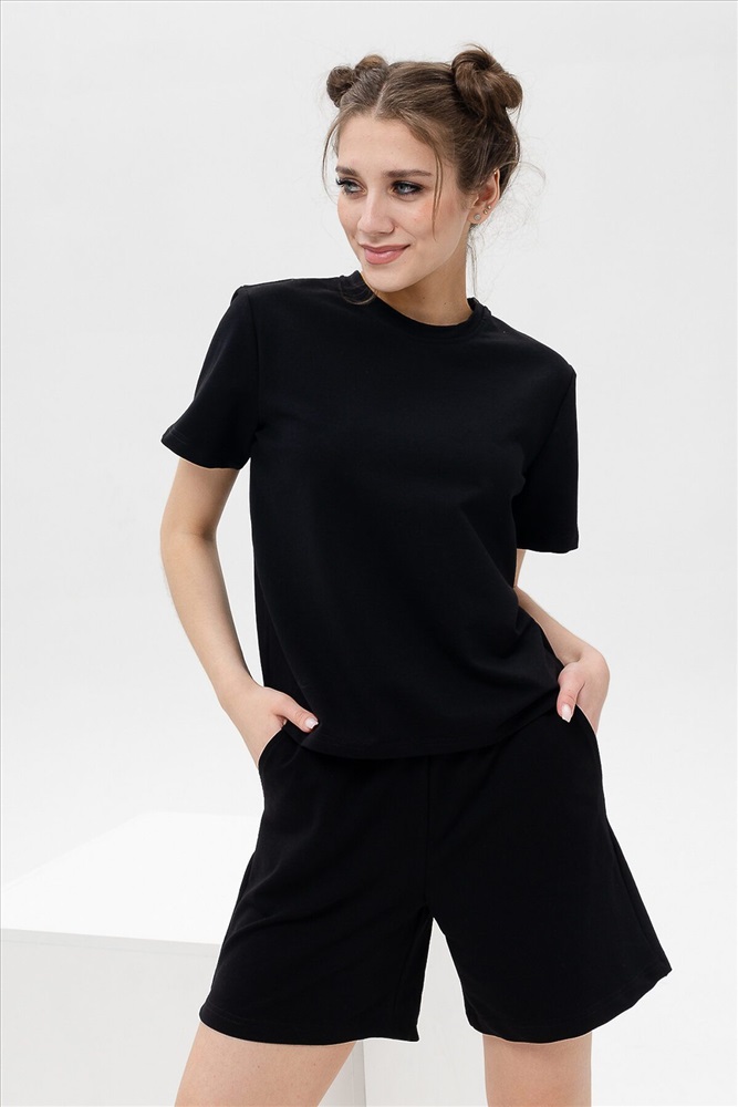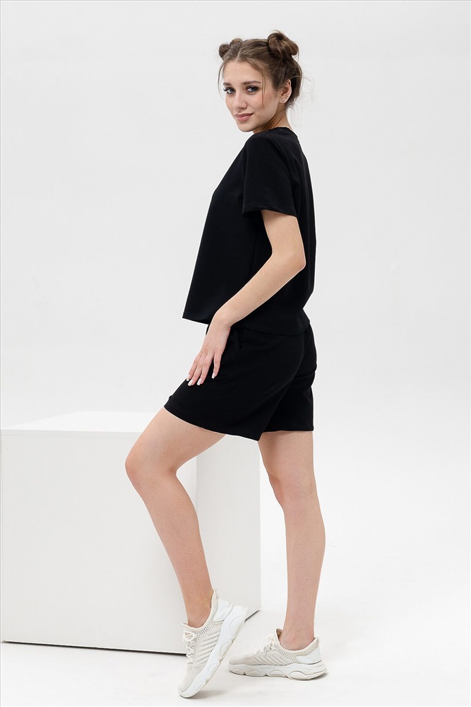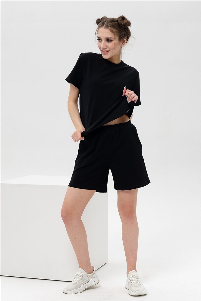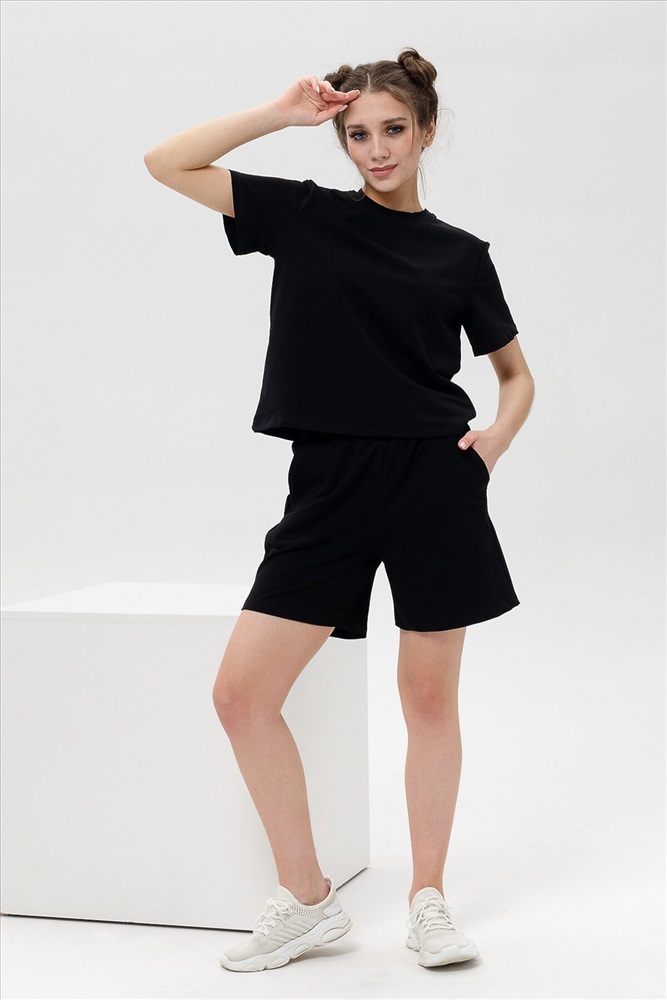 СПЕЦЗАКАЗ Женский костюм из футболки с шортами. Верх: однотонная футболка с коротким рукавом. Комфортная футболка для дома и занятий спортом. Актуальный крой и трендовые расцветки модели делают её универсальной для летнего гардероба. Низ: Шорты свободного покроя с карманами. Костюм спортивный в приятных модных расцветках. Комплект будет идеально смотреться как домашний и как спортивный на летний сезон. Костюм сшит из футера. Это износостойкая, приятная на ощупь, мягкая ткань из натурального хлопка. За ней легко ухаживать.