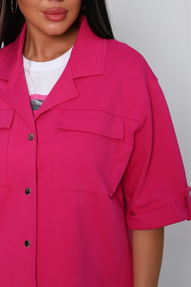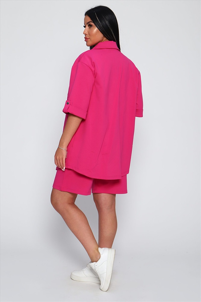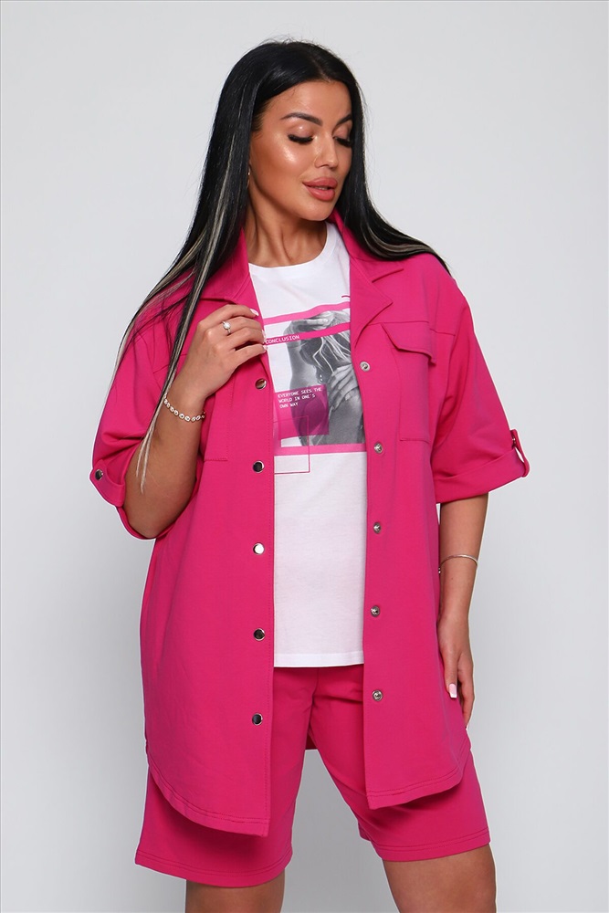 Костюм женский из футера 2-х нитки. Костюм состоит из рубашки и шорт. Рубашка свободного покроя с лацканами, застежка на кнопки. На полочке кокетки и два накладных кармана. Низ фигурный. Шорты свободного покроя на притачном поясе, с боковыми карманами.