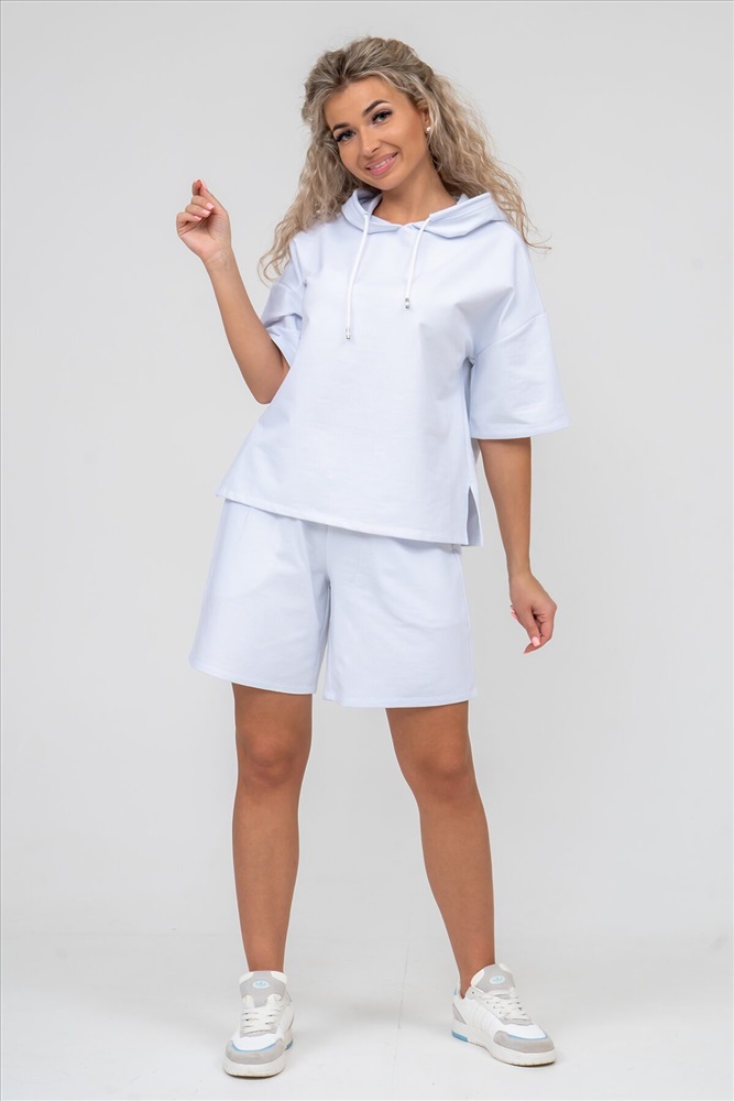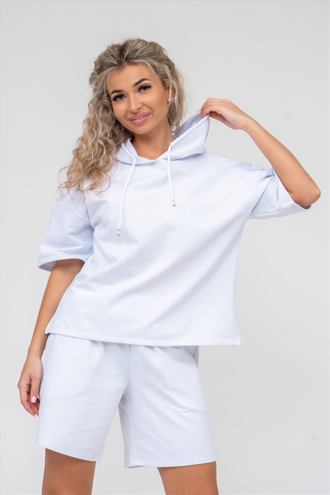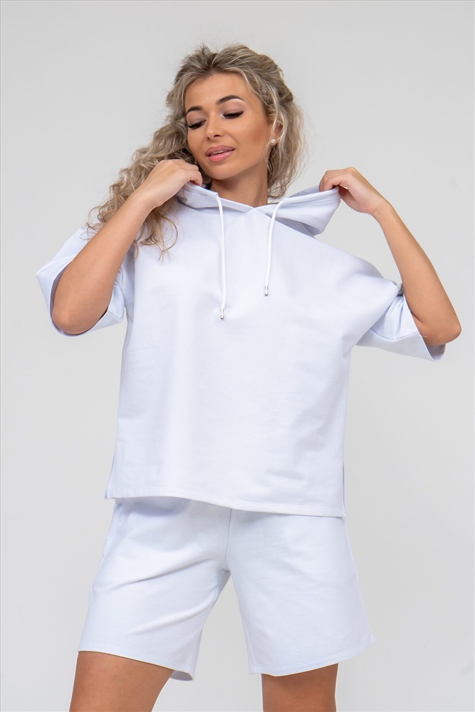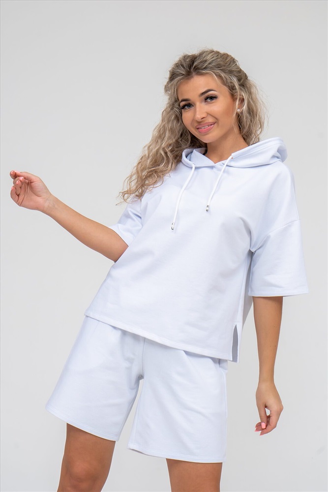 Женский костюм 2-ка выполнен из футера высокого качества с хлопком и небольшим добавлением полиэстера и лайкры, что позволяет изделию не скатываться и оставлять идеальный внешний вид на долгое время. Костюм состоит из толстовки и шорт. Толстовка с капюшоном и шнурком. Линия плеча спущена, рукав укороченный, по бокам имеются небольшие разрезы. Свободный крой прекрасно будет смотреться на дамах с любыми формами. Костюм такого плана представлен в широкой размерной сетке, что позволяет выбрать его как девушке, так и женщине. Однотонный костюм модных расцветок будет удачным выбором для поездок в отпуск, на пикник, для активного отдыха и прогулок по городу. Будет гармонично сочетаться как с кроссовками, так и с туфлями, балетками или босоножками. Используя эту модель в качестве домашнего костюма, Вы поймёте, что это именно тот самый идеальный вариант, в котором вы будете себя чувствовать удобно, комфортно и современно. Костюм с шортами - это настоящая находка для тех, кто ценит свою индивидуальность! Ориентируясь по таблице замеров, обратите внимание, что замеры длины рукава проводились от точки основания шеи.
