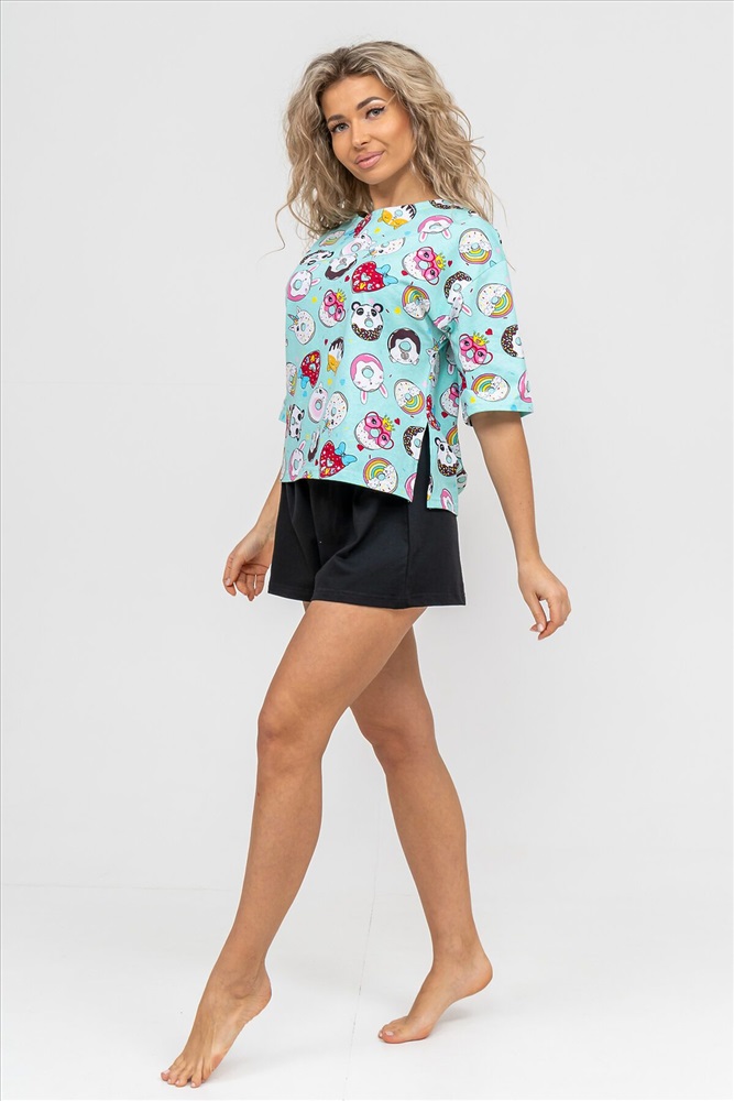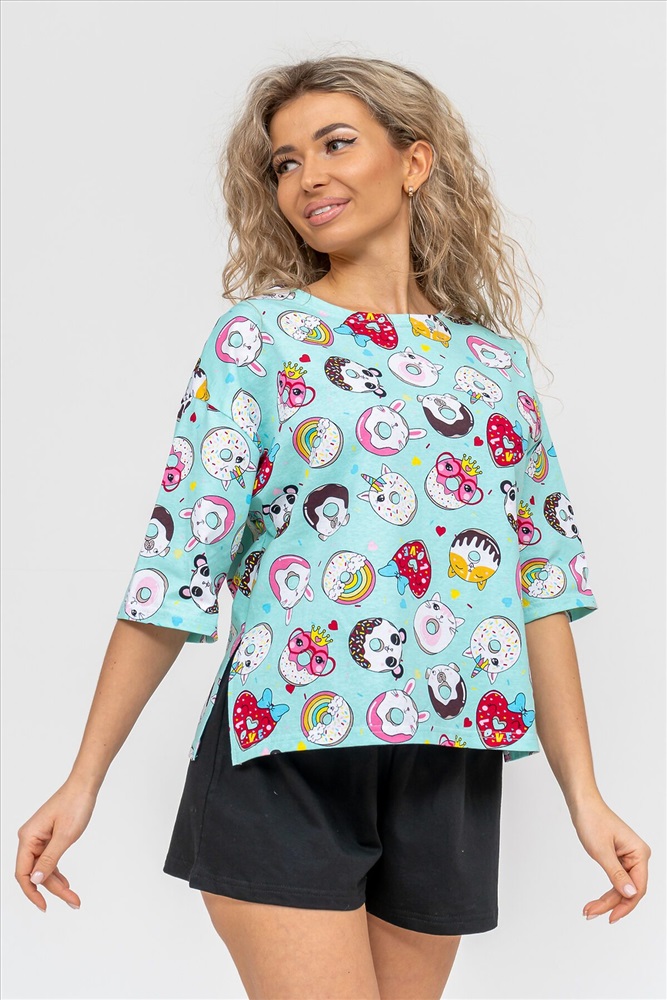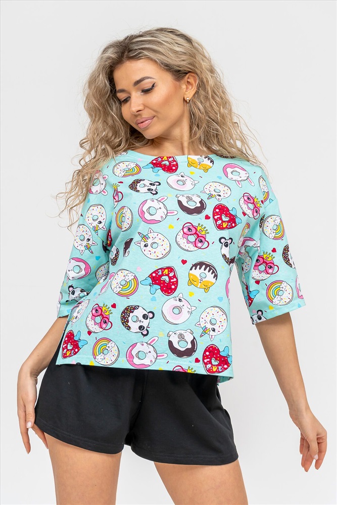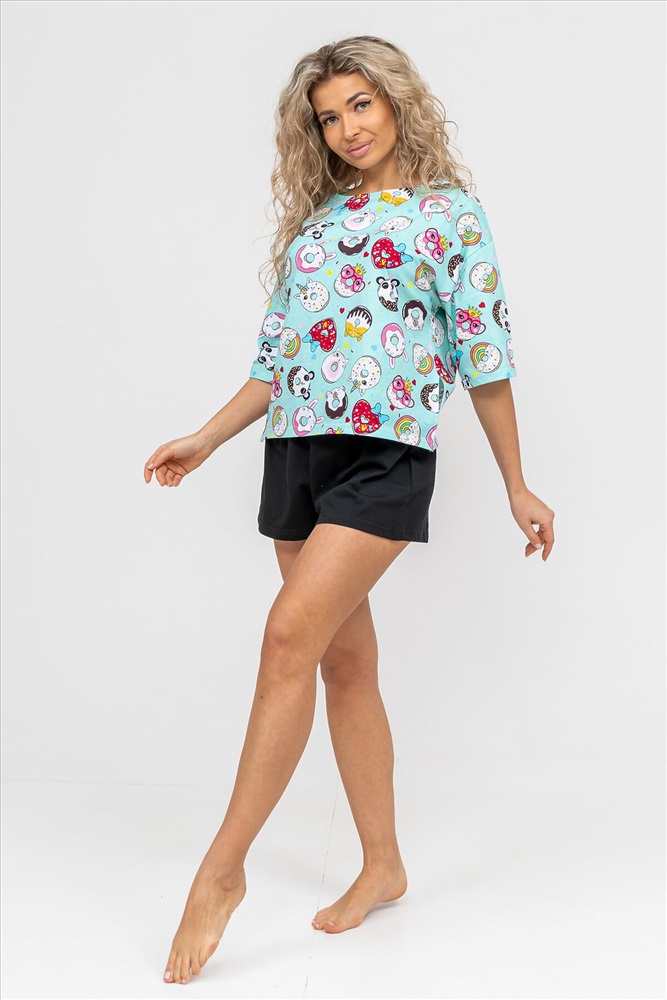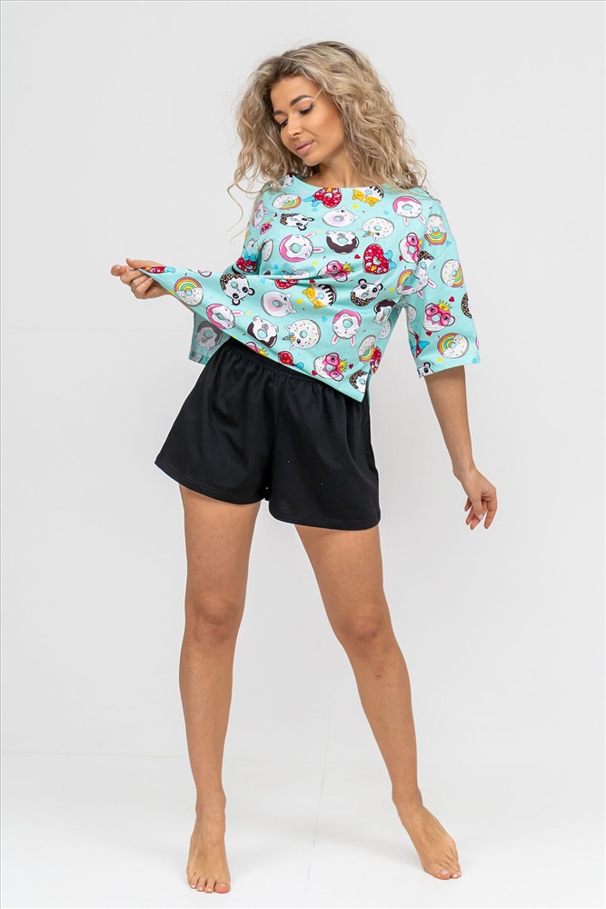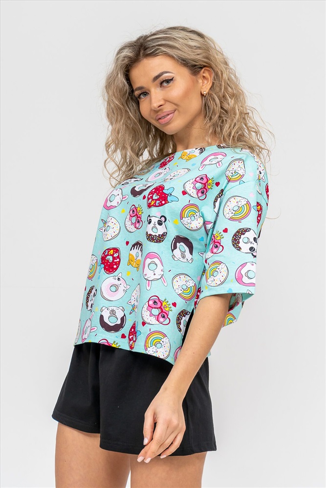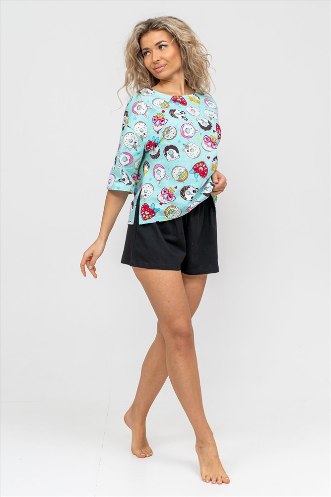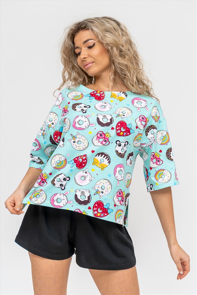 Женский модный костюм - это невероятно удобный вариант одежды для дома, сна, отдыха или пижамной вечеринки. Домашний костюм двойка сшит из натурального хлопка, лёгкого и приятного материала. Пижама состоит из свободной футболки с новым трендовым дизайном ткани и свободных шорт. Стильный костюм комфортно садится по фигуре, выглядит женственно и привлекательно, очаровывая всех. А также модель такого плана - это отличная идея для полезного и практичного подарка на день рождения, 14 февраля, 8 марта и любой другой праздник. Мы уверены, что эта хлопковая пижама подарит Вам истинное наслаждение при каждодневном использовании. Выбирайте деликатный способ стирки при температуре 30С, тогда домашний комплект прослужит долго. Ориентируясь по таблице замеров, обратите внимание, что замеры длины рукава проводились от точки основания шеи.