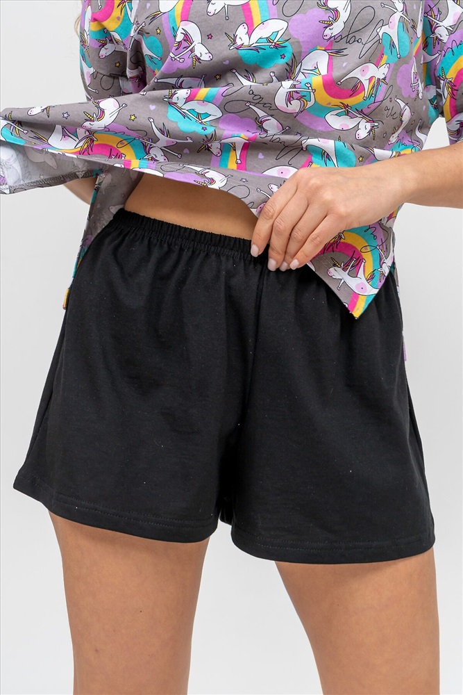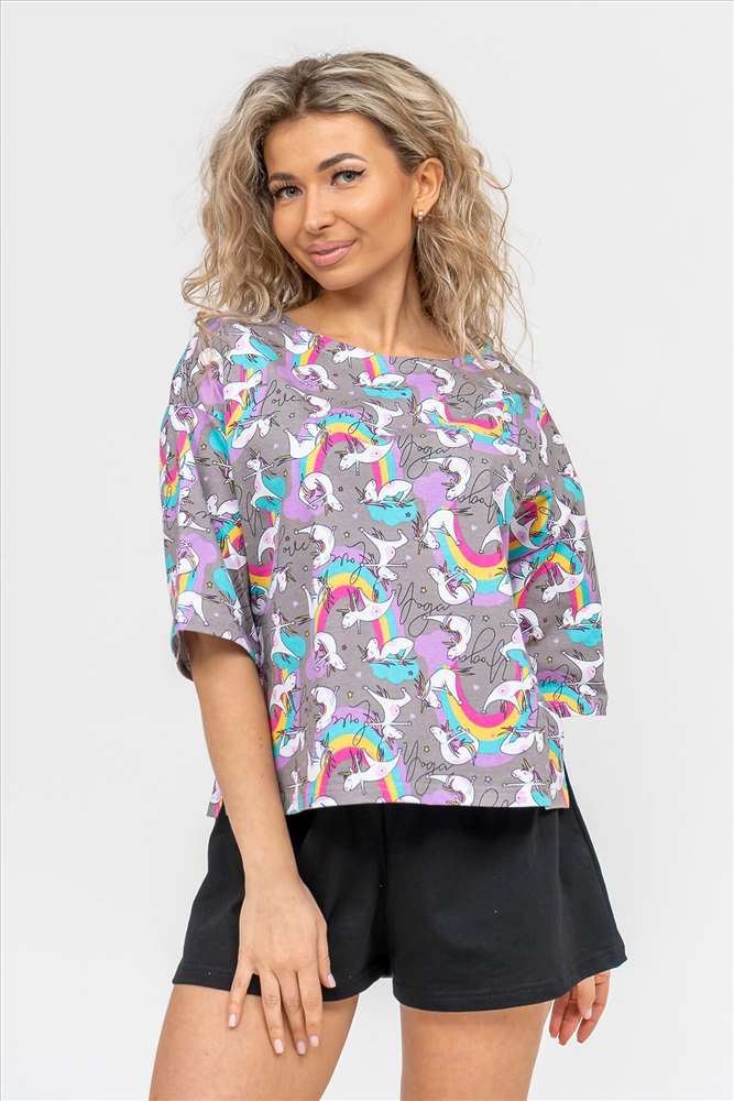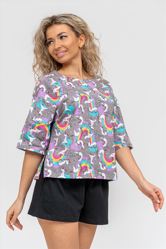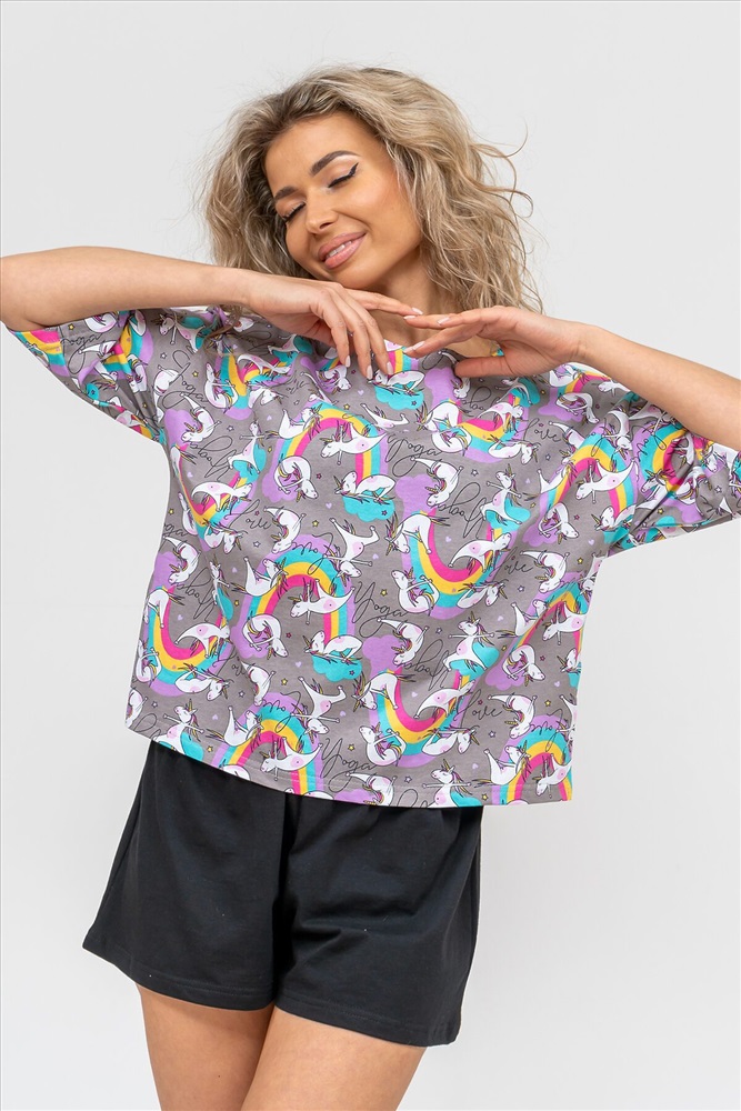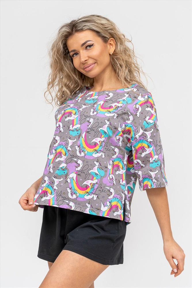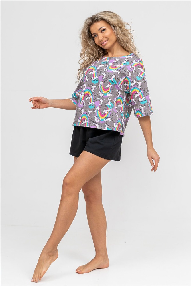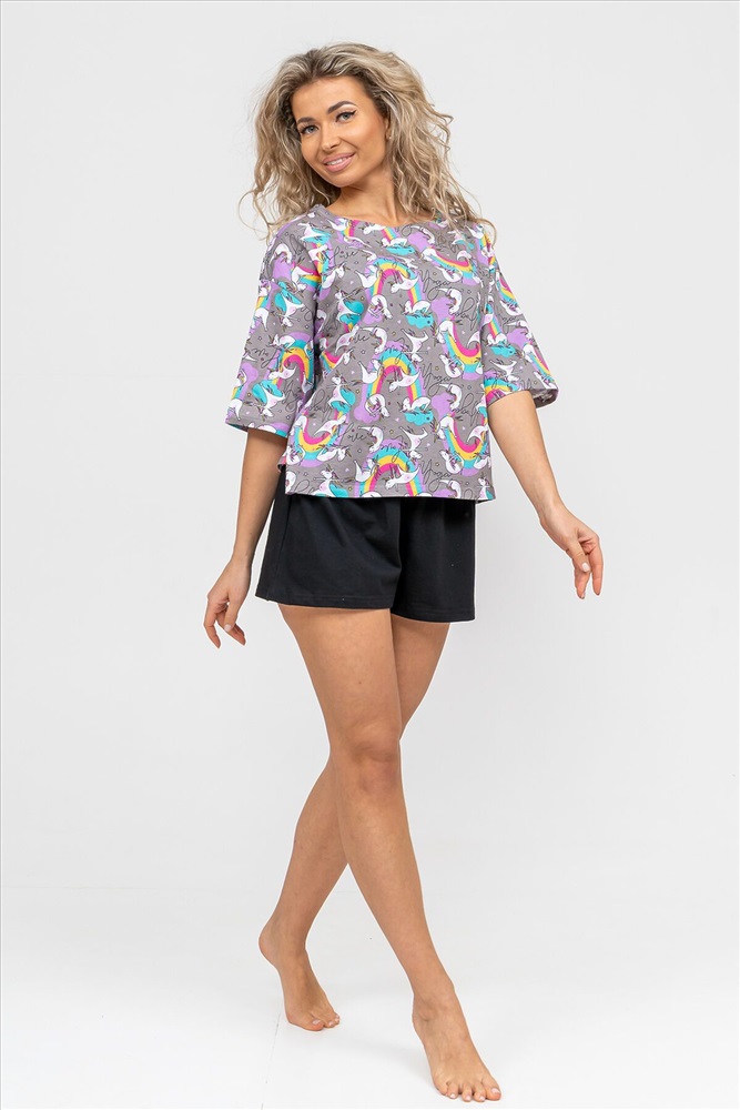 ID товара: 978776 Состав: 100% Хлопок Сезон: Демисезон Длина: Средняя Фасон: Свободный Рукав: короткие Крой брючин: Широкий Рисунок: Фантазийный Декоративные элементы: Принт Основная ткань: Хлопок Вид ткани: Кулирка Страна бренда: Россия Страна производства: Россия Женский модный костюм - это невероятно удобный вариант одежды для дома, сна, отдыха или пижамной вечеринки. Домашний костюм двойка сшит из натурального хлопка, лёгкого и приятного материала. Пижама состоит из свободной футболки с новым трендовым дизайном ткани и свободных шорт. Стильный костюм комфортно садится по фигуре, выглядит женственно и привлекательно, очаровывая всех. А также модель такого плана - это отличная идея для полезного и практичного подарка на день рождения, 14 февраля, 8 марта и любой другой праздник. Мы уверены, что эта хлопковая пижама подарит Вам истинное наслаждение при каждодневном использовании. Выбирайте деликатный способ стирки при температуре 30С, тогда домашний комплект прослужит долго. Ориентируясь по таблице замеров, обратите внимание, что замеры длины рукава проводились от точки основания шеи. Комментарии к товару