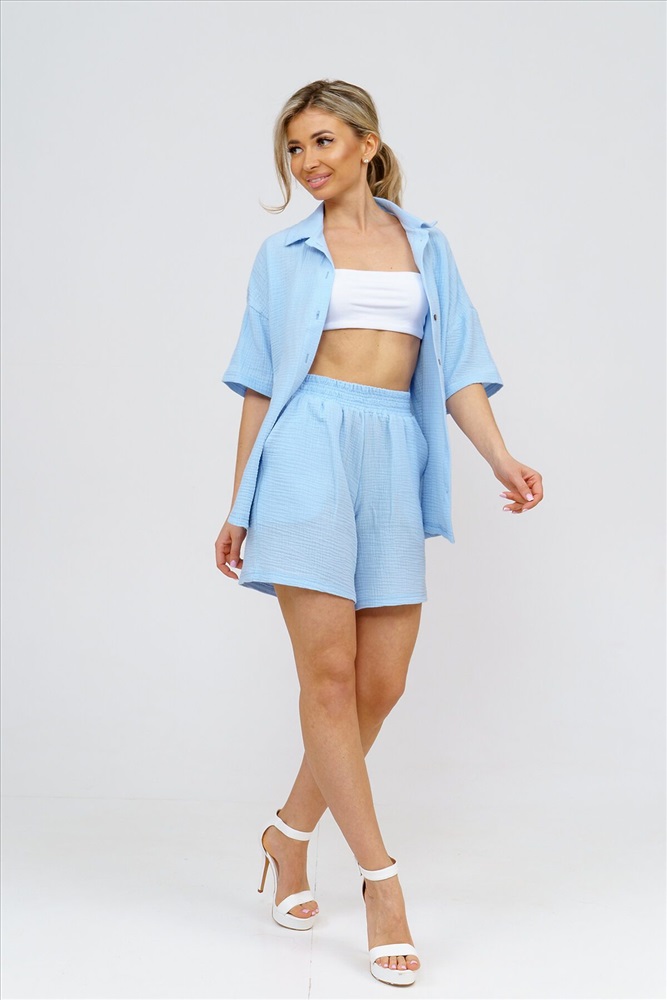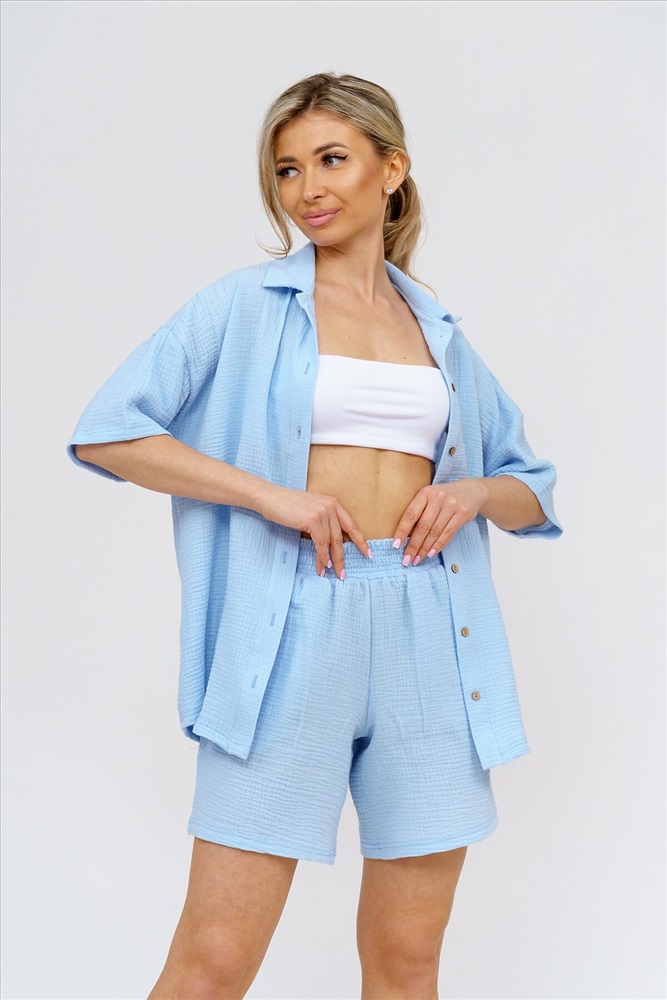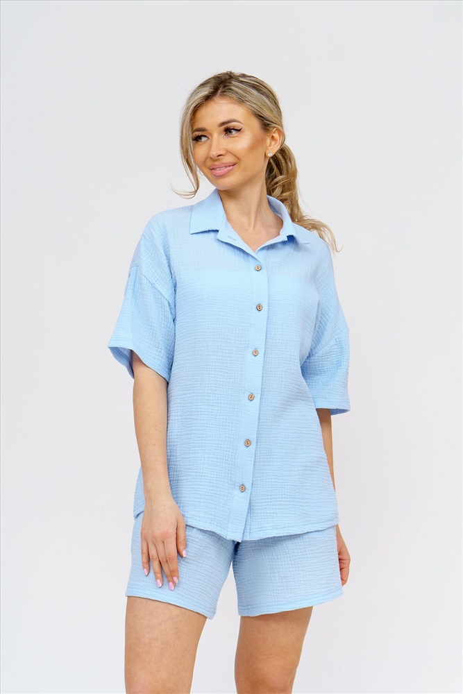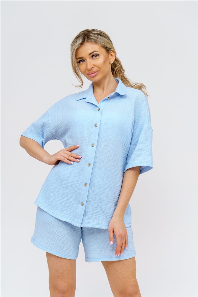 ID товара: 1003189 Состав: 100% Хлопок Сезон: Весна/Лето Фасон: Прямой Рукав: Короткие Вид застежки: Пуговицы Крой брючин: Прямой Вид ткани: Муслин Страна бренда: Россия Страна производства: Россия Модный костюм в стиле oversize выполнен из воздушного и приятного к телу 2-х слойного жатого муслина. Это одна из самых модных и популярных моделей сезона. Рубашка имеет слегка удлинённую спинку, спущенную линию плечевого шва, укороченный рукав, классический рубашечный воротник и планку на пуговках. Шорты бермуды с высокой посадкой создадут модный образ для любой девушки. Пояс шорт выполнен на специализированной поясной машине, что добавляет изделию большую износостойкость и эстетический внешний вид. По бокам, для удобства, расположены вместительные карманы. Изделие из муслина имеет много положительных качеств: нежность и лёгкость, высокая прочность и воздухопроницаемость. А модные цвета этого лета добавляют законченность деталям и определяют must have сезона. За счёт свободного фасона костюм можно носить с любым типом фигуры, отлично подойдёт для беременных женщин, а также кормящих мам. Женская хлопковый костюм идеален как для лета, так и для прохладного вечера. С помощью такого костюма Вы можете создать любой образ. А также отправиться на праздник, вечеринку или на прогулку, на пляж или провести незабываемый вечер дома. Модель такого плана идеально подойдёт и в качестве подарка для себя и своих любимых! Стирать муслиновые вещи нужно только в теплой воде при температуре не выше 40С. У нас Вы также можете приобрести только рубашку из такого материала- модель 36766 и создать свой неповторимый образ! Ориентируясь по таблице замеров, обратите внимание, что замеры длины рукава проводились от точки основания шеи. Комментарии к товару