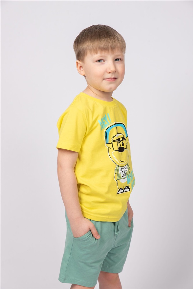 Страна производства: Россия Комплект для мальчика, состоящий из футболки и шорт выполнен из 100% хлопка. Футболка для мальчика прямого силуэта, с втачным коротким рукавом. Благодаря эластичной горловине, выполненной из рибаны, футболку удобно снимать и надевать. На полочке принт Шелкография. Надпись переводится как Хэй!; Что случилось?. по поясу шорт вставлен плоский утягивающий шнурок в цвет шорт, низ шнурка подвернут и застрочен. Длина шнурка = длина пояса + 45 см для возможности завязывания. На передней половинке шорт карманы с отрезным бочком, вход в карман обработан строчкой.